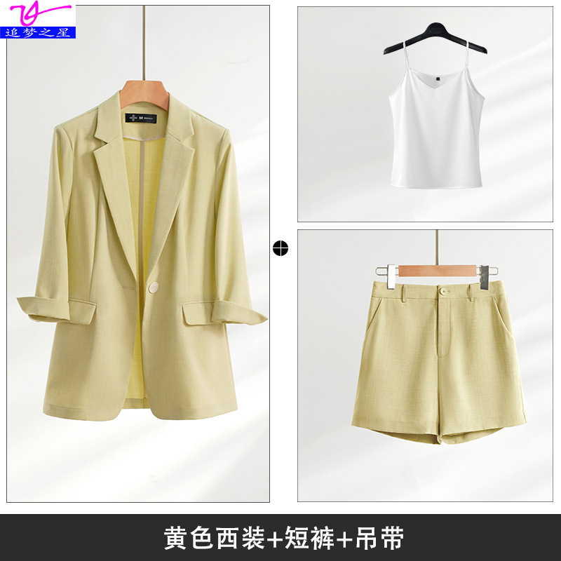 • 2J247 노란색 세트 자른 바지 흰색 V 넥 슬링