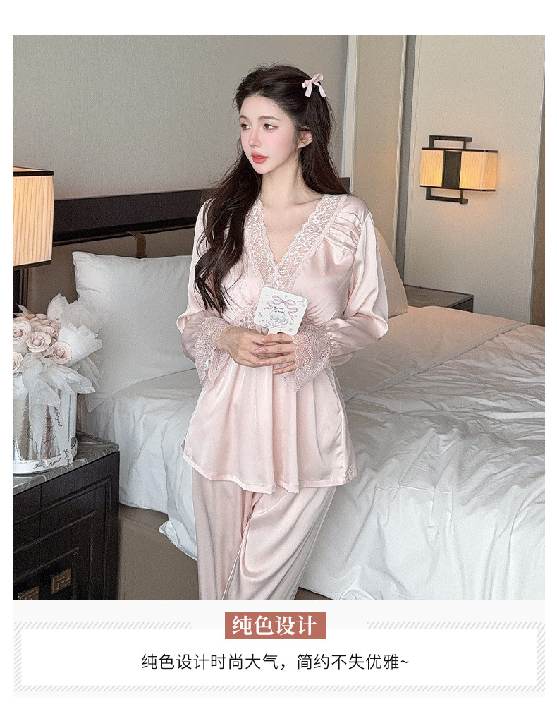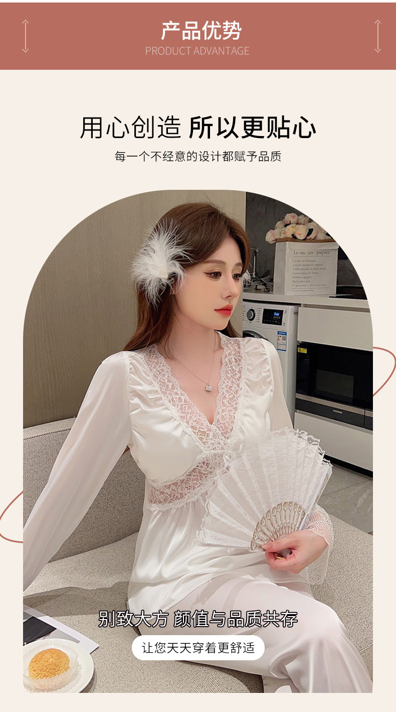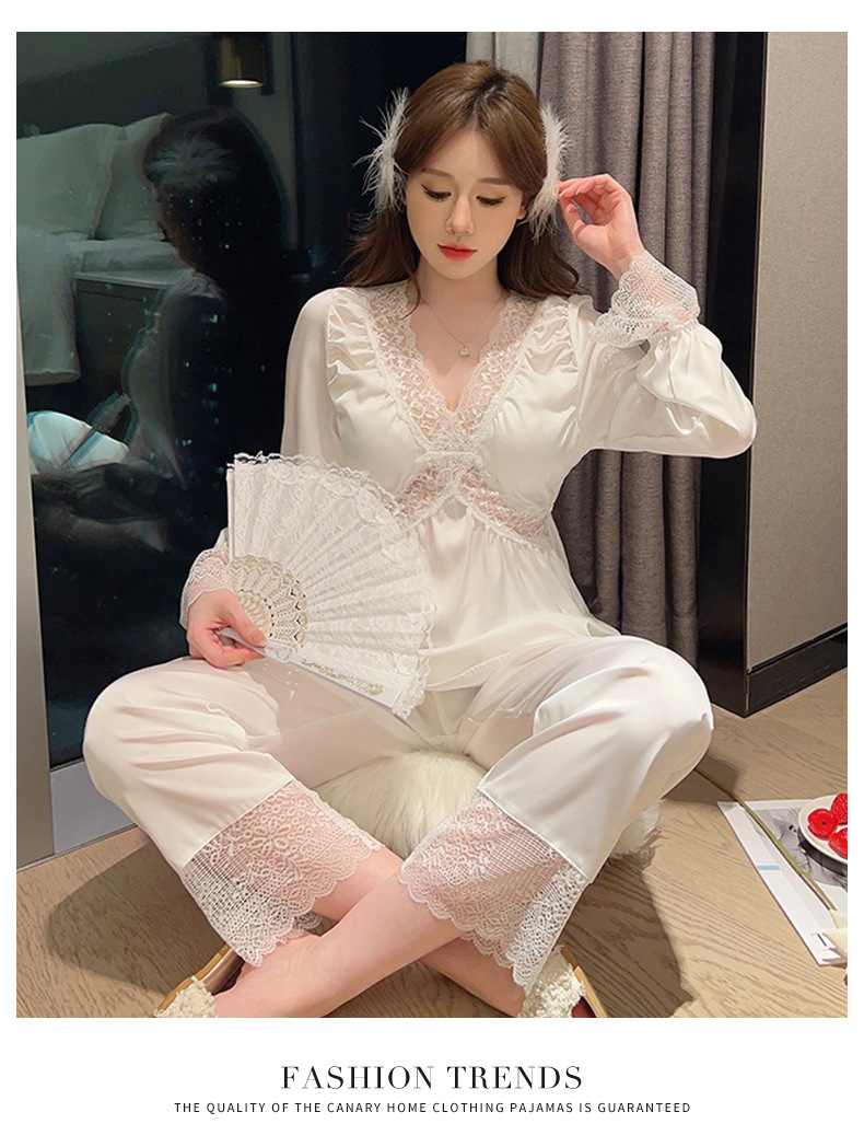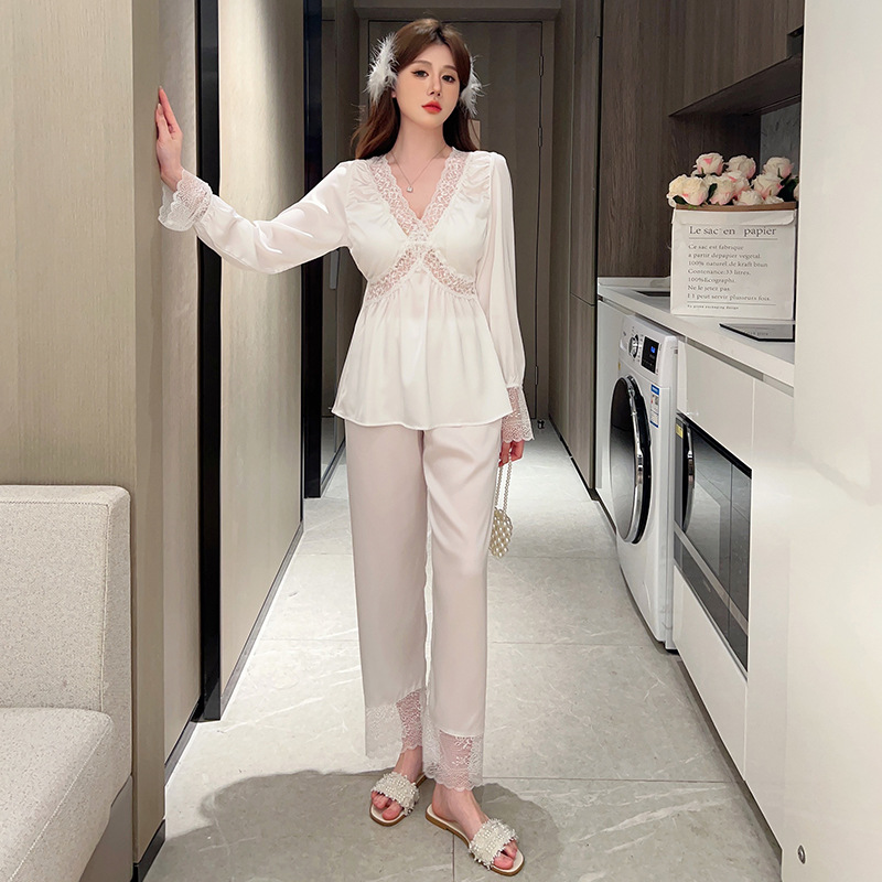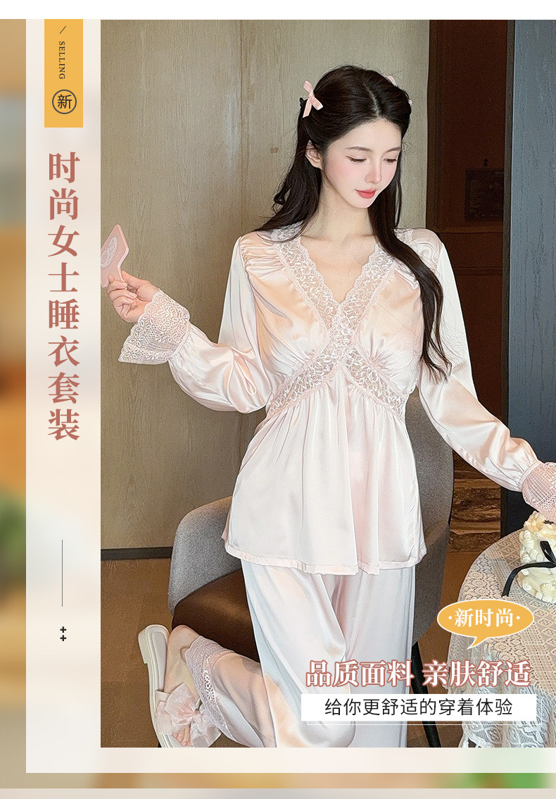 가을 신상 긴팔 잠옷 세트 투피스 심플 레이스 프렌치 스타일 실키 홈웨어 여성용