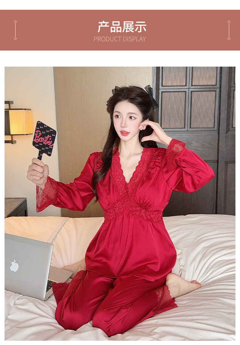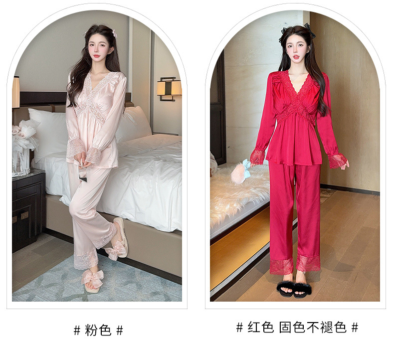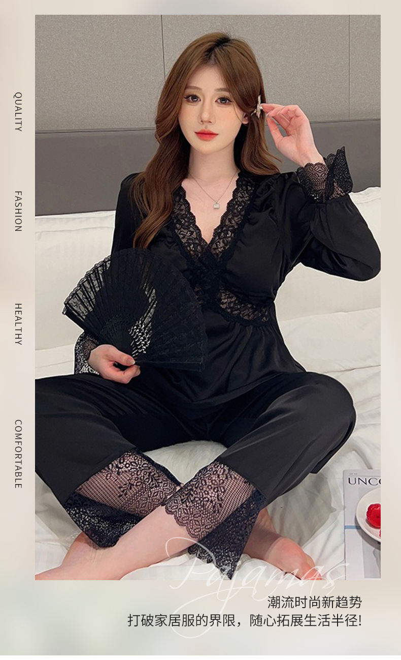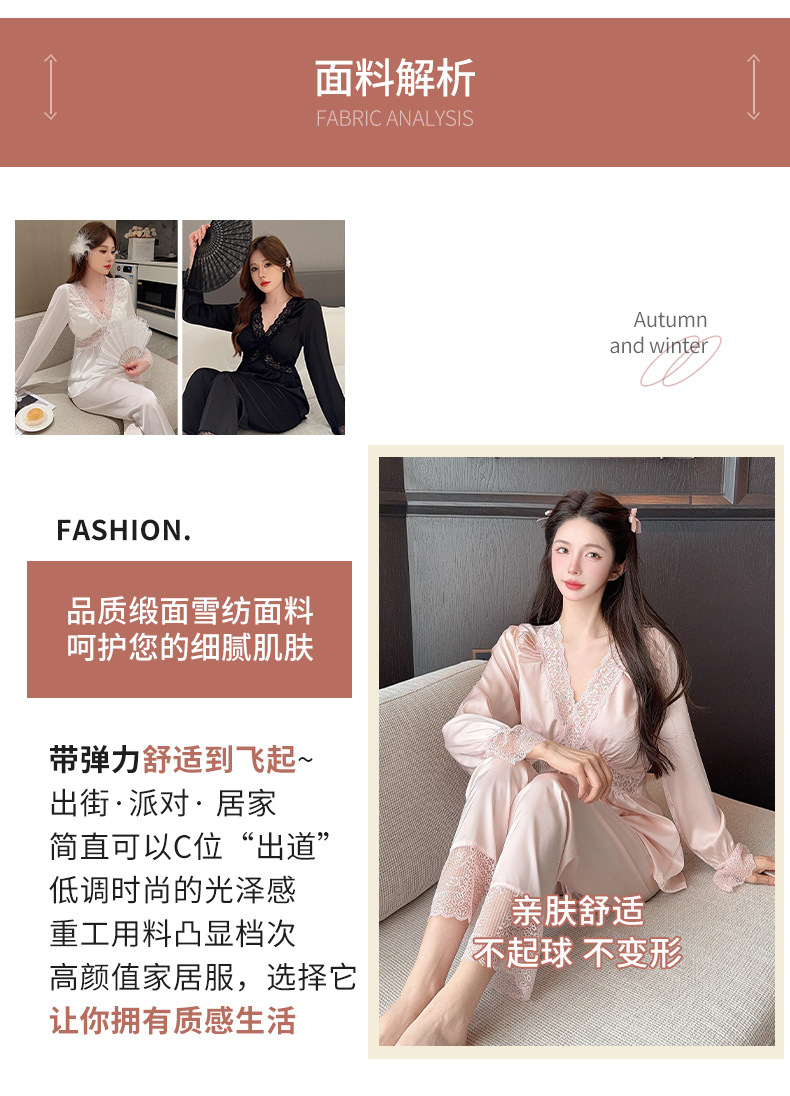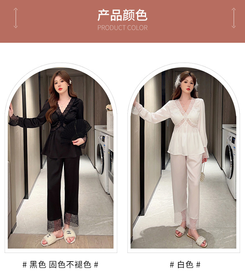 가을 신상 긴팔 잠옷 세트 투피스 심플 레이스 프렌치 스타일 실키 홈웨어 여성용