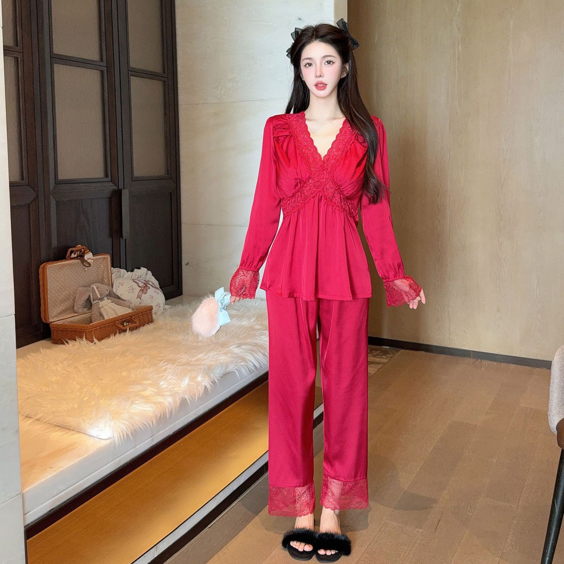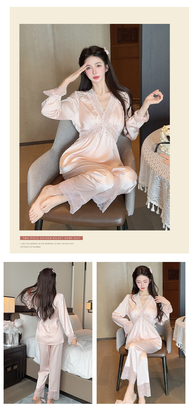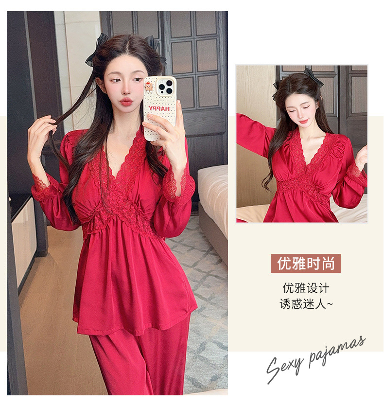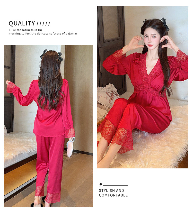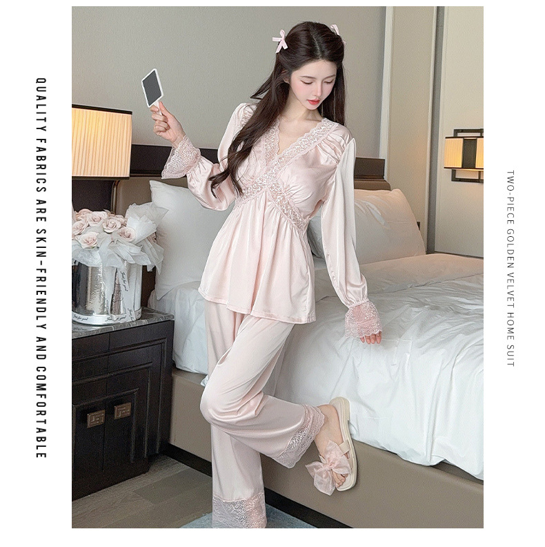 가을 신상 긴팔 잠옷 세트 투피스 심플 레이스 프렌치 스타일 실키 홈웨어 여성용