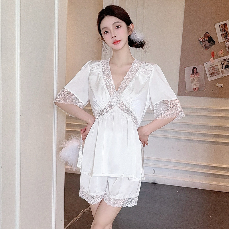 가을 신상 긴팔 잠옷 세트 투피스 심플 레이스 프렌치 스타일 실키 홈웨어 여성용스토어 가기