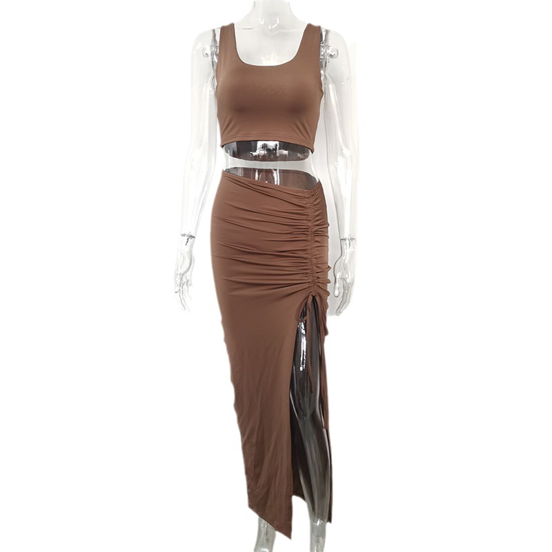 유럽과 미국의 패션 2023 여름 새로운 여성의 슬림 핏 배꼽 스트랩 탑 투피스 스플릿 섹시 세트 스커트