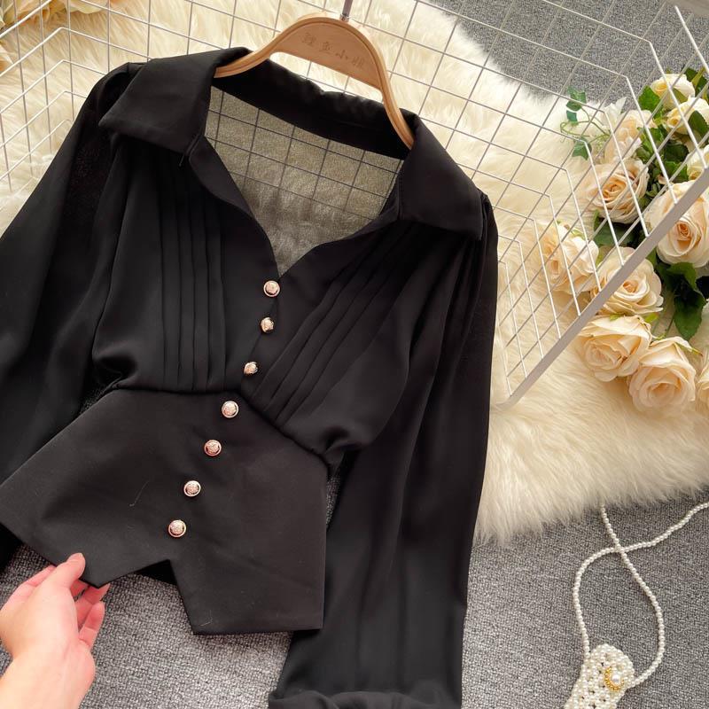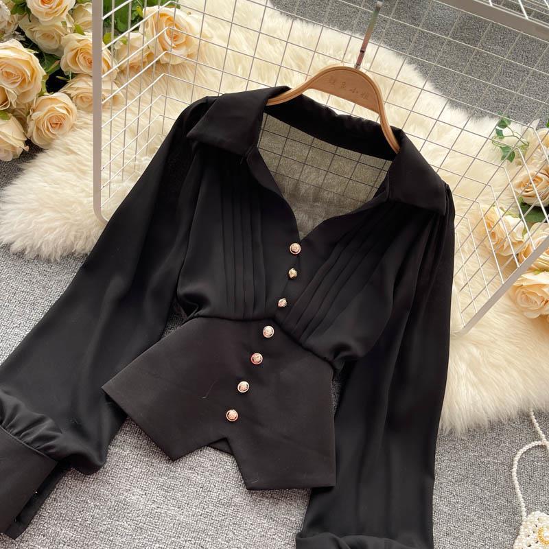 디자인 감각 틈새 프릴 칼라 긴 소매 셔츠 여성의 프랑스 스타일 우아한 불규칙한 밑단 버블 슬리브 탑