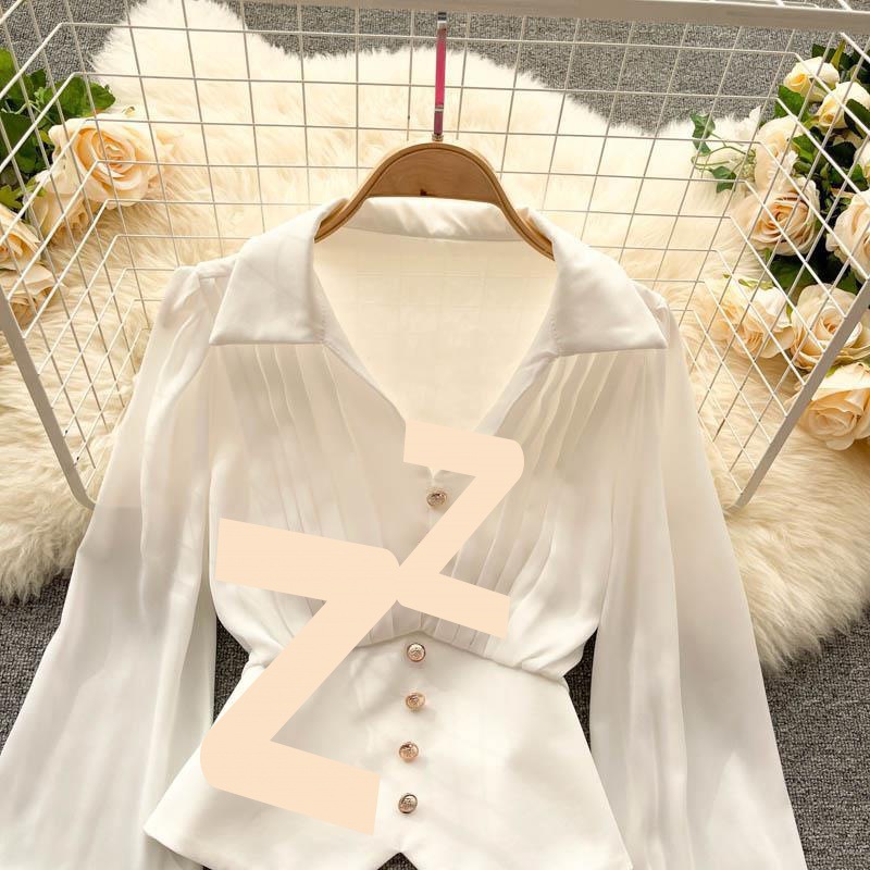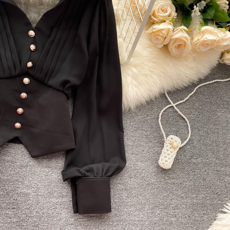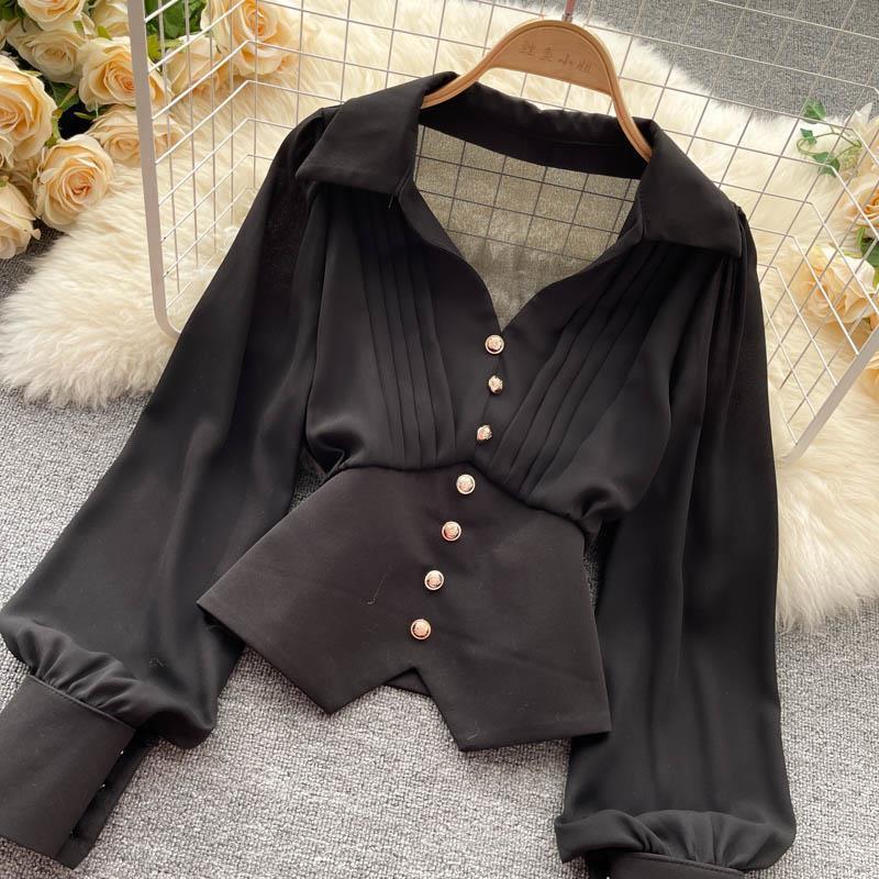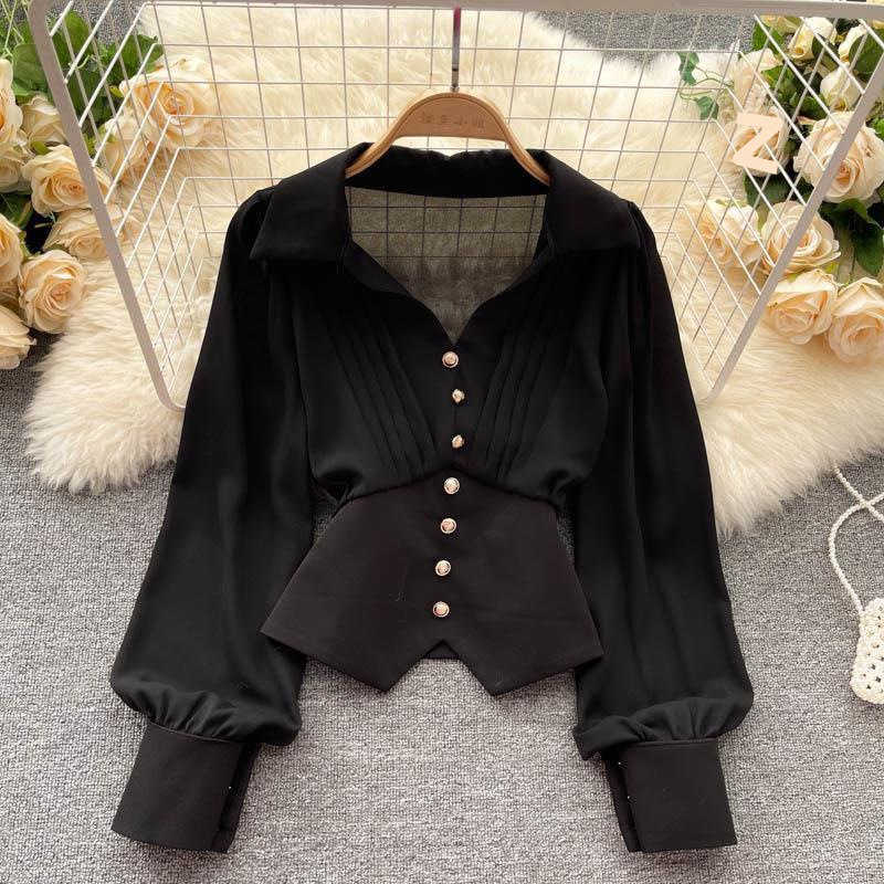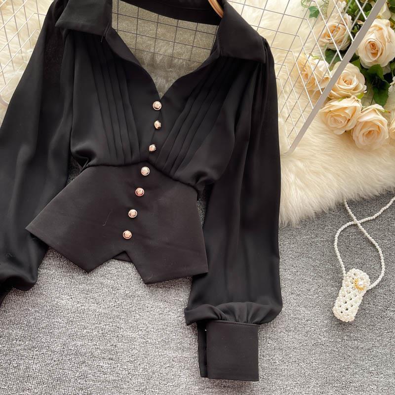 디자인 감각 틈새 프릴 칼라 긴 소매 셔츠 여성의 프랑스 스타일 우아한 불규칙한 밑단 버블 슬리브 탑스토어 가기