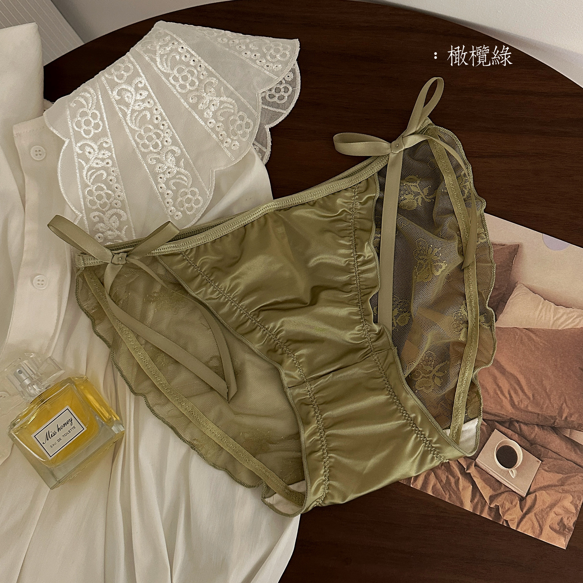 새로운 엔트리 라이트 럭셔리 속옷 여성용 실키 로우 웨이스트 새틴 팬티 레이스 메쉬 귀 팬티 투명 노크 섹시스토어 가기