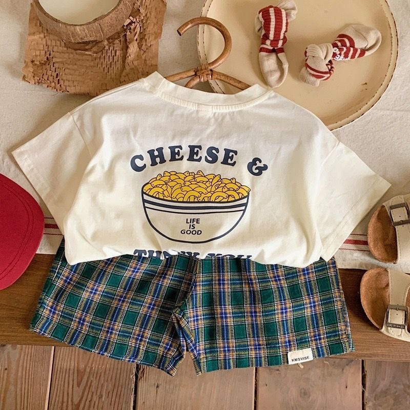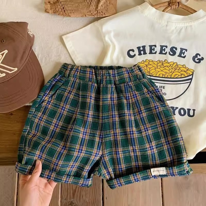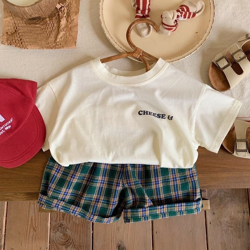 95 면 소년 반팔 세트 2023 여름 새로운 어린이 탑 베이비 빈티지 격자 무늬 반바지 투피스 세트