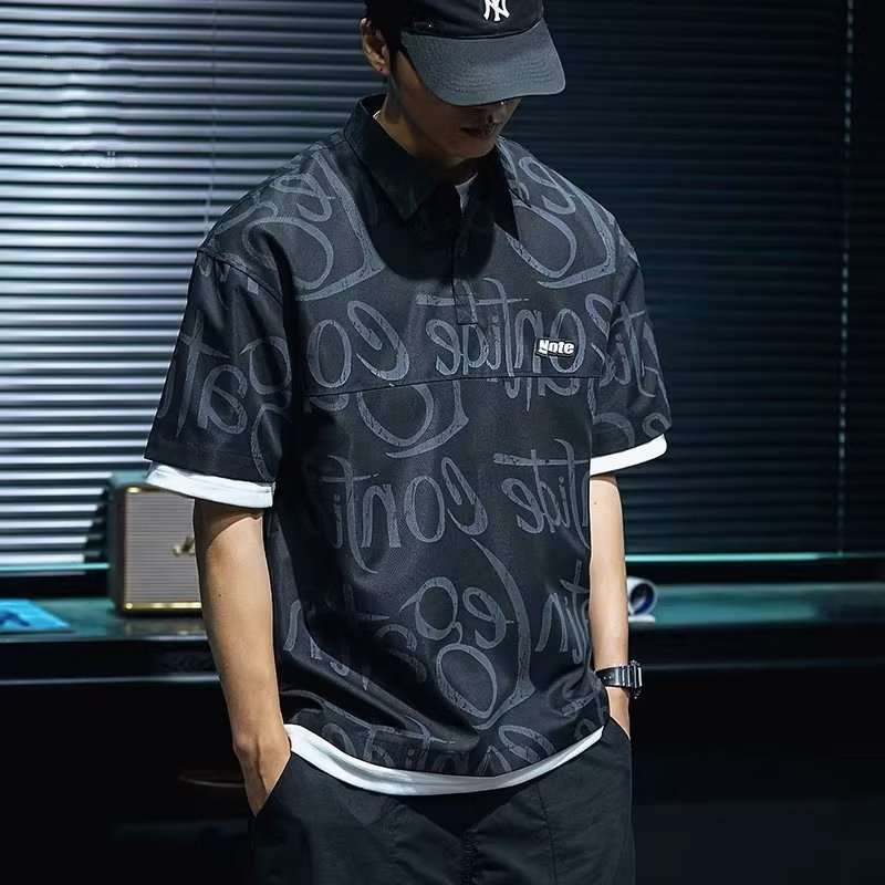 여름 레트로 반팔 티셔츠 남성용 올오버 프린트 폴로 셔츠 멋진 디자인 루즈한 카라 스타일 스트리트웨어
