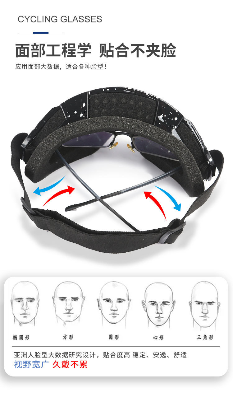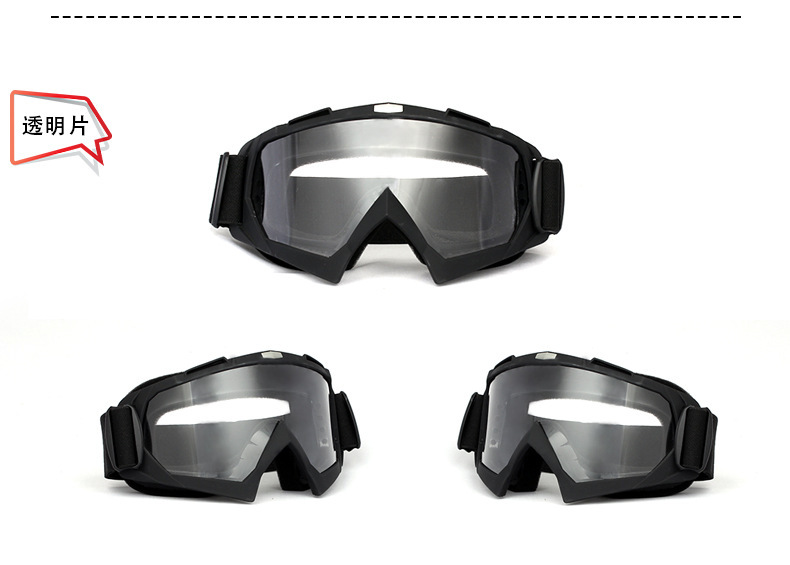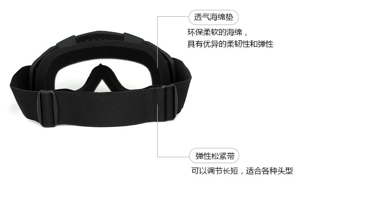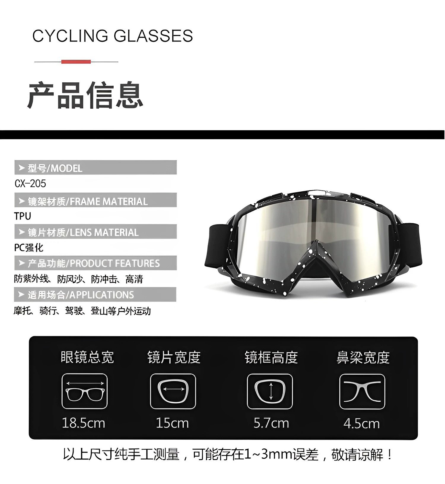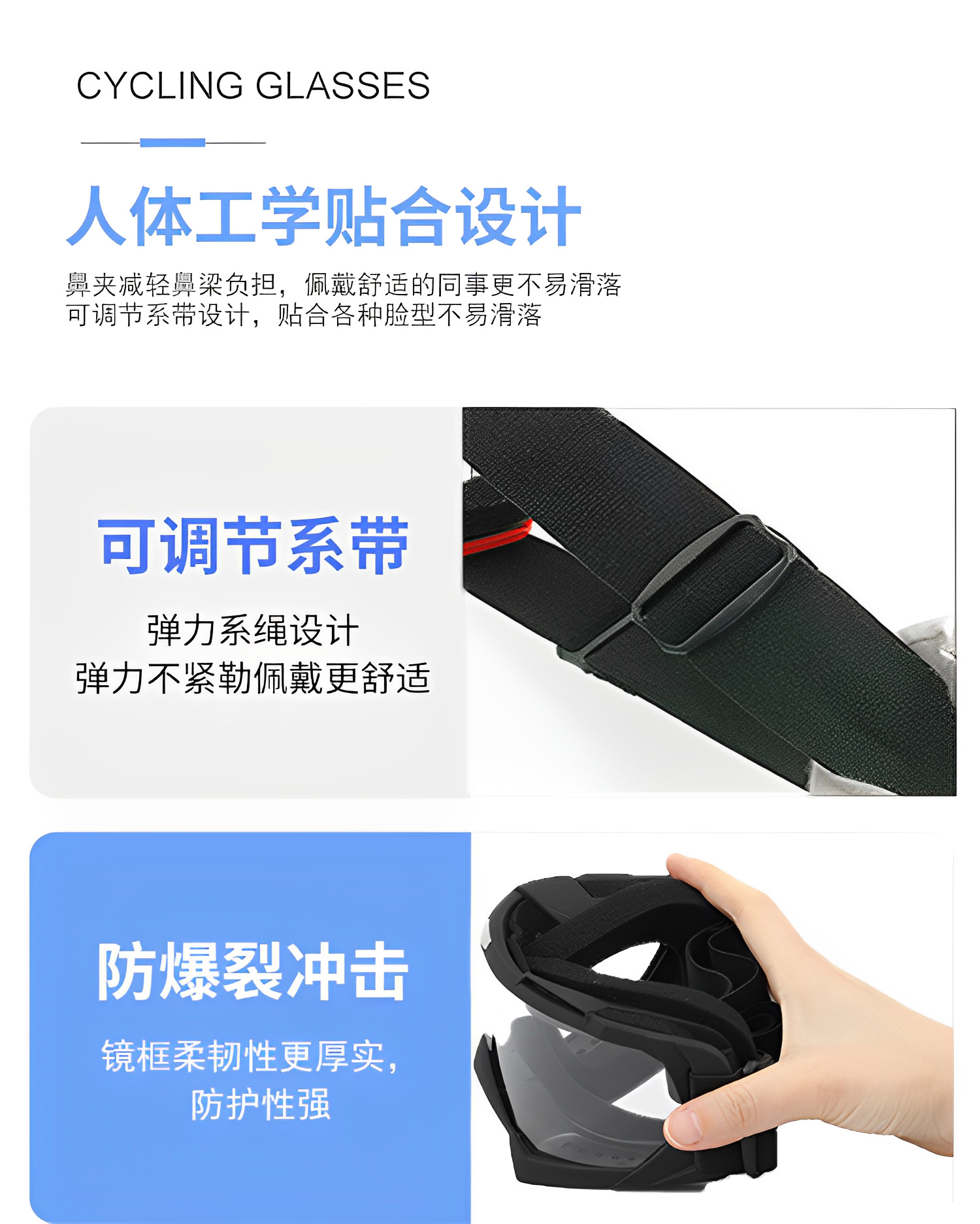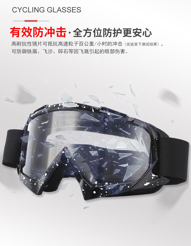 产品卖点:炫酷外观,高清大视野,内部可卡近视眼镜;可适应越野,骑行等场景;内置柔软海绵透气舒适;PC材质镜片更耐摩擦抗冲击,防风沙;