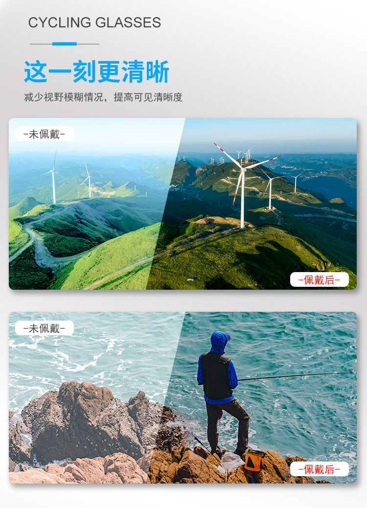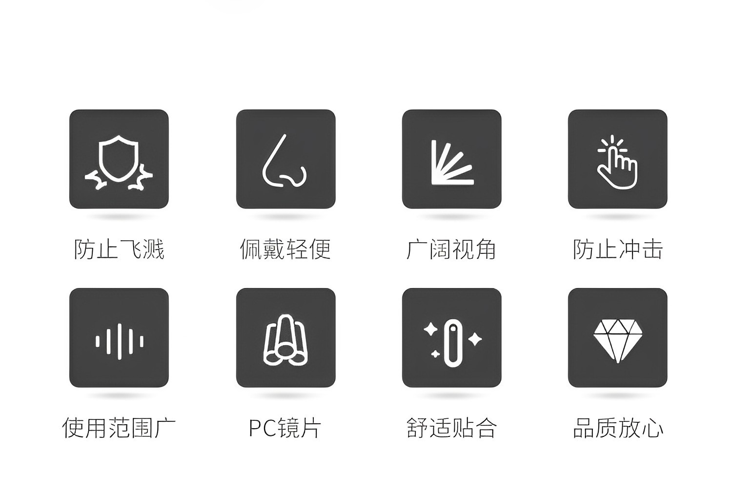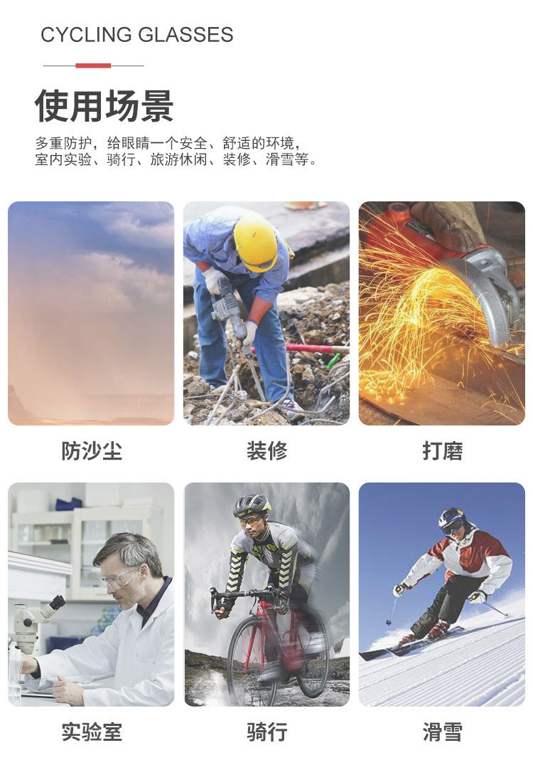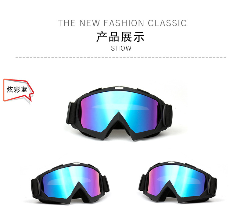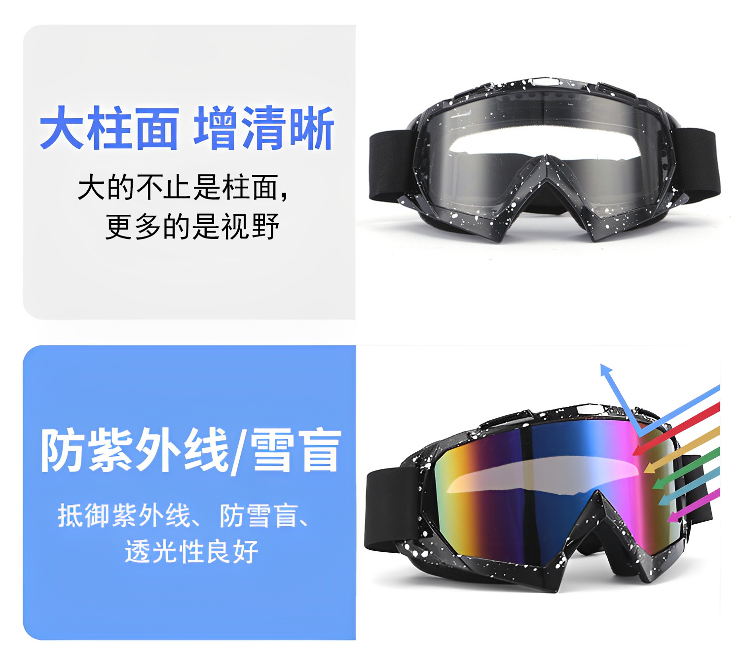 产品卖点:炫酷外观,高清大视野,内部可卡近视眼镜;可适应越野,骑行等场景;内置柔软海绵透气舒适;PC材质镜片更耐摩擦抗冲击,防风沙;