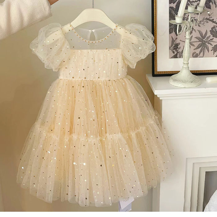여자 공주 드레스 여름 드레스 2024 새로운 스타일 어린이 스팽글 스타 메쉬 퍼프 스커트 여자 드레스 드레스스토어 가기