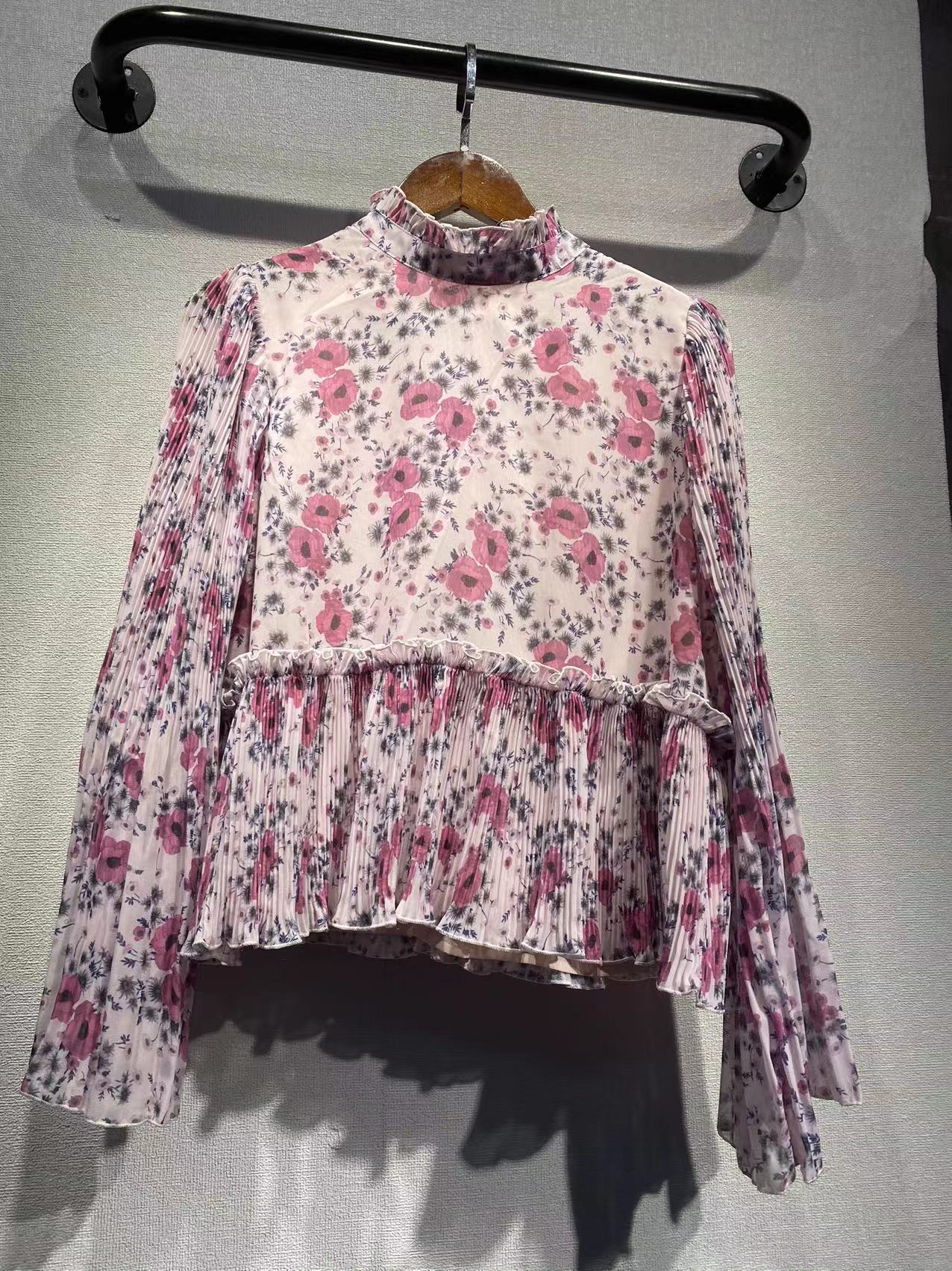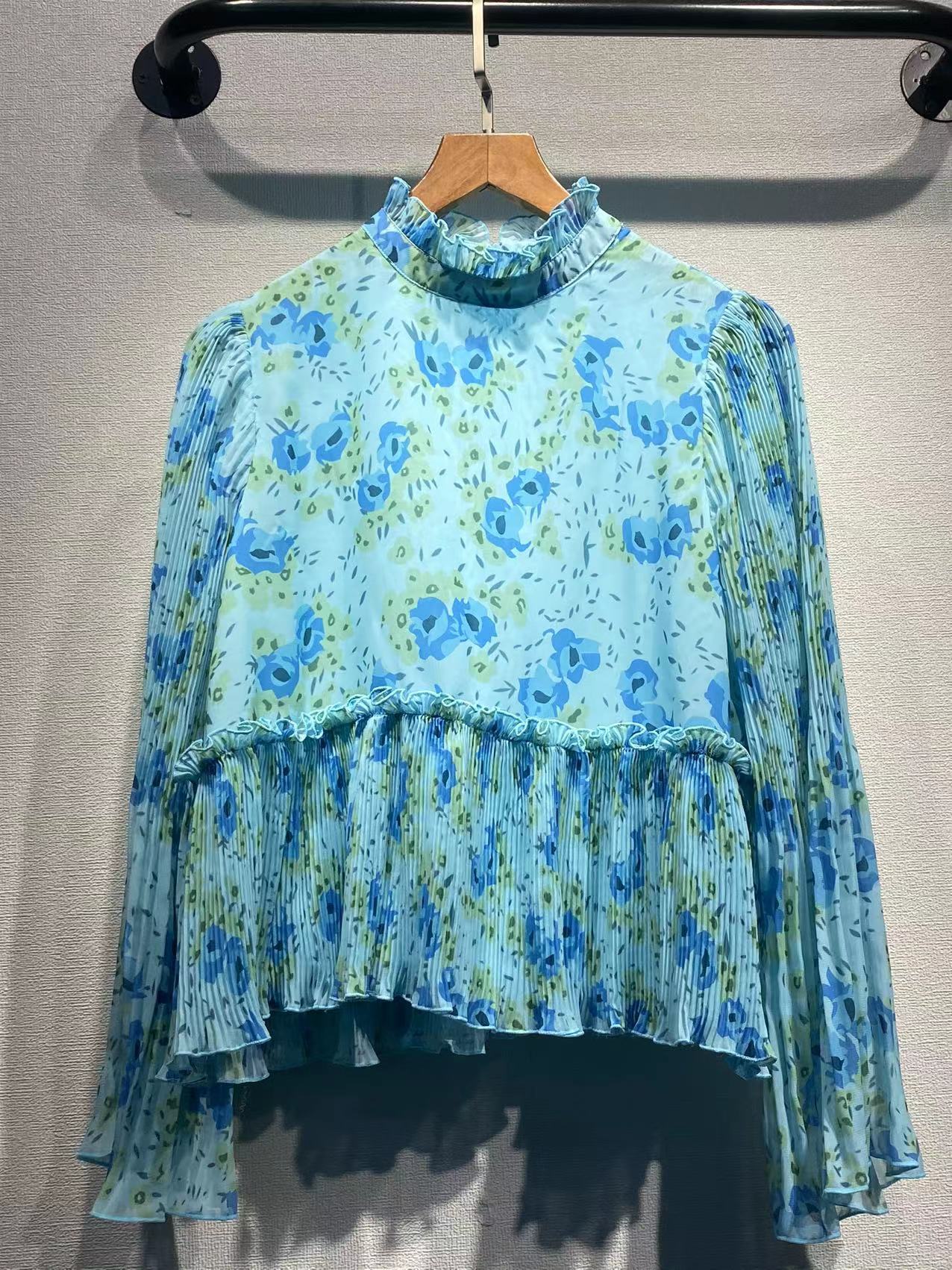 Nordic GA Home 2024 여름 새로운 꽃 인쇄 Georgette 주름진 느슨한 긴 소매 셔츠 탑