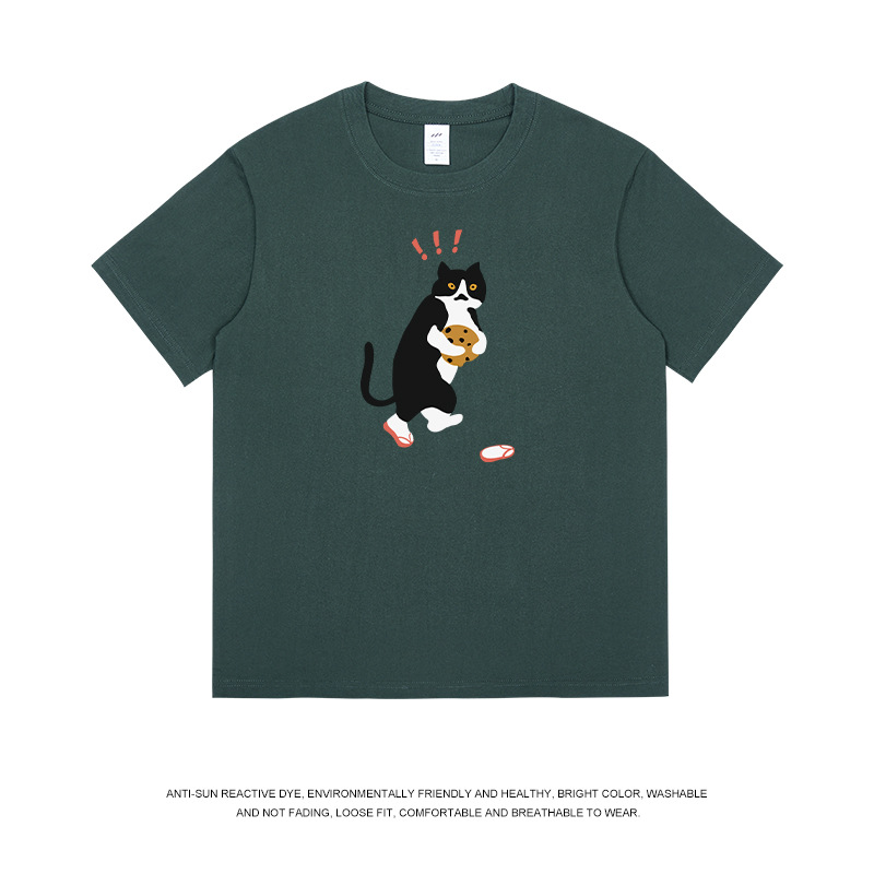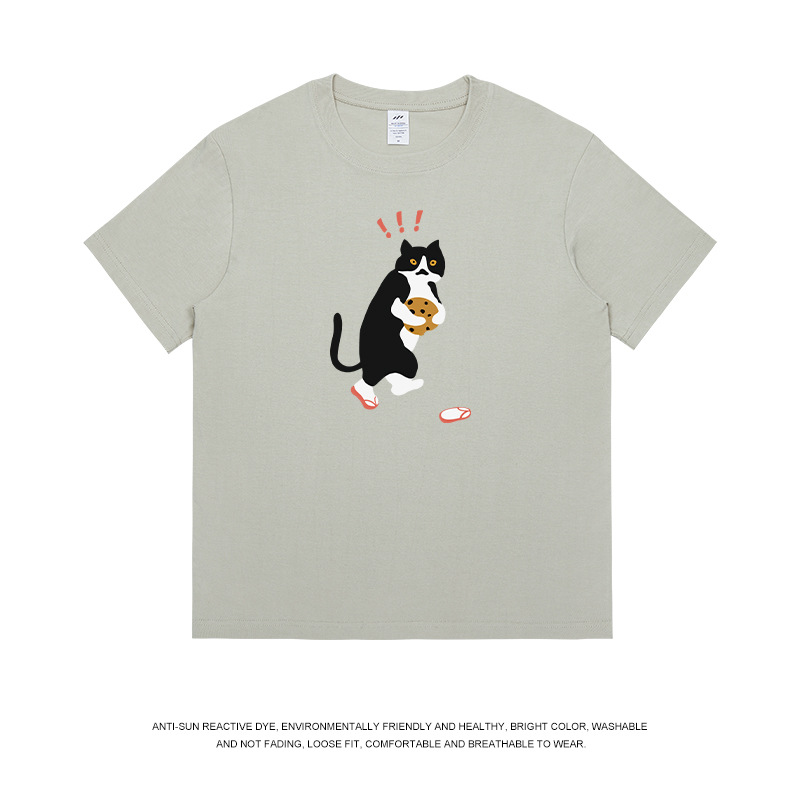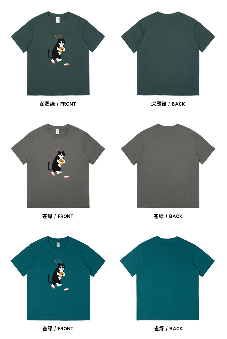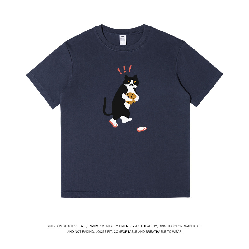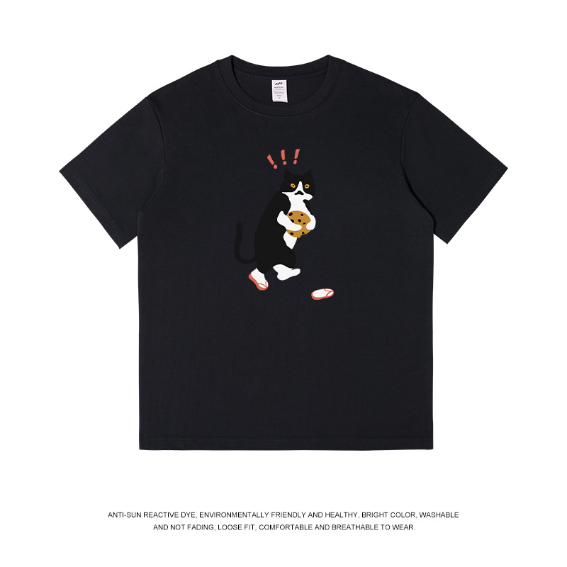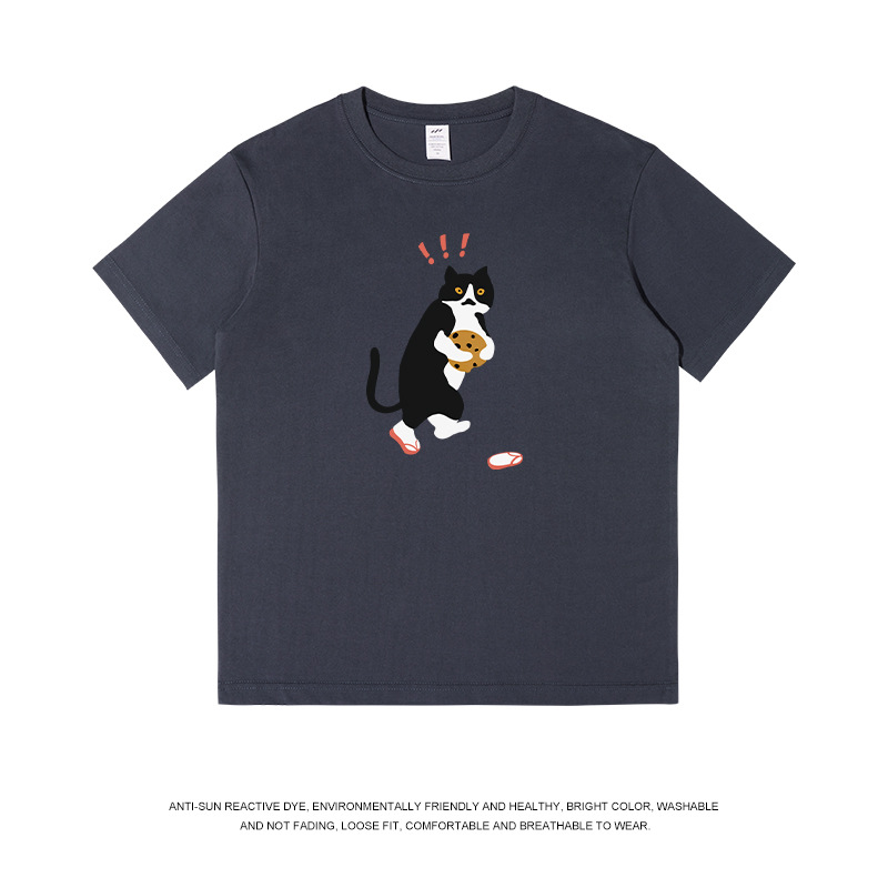 반팔 티셔츠 남성용 프린트 고양이 만화 순면 느슨한 반팔 남성 여름 일본 헤비 230g 패션 탑