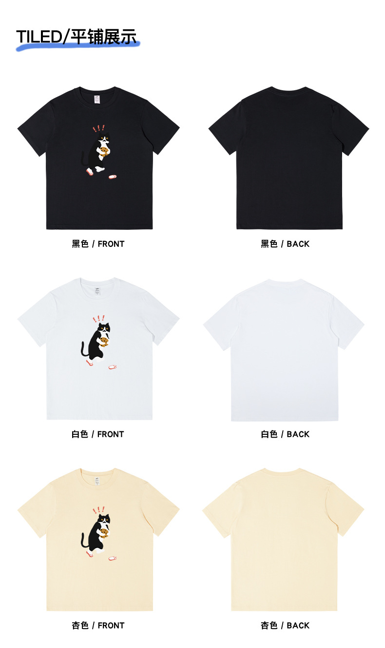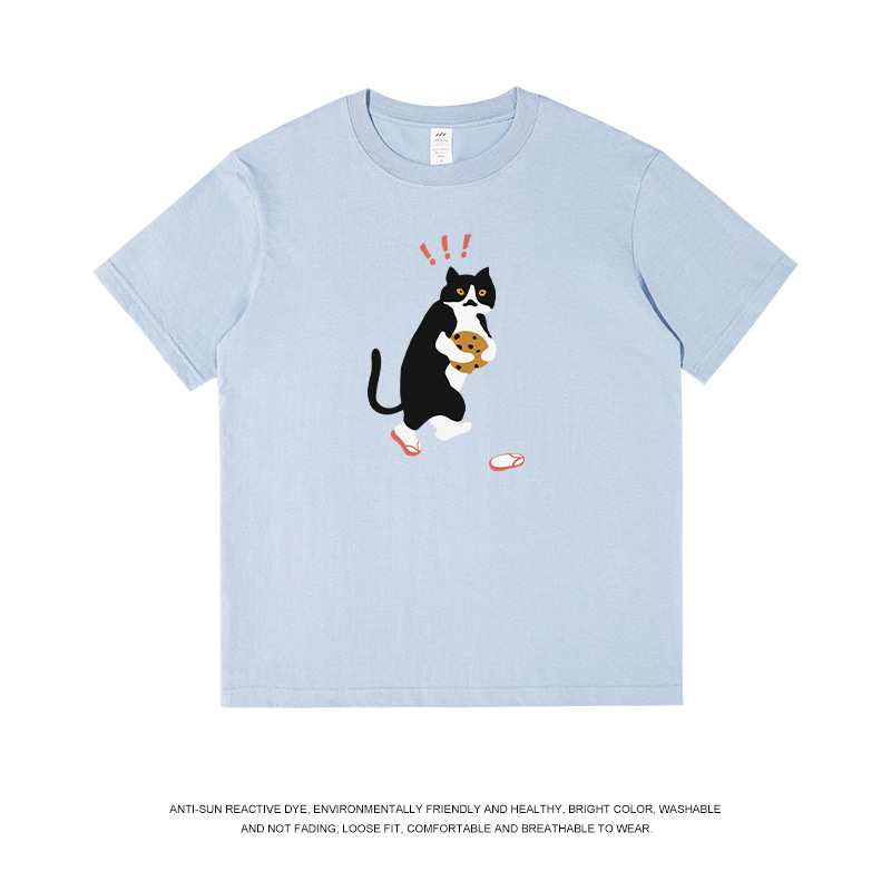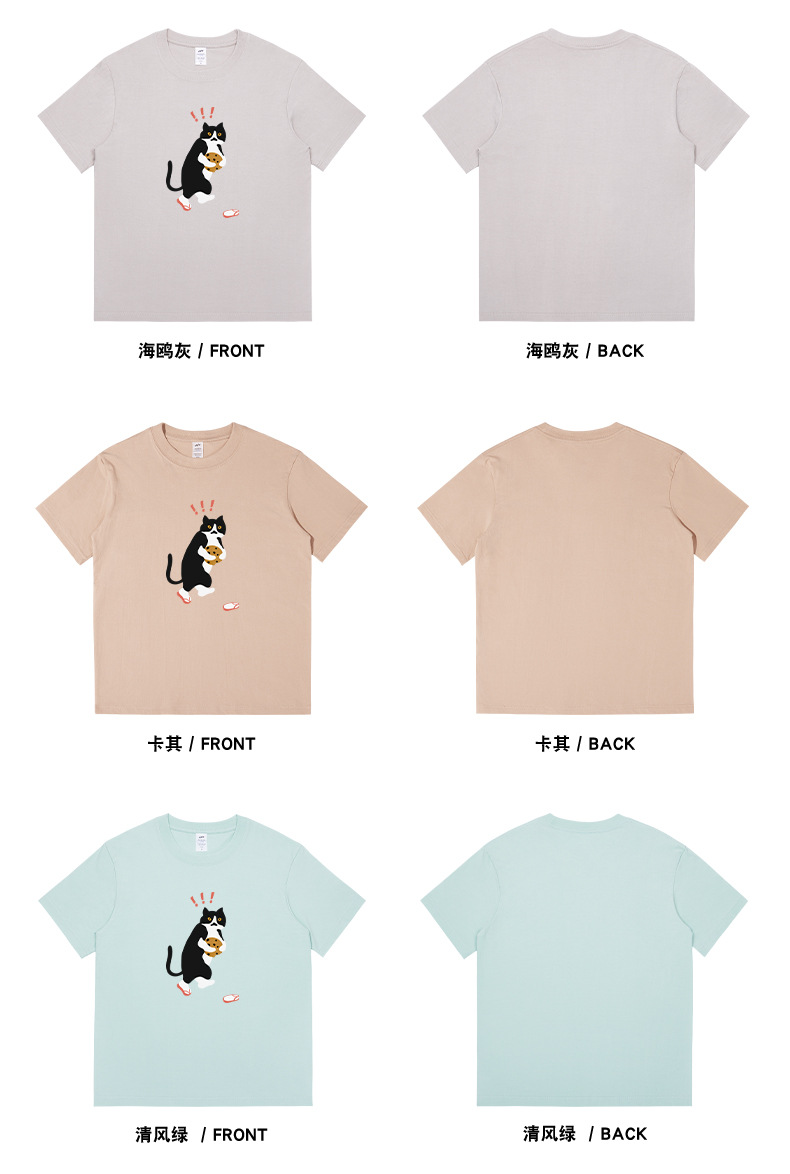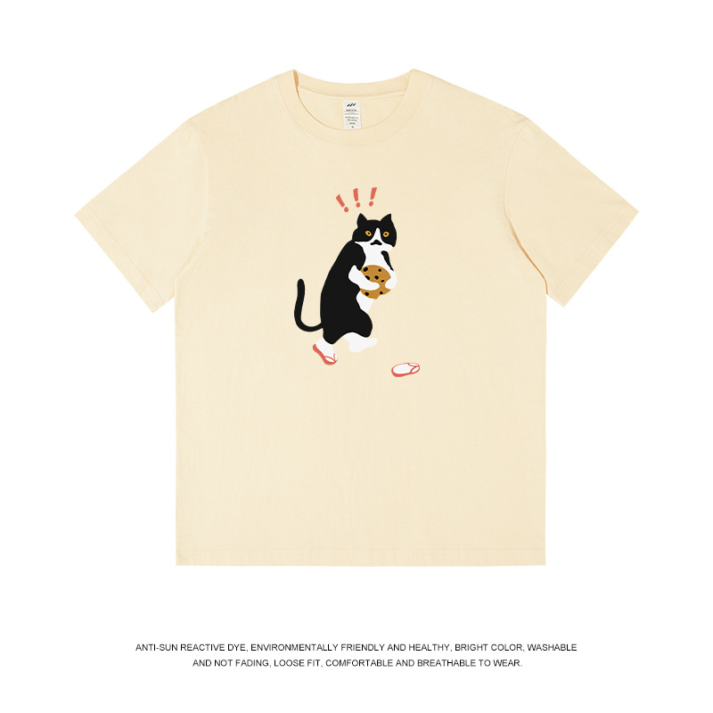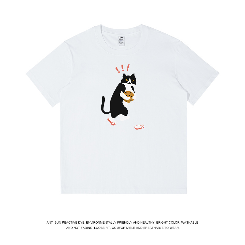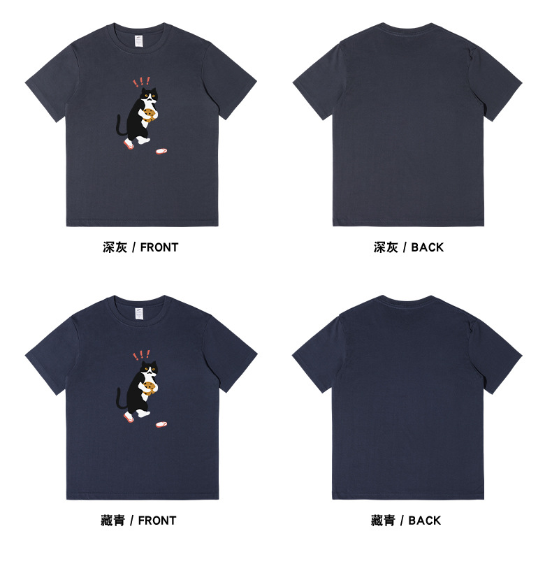 반팔 티셔츠 남성용 프린트 고양이 만화 순면 느슨한 반팔 남성 여름 일본 헤비 230g 패션 탑
