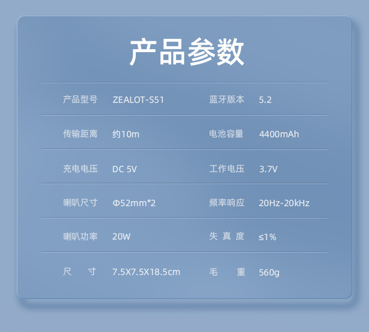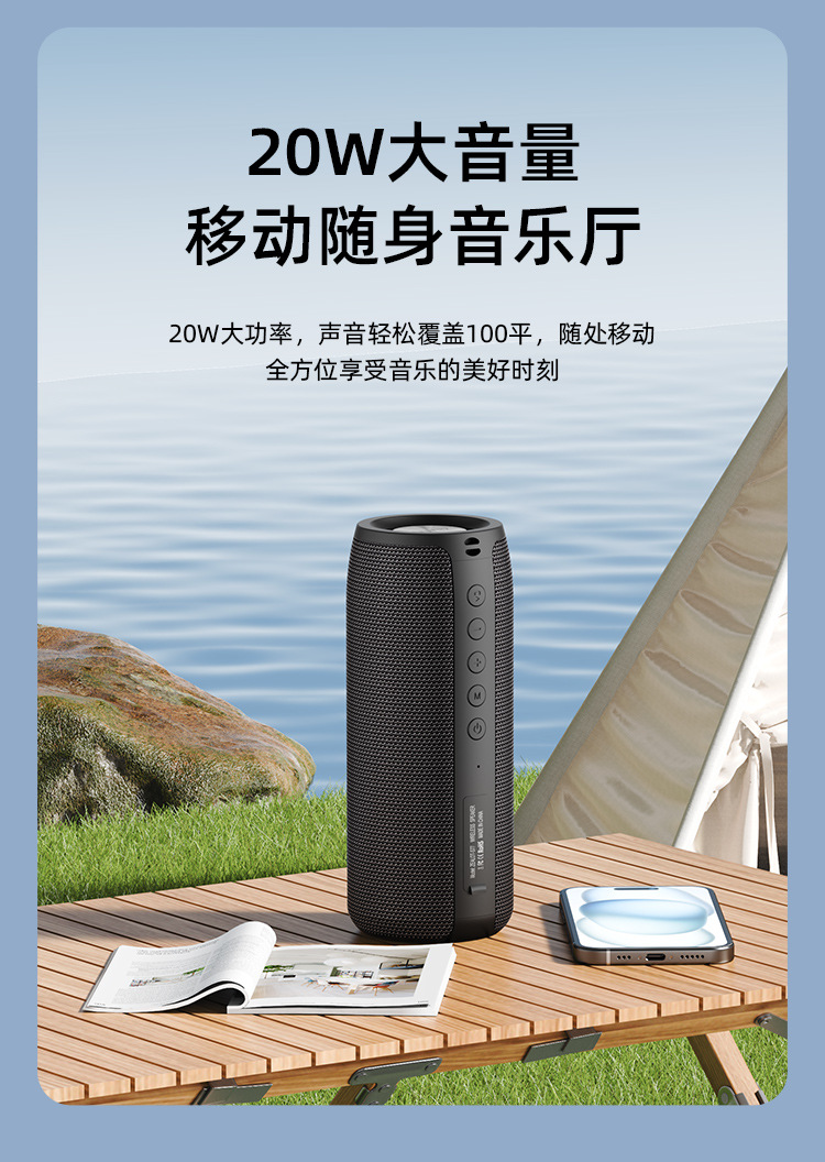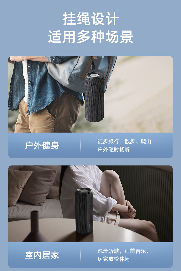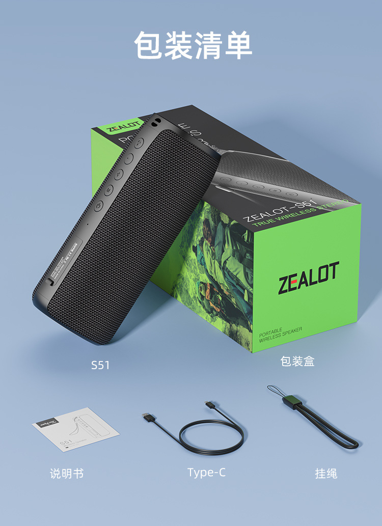 产品配件:音箱一台+挂绳+安卓充电线+中英文说明书