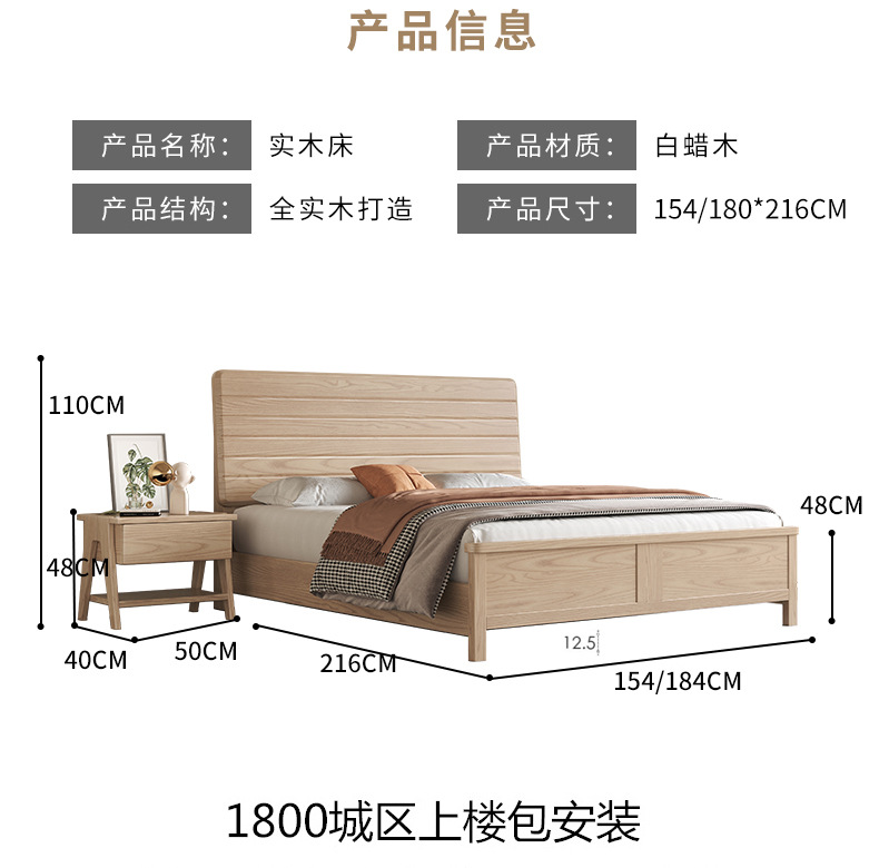 日式简约白蜡木1.8米双人床家用小户型1.5米实木床出租屋公寓家具