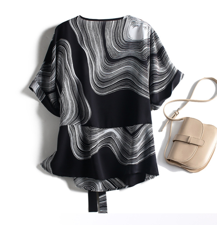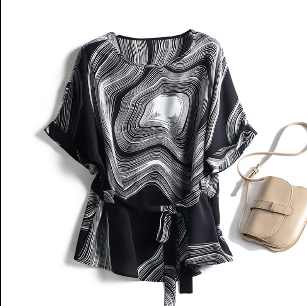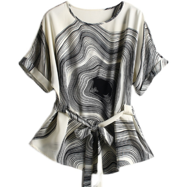 유럽 스테이션 핀치 허리 작은 셔츠 여성용 슬림 쉬폰 탑 여성용 여름 아름다운 프린트 레이스 업 어머니의 작은 티셔츠
