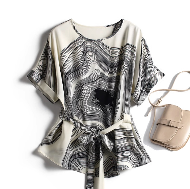 유럽 스테이션 핀치 허리 작은 셔츠 여성용 슬림 쉬폰 탑 여성용 여름 아름다운 프린트 레이스 업 어머니의 작은 티셔츠스토어 가기