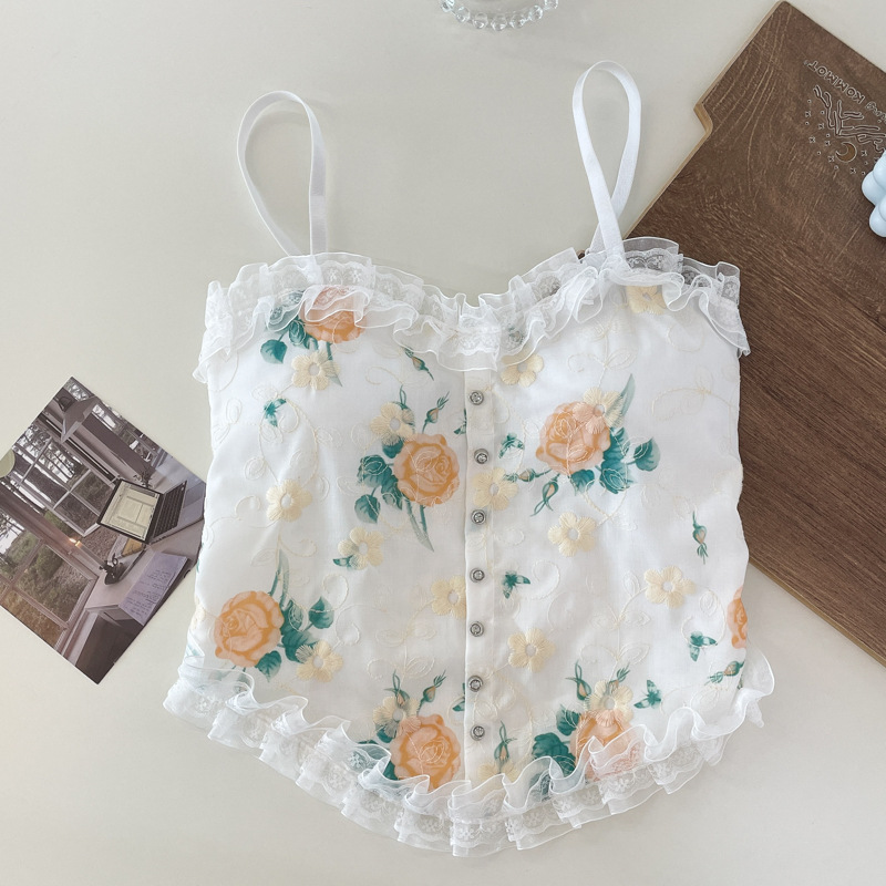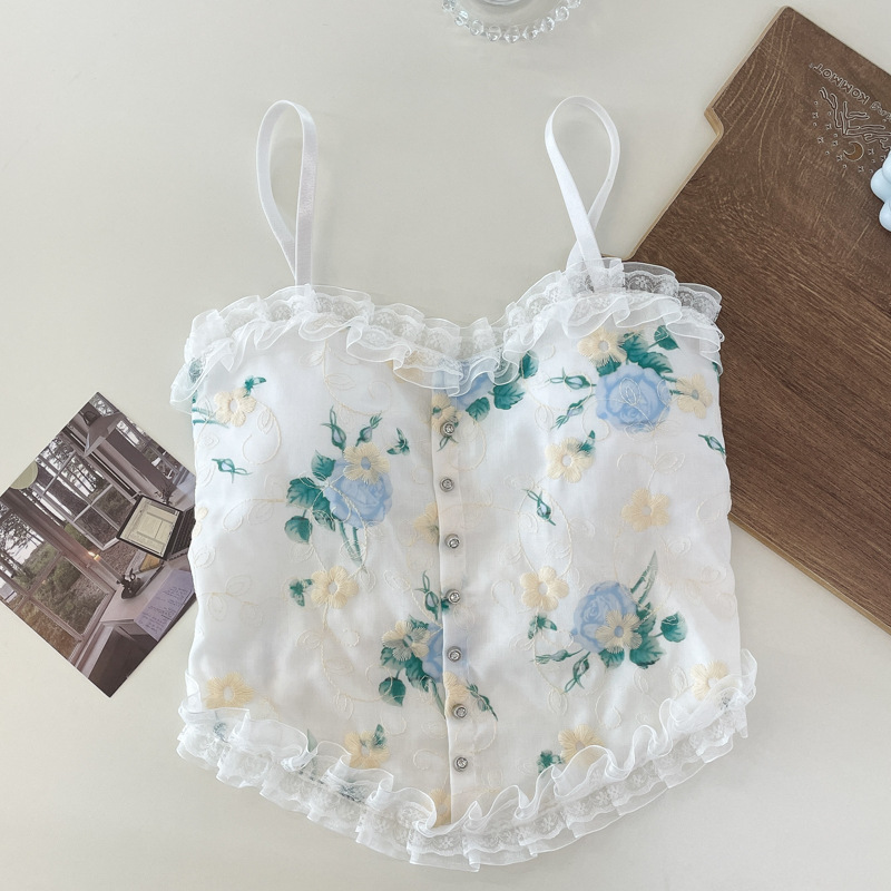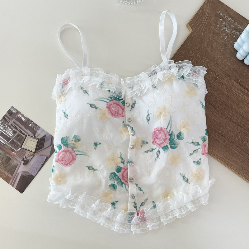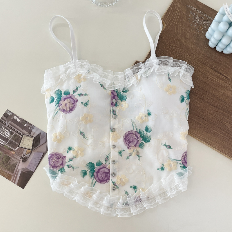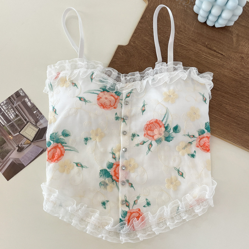 목가적 인 복고풍 스타일 작은 꽃 슬링 레이스 가슴 패드 랩이있는 아름다운 등 조끼 가슴 원피스 기본 짧은 탑스토어 가기