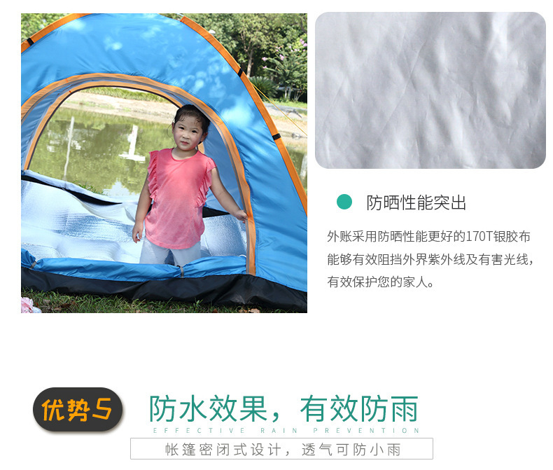 【产品特点】2秒速开,一抛即开, 无需搭建,可适用于户外野营、公园休闲等实 面广。涤塔夫涂银面料, 防晒健康无异味。纤维帐杆任性好不易损坏。便携式包装 袋, 体积小携带方便。