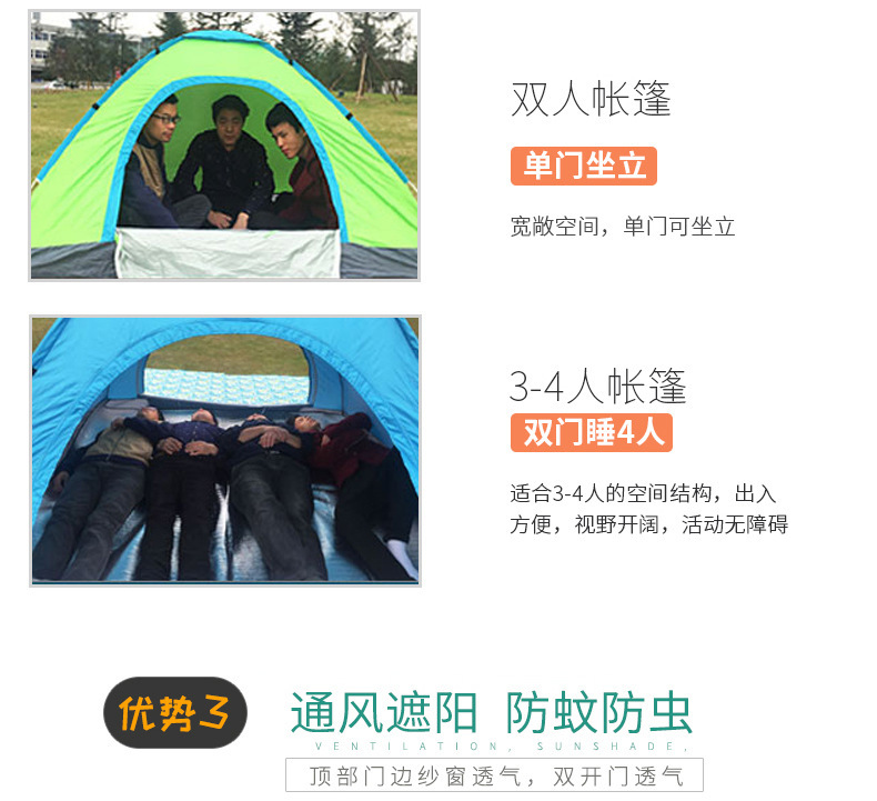 【产品编号】全自动速开手抛帐 【产品规格】1-2人:200cm*120cm*110cm(单门无天窗)重:0.8kg 1-2人:200cm*135cm*120cm(单门有天窗)重:0.9kg 2-3人:200cm*150cm*100cm(单门有天窗)重:1.2kg 2-3人:200cm*150cm*100cm(双门有天窗)重:1.2kg 3-4人:200cm*200cm*130cm(双门有天窗)重:1.4kg