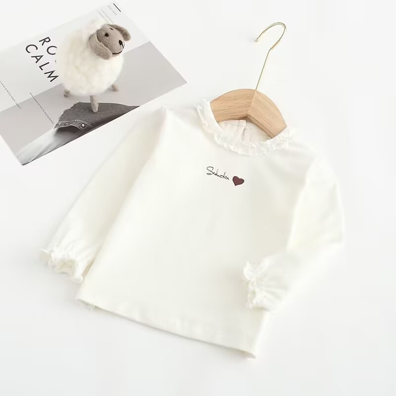 2023 새로운 아동복 여자 긴 소매 티셔츠 우드 이어 가장자리 라운드 넥 아동복 탑 여성베이스 셔츠