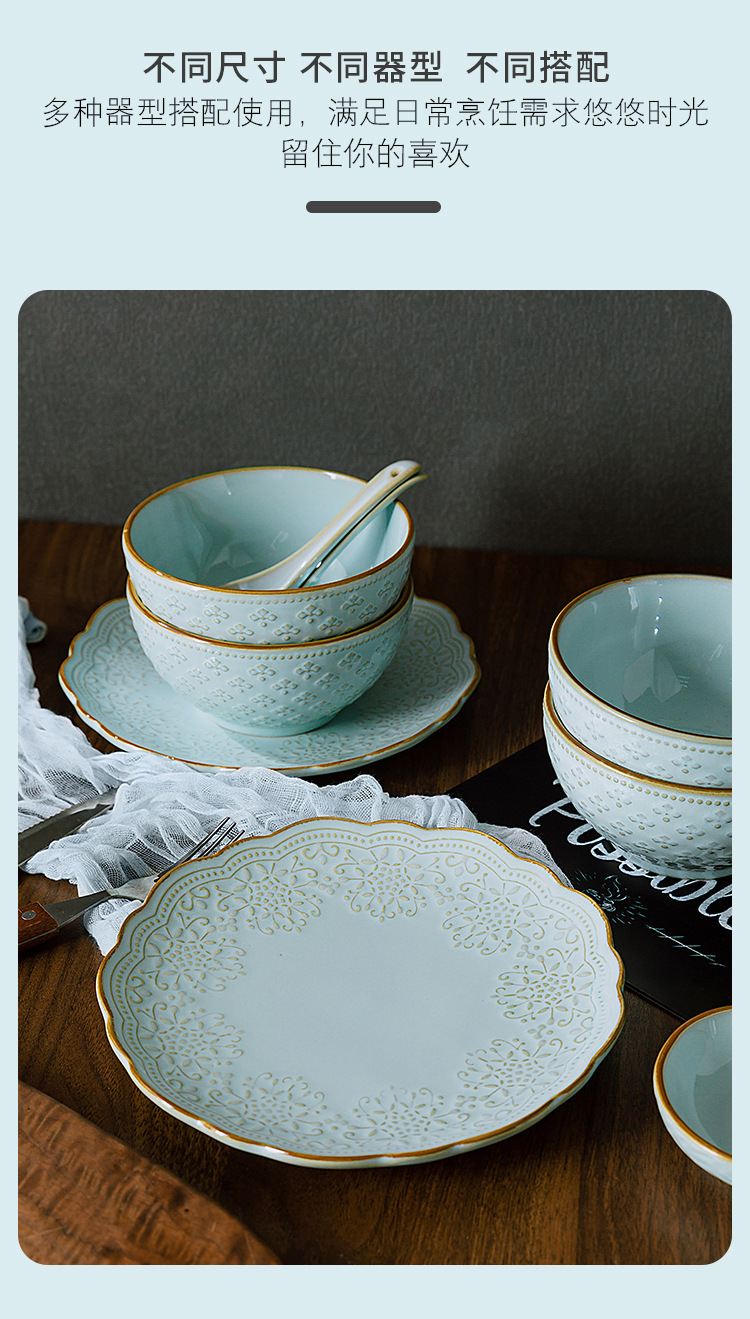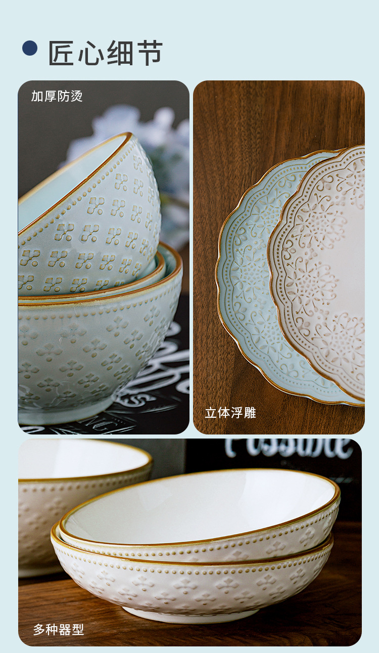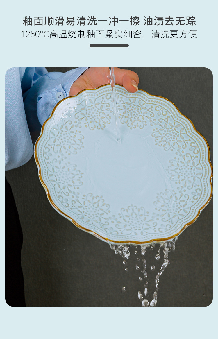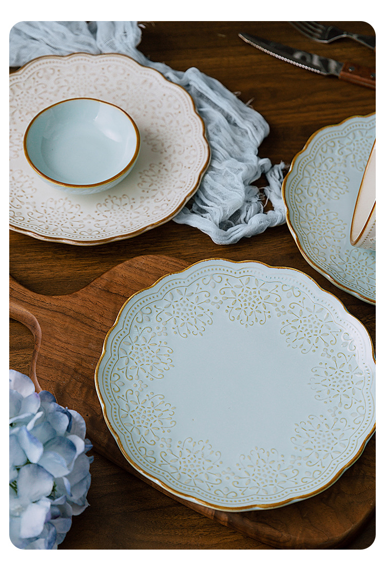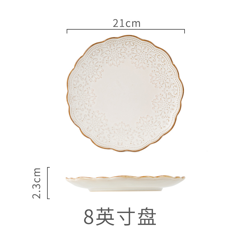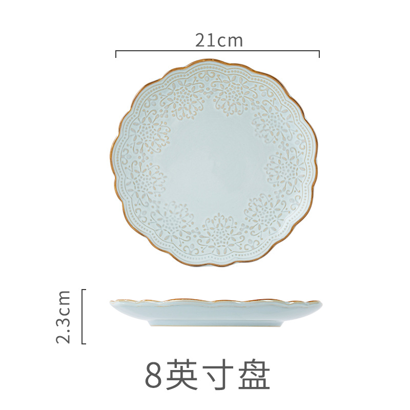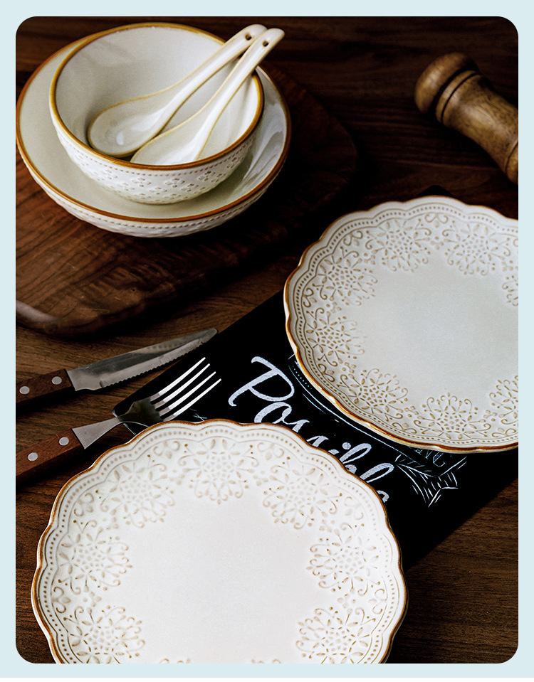 Yuquan 세라믹 공장 아울렛 그릇 접시 가정용 세라믹 접시 중국 크리에이티브 양각 레이스 식기스토어 가기