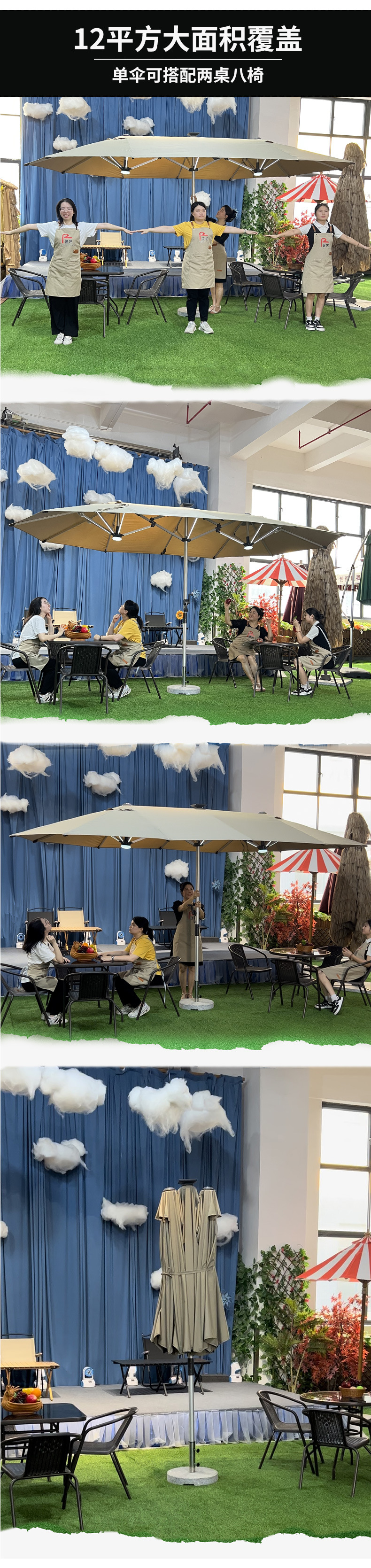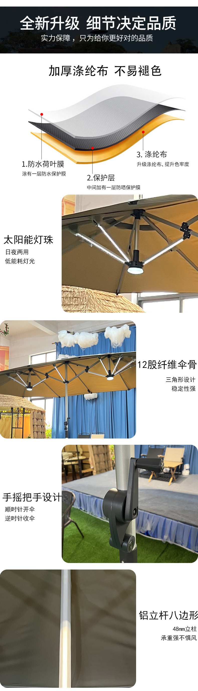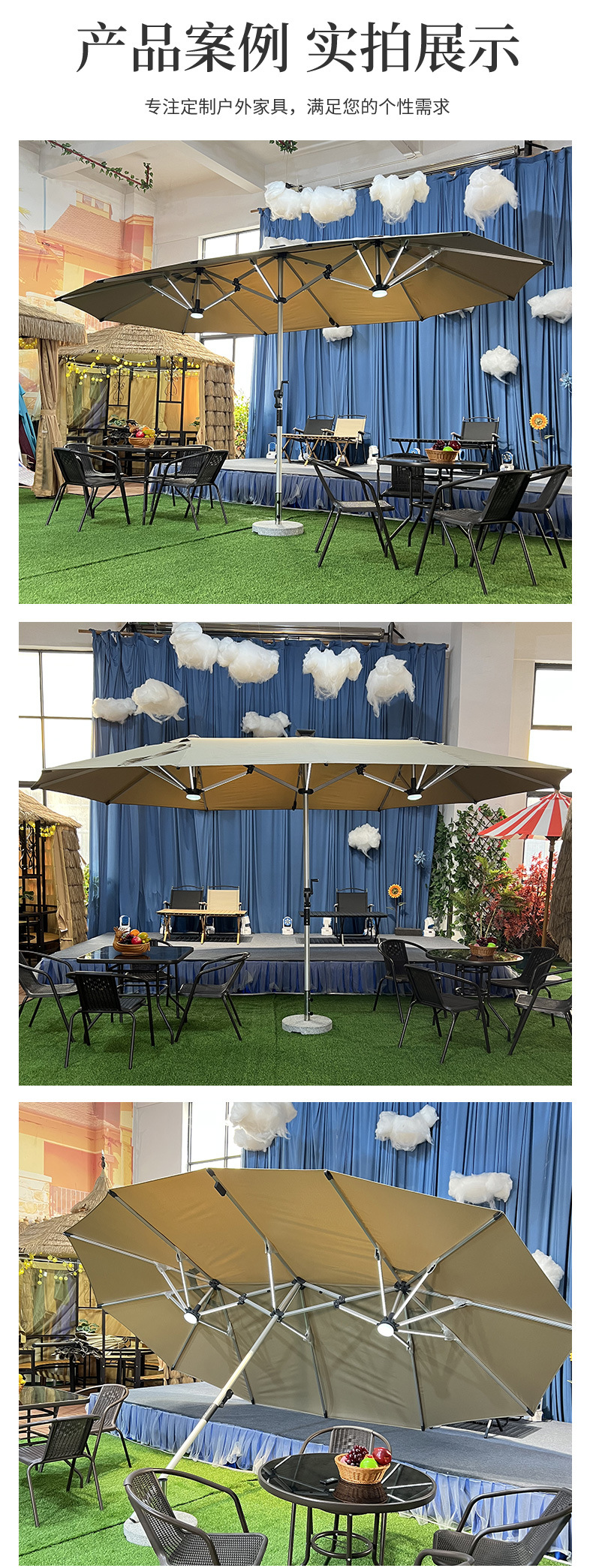 야외 세 머리 파라솔 빌라 안뜰 테라스 우산 마구간 상업용 태양열 LED 조명 카페 중간 기둥 우산스토어 가기