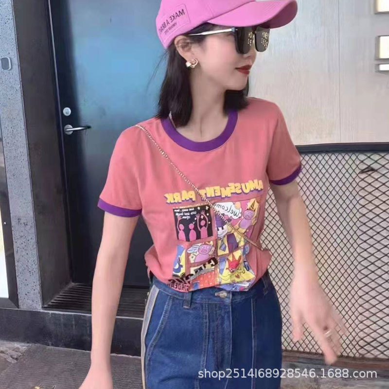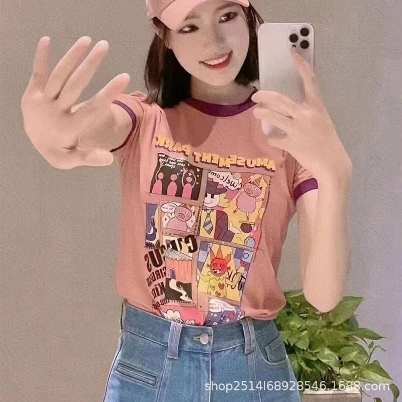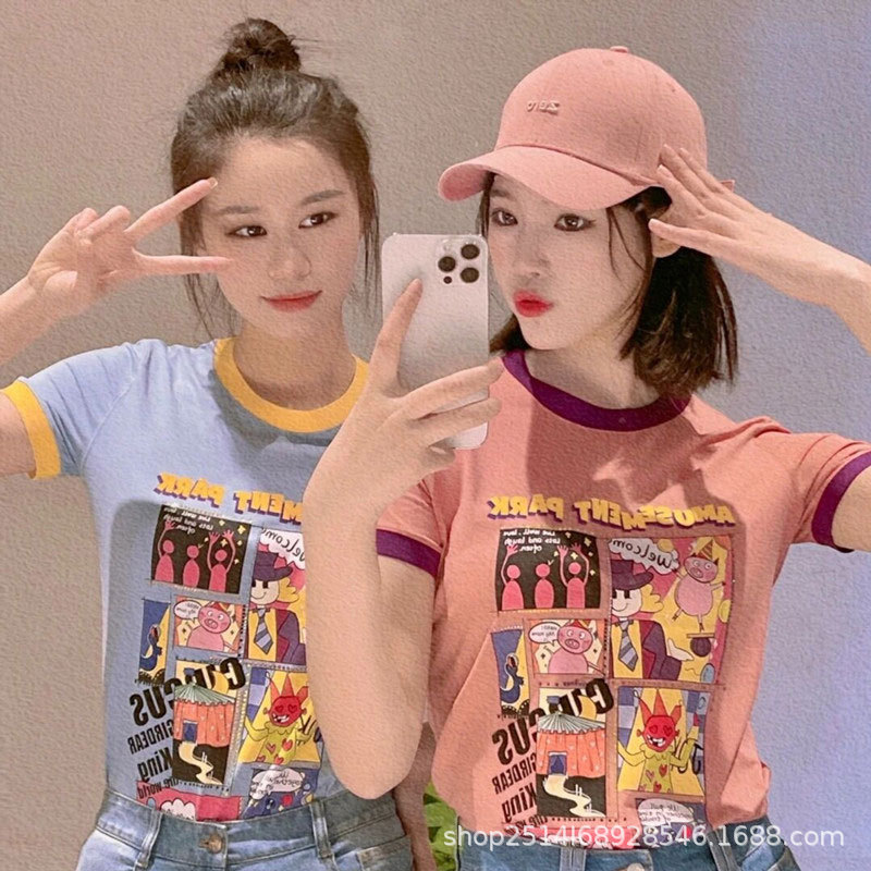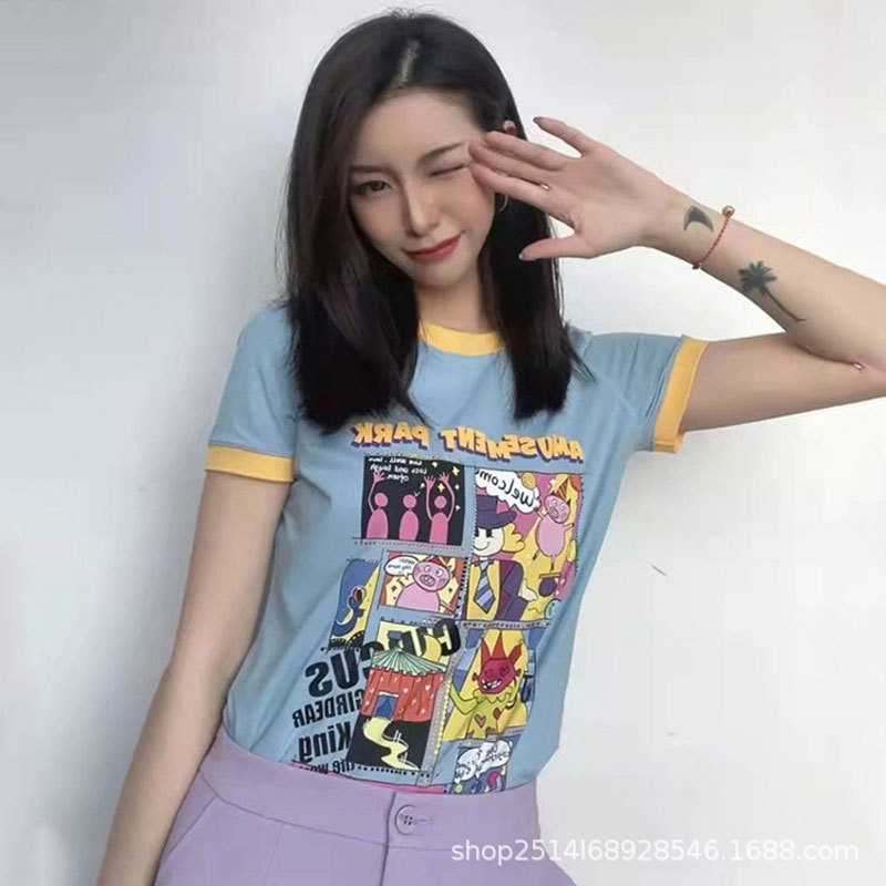 브라더스 뉴 여름 2023 올매치 슬림핏 올매치 캐주얼 카툰 프린트 반팔 티셔츠 여성 연령 감소 탑