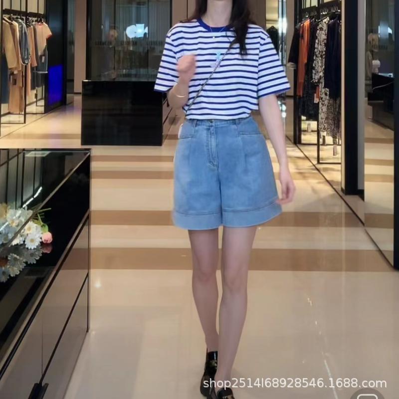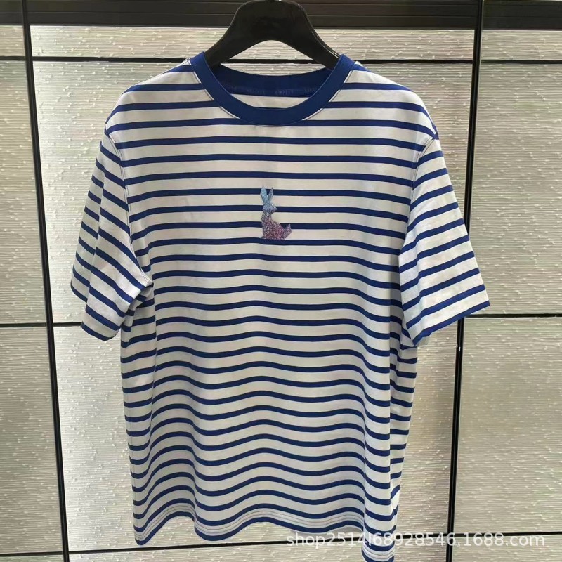브라더의 새로운 2023 여름 루즈한 달 모양의 토끼 라운드 넥 블루와 화이트 스트라이프 프린트 반팔 티셔츠 에이지 감소 탑스토어 가기