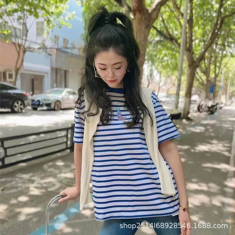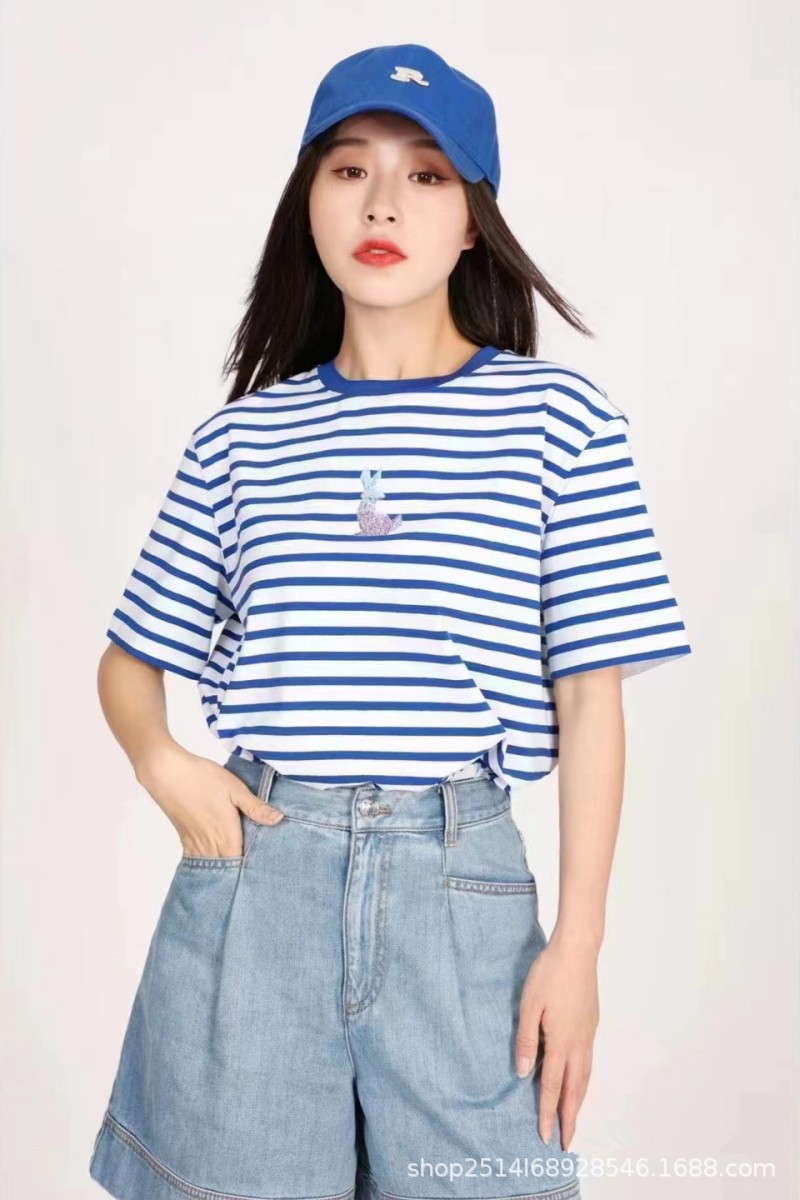 브라더의 새로운 2023 여름 루즈한 달 모양의 토끼 라운드 넥 블루와 화이트 스트라이프 프린트 반팔 티셔츠 에이지 감소 탑