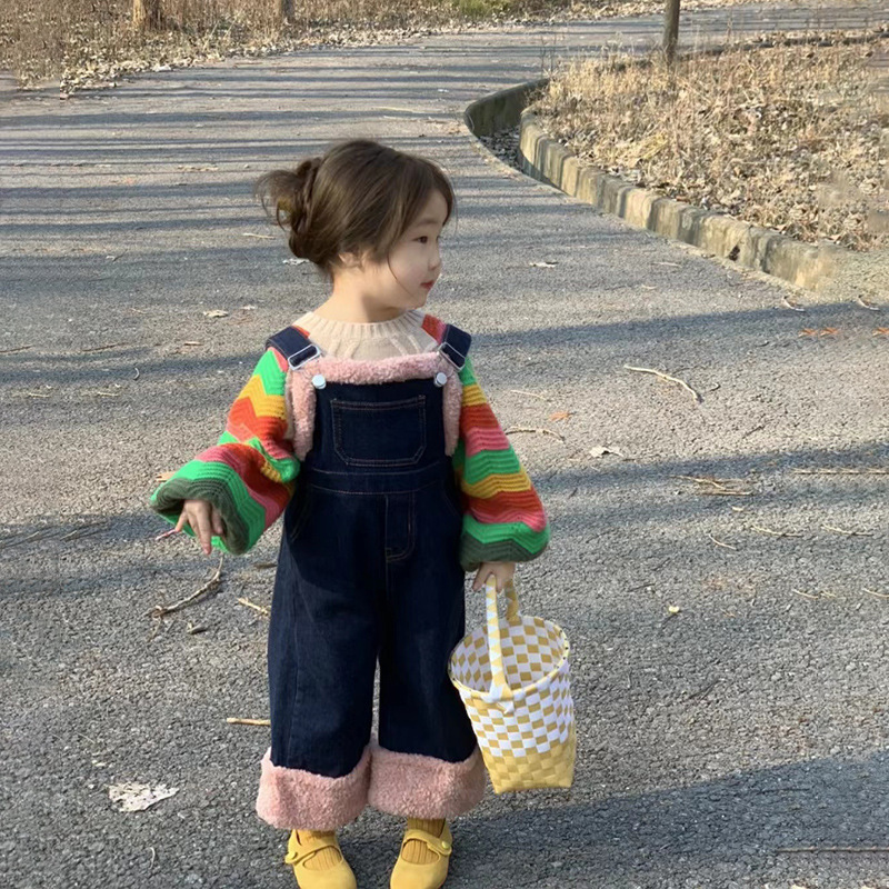 봄 가을 여아용 패셔너블한 데님 팬츠 아동 캐주얼 바지 여자 아기용 멜빵바지 플리스 안감