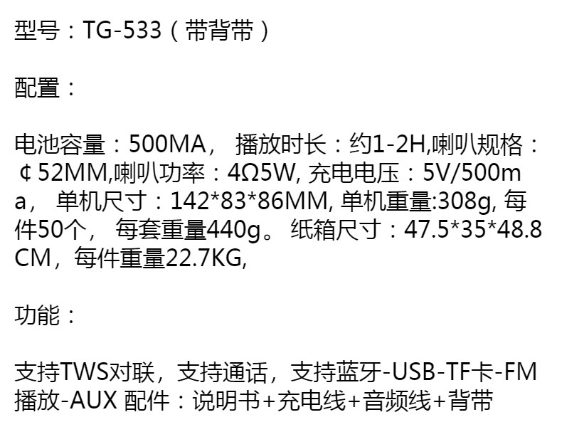 TG533 휴대용 숄더 스트랩 무거운 서브 우퍼 TWS 휴대 전화 무선 블루투스 스피커 휴대용 컴퓨터 카드 블루투스 스테레오