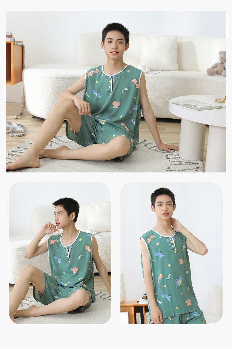 여름 잠옷 남자와 여자의 반팔 십대 홈 에어컨 면 실크 세트 큰 어린이 중학교 남자 학생을위한 얇은 만화스토어 가기