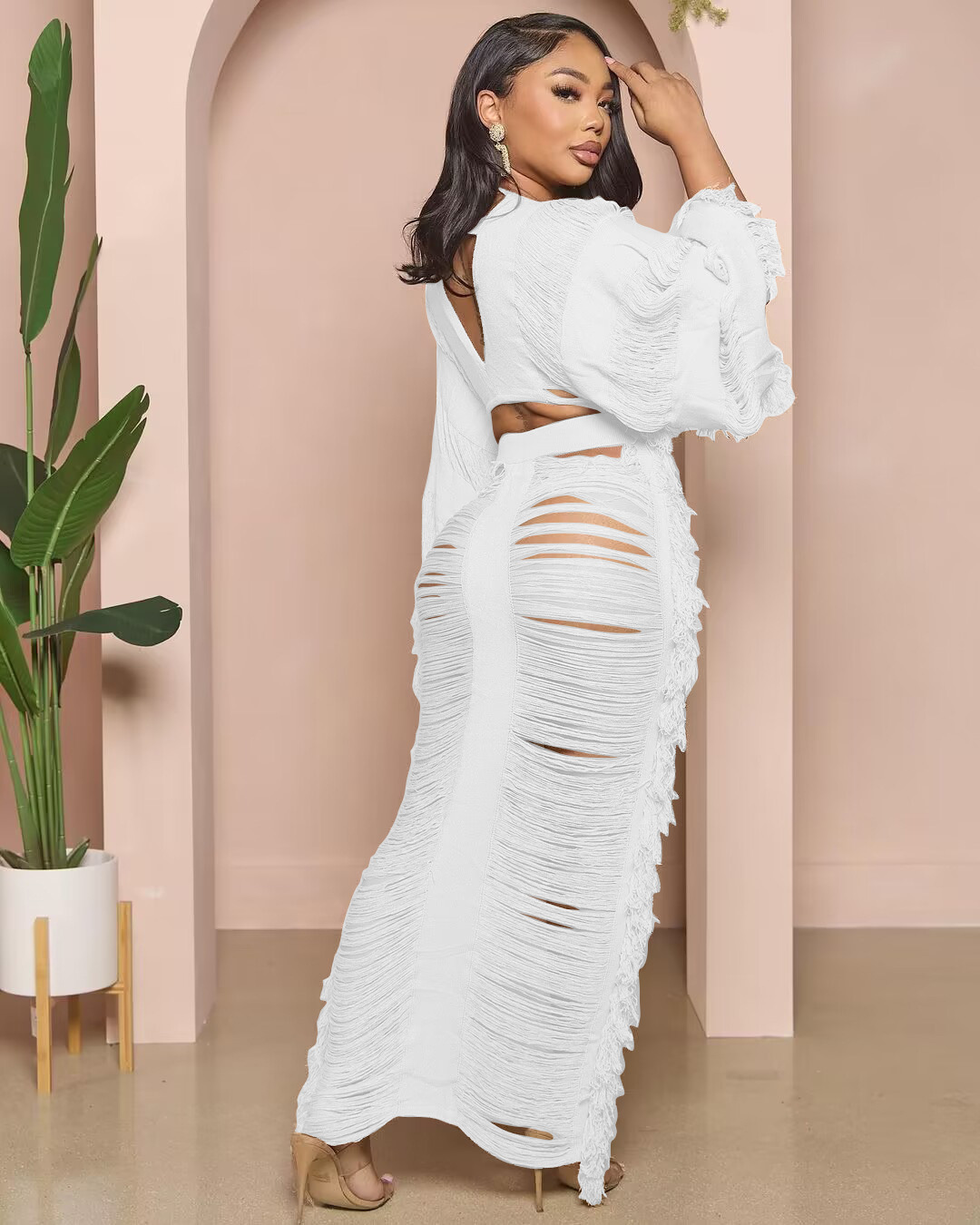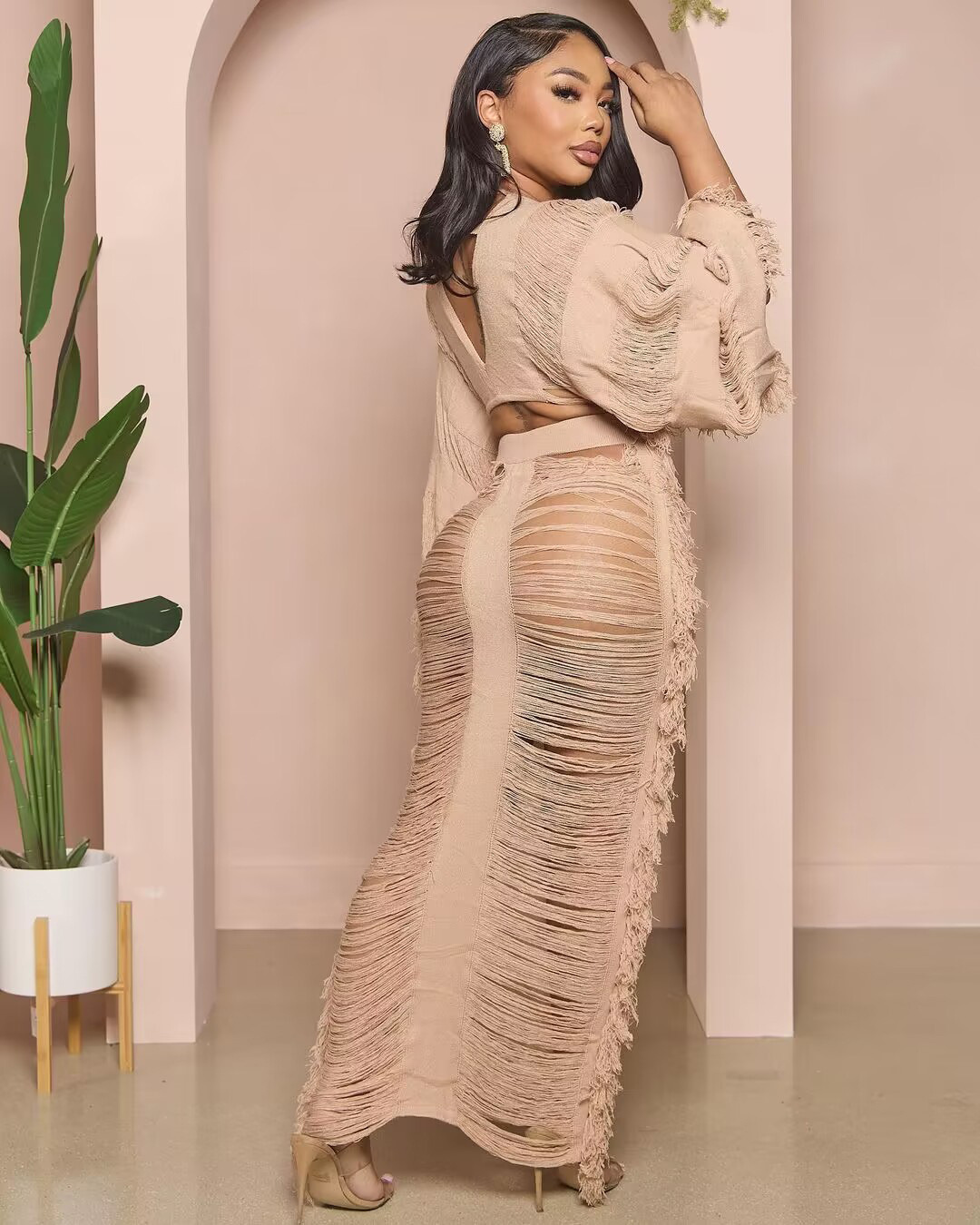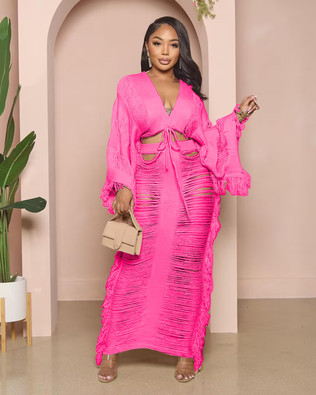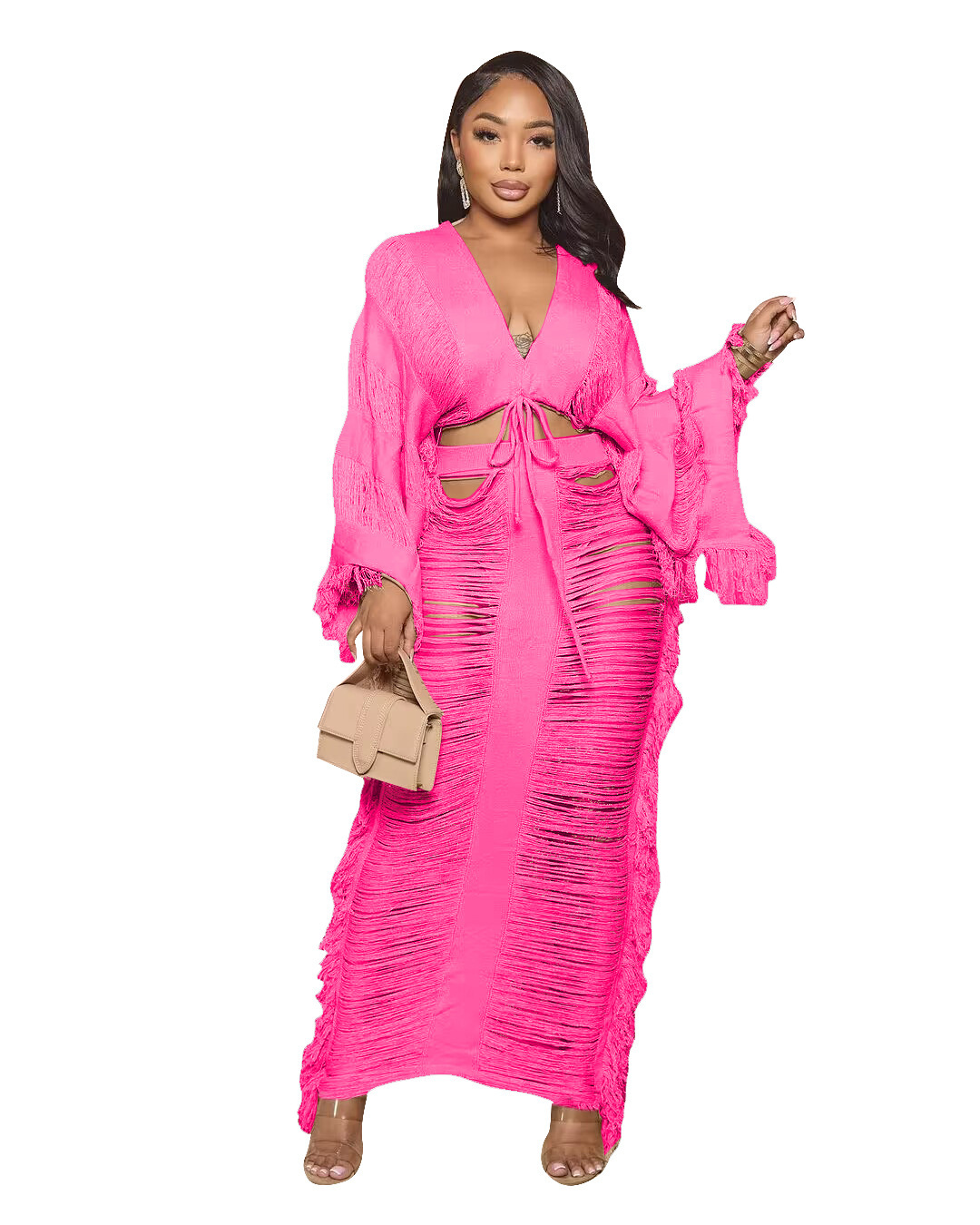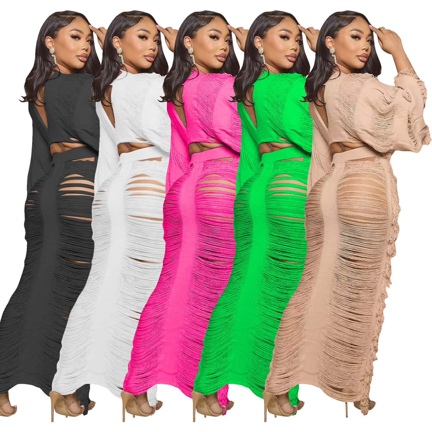 2023 국경 간 새로운 유럽 및 미국 여성 캐주얼 니트 섹시한 술 속이 빈 V 넥 레이스 업 긴팔 원피스 세트