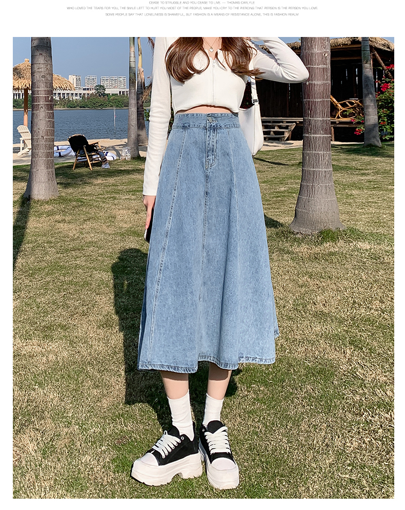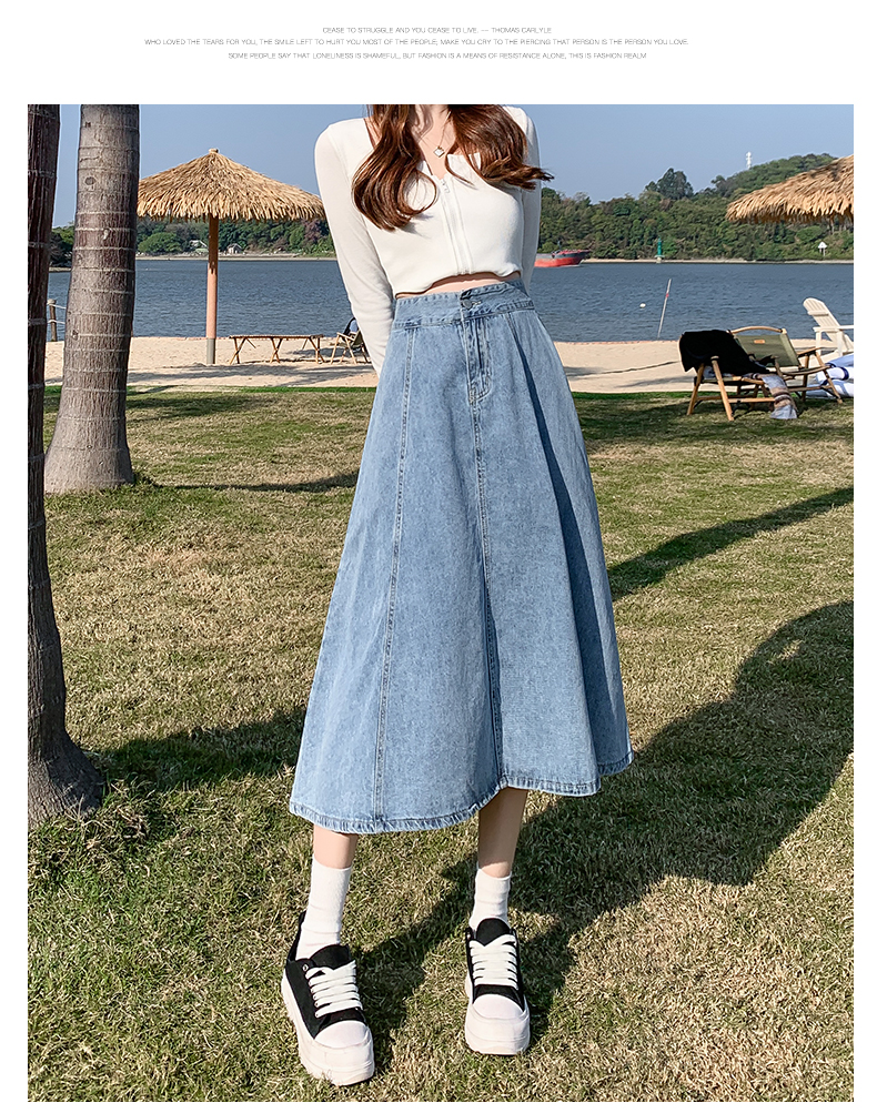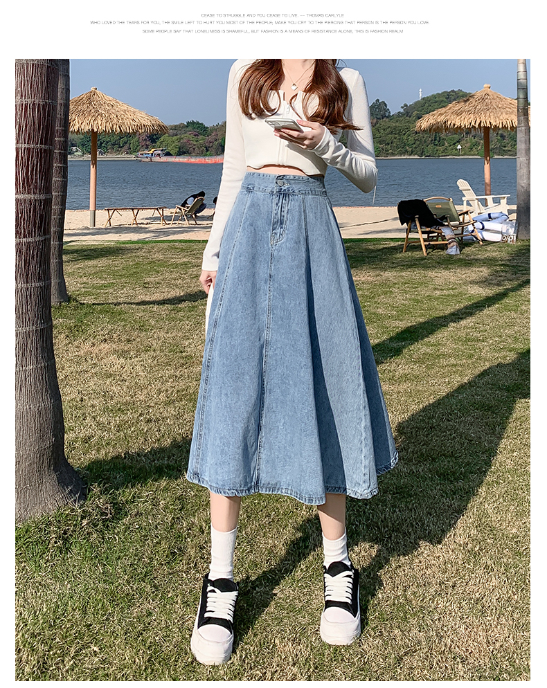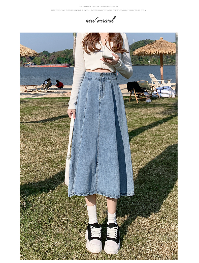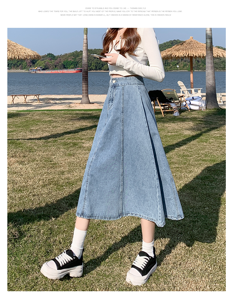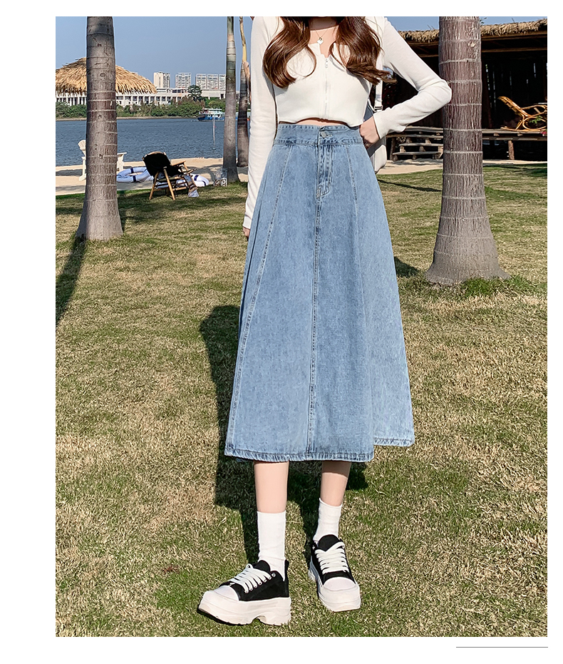 치마 여자의 긴 치마 2023 새로운 여름 중간 길이 데님 치마 주름 높은 허리 치마 라인 우산 치마스토어 가기