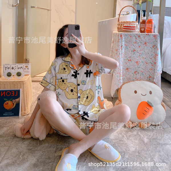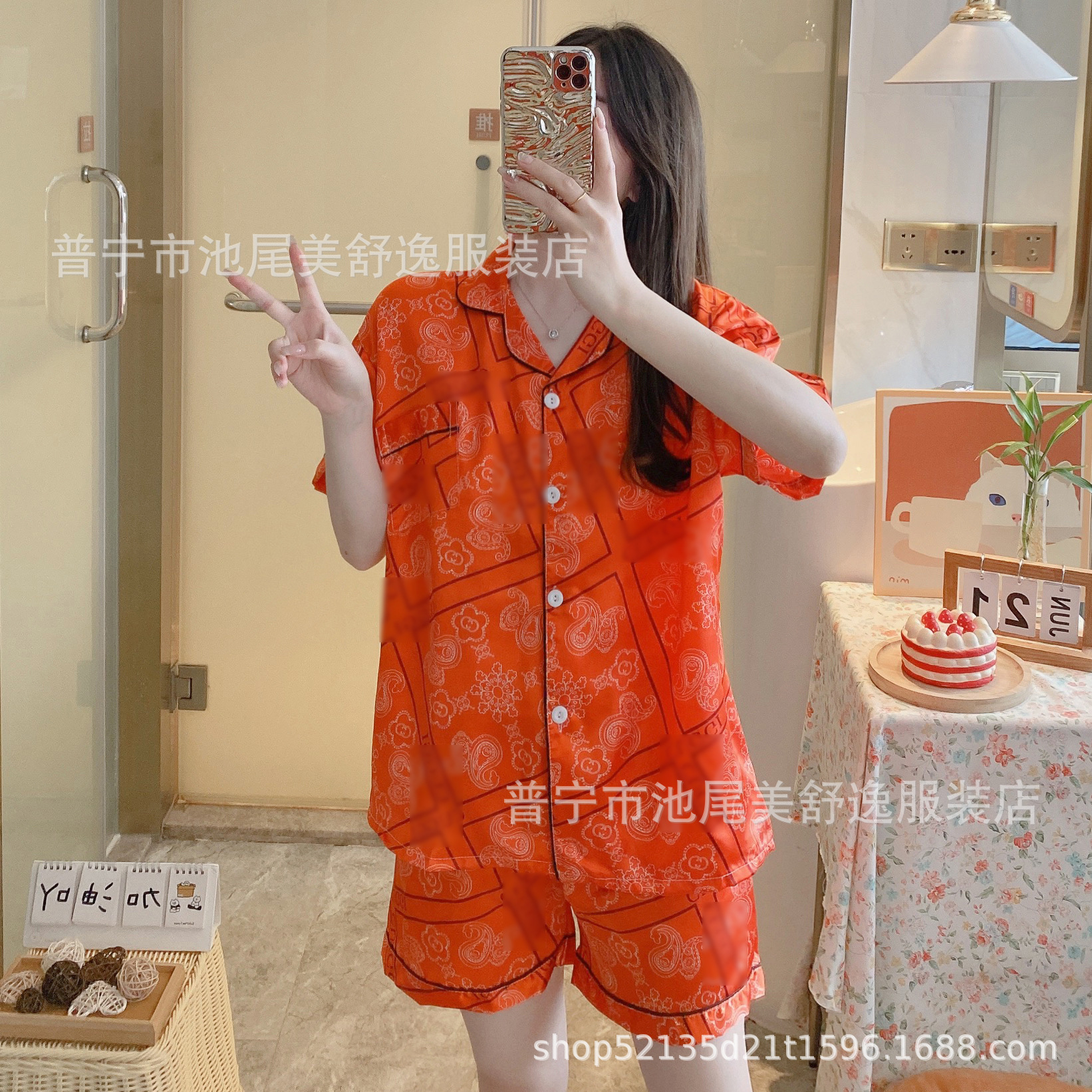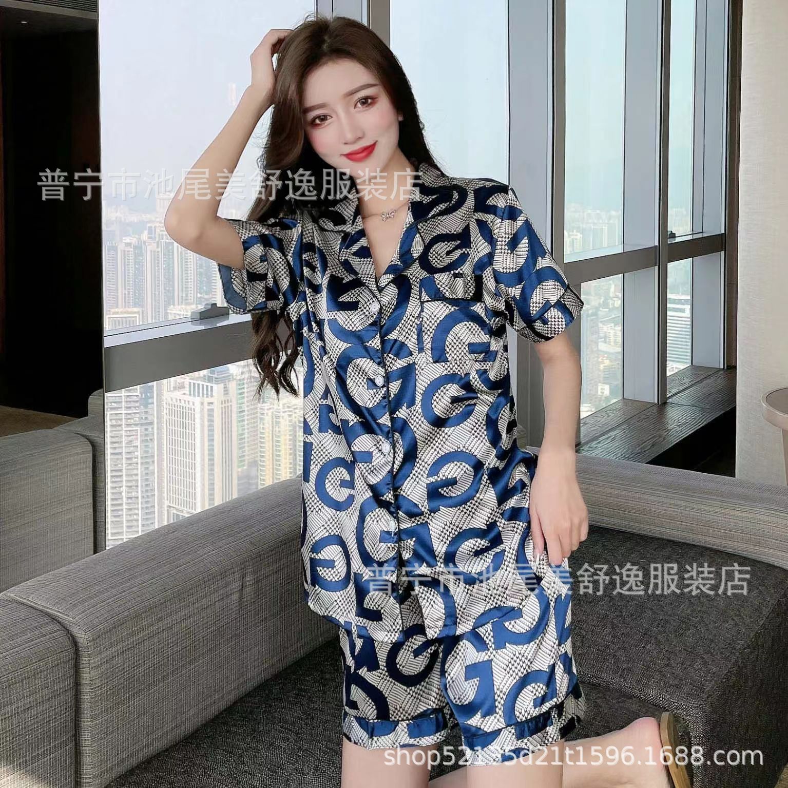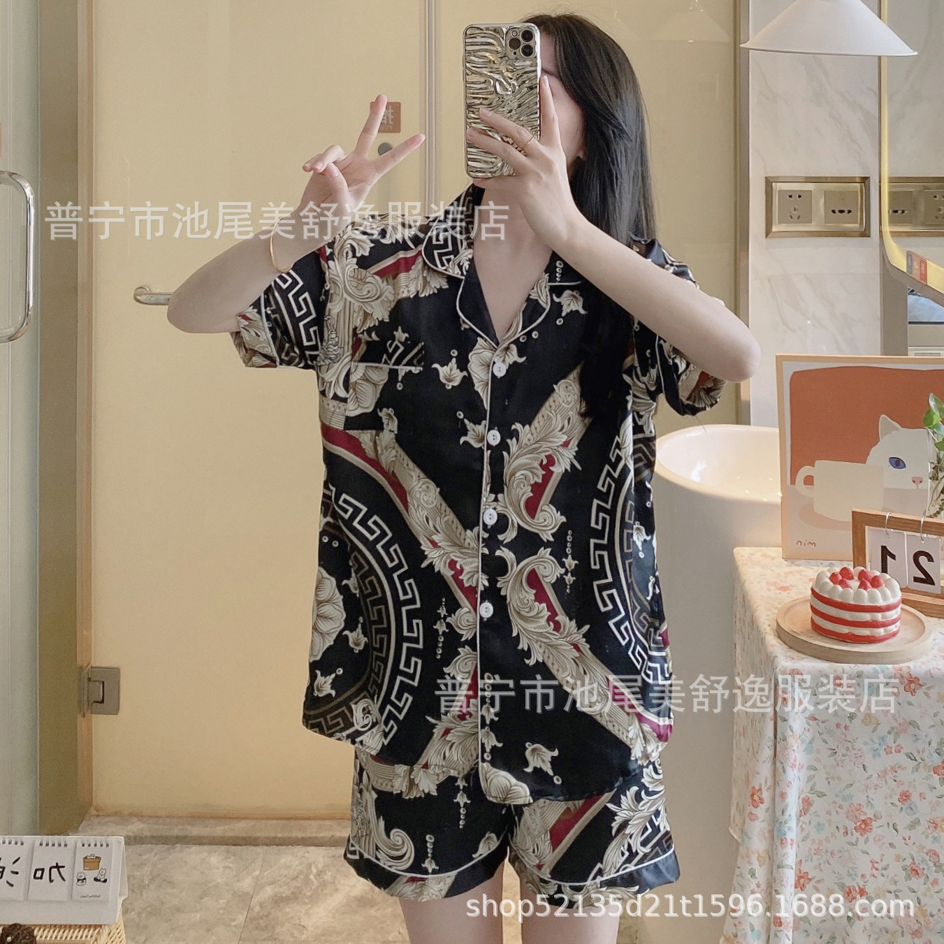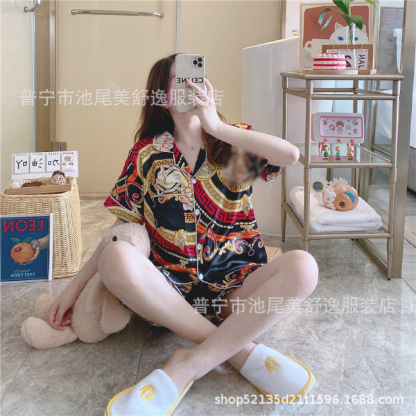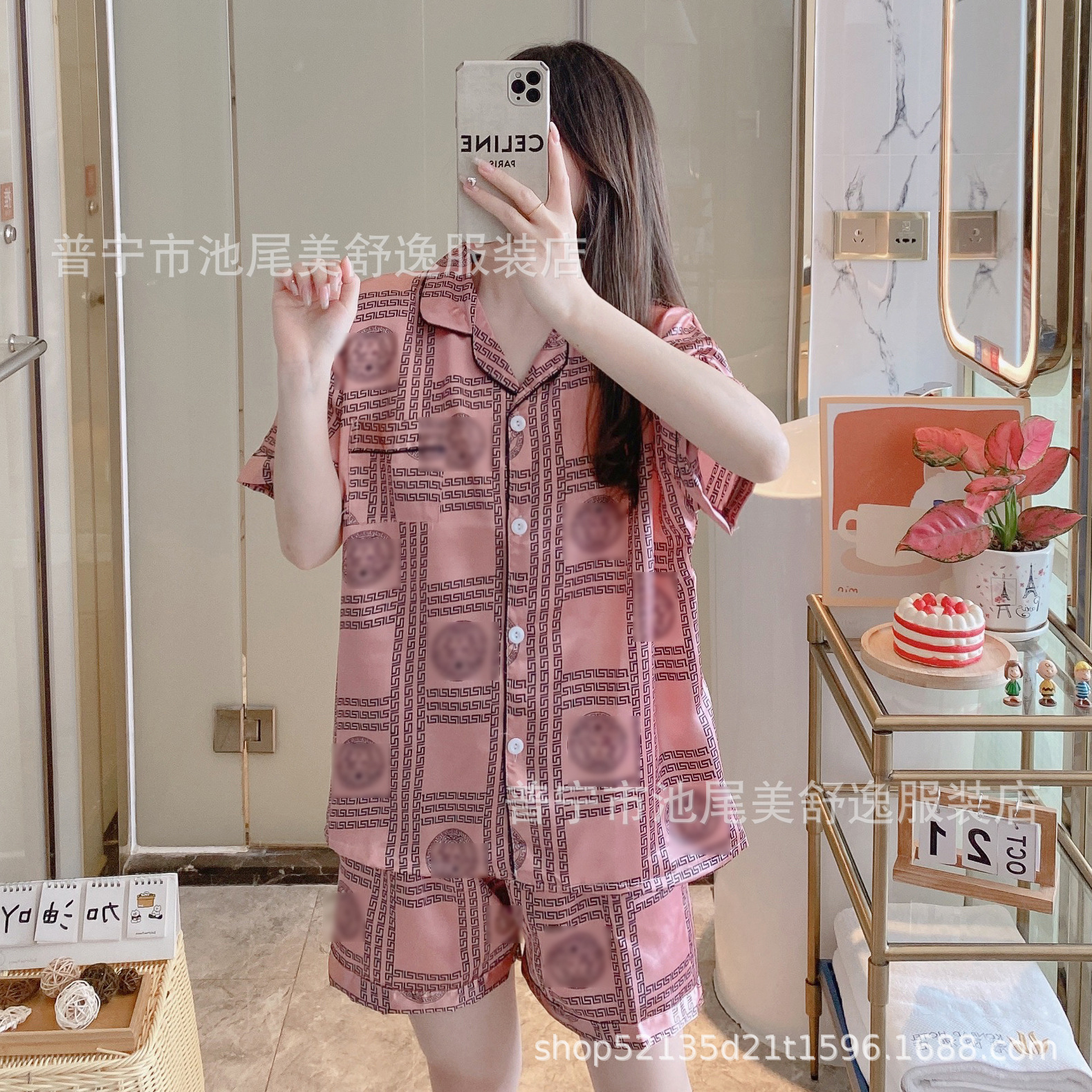 유럽과 미국 대외 무역 도매 공장 아이스 실크 잠옷 여성 여름 반팔 반바지 모조 실크 카디건 가정 옷 세트 여성스토어 가기