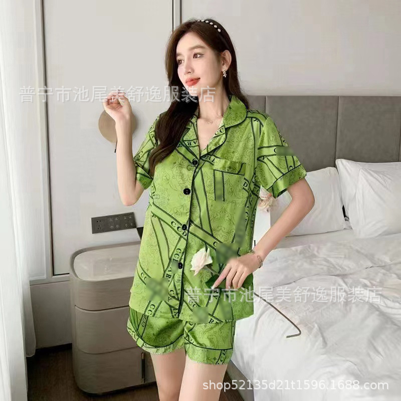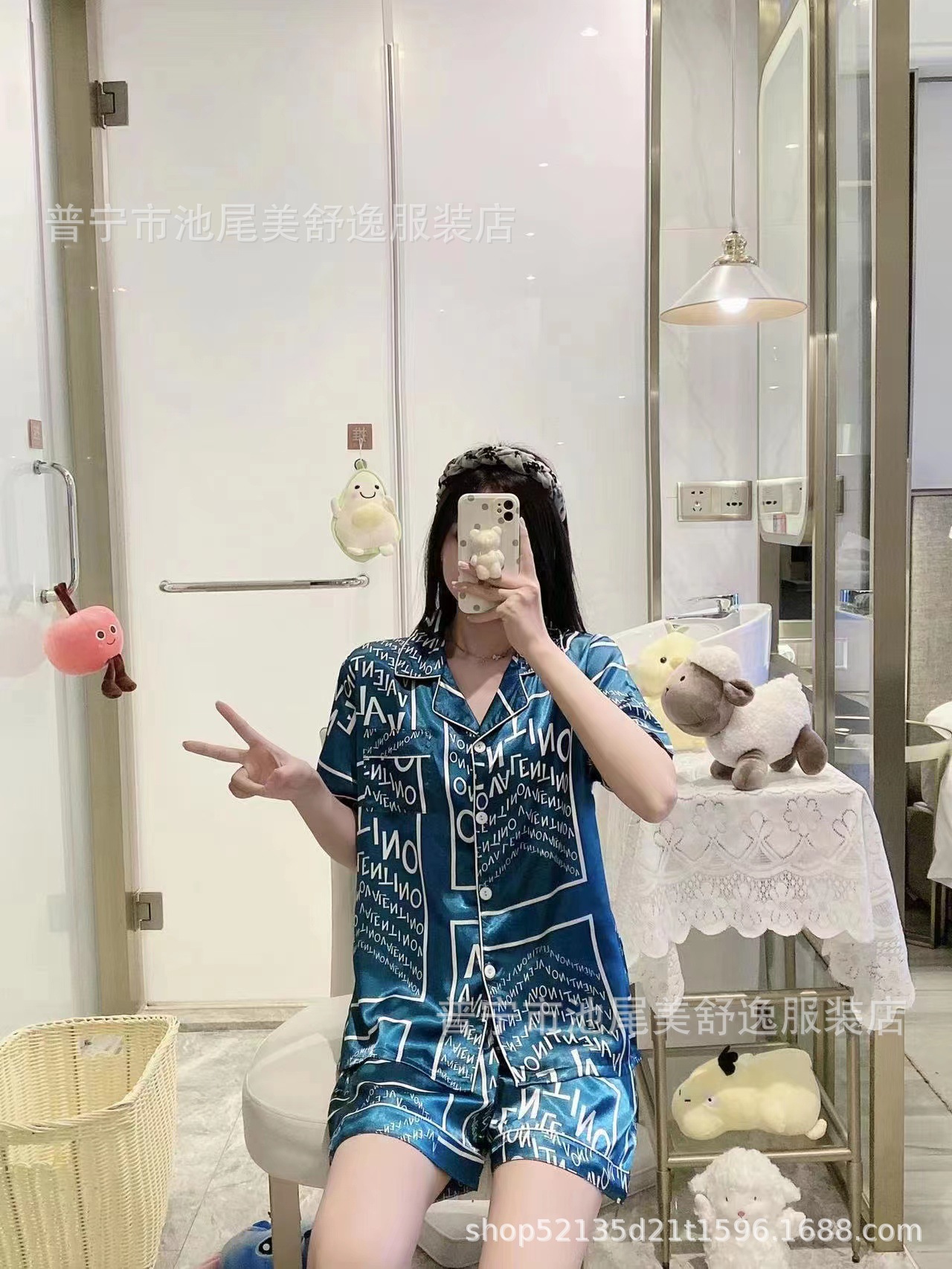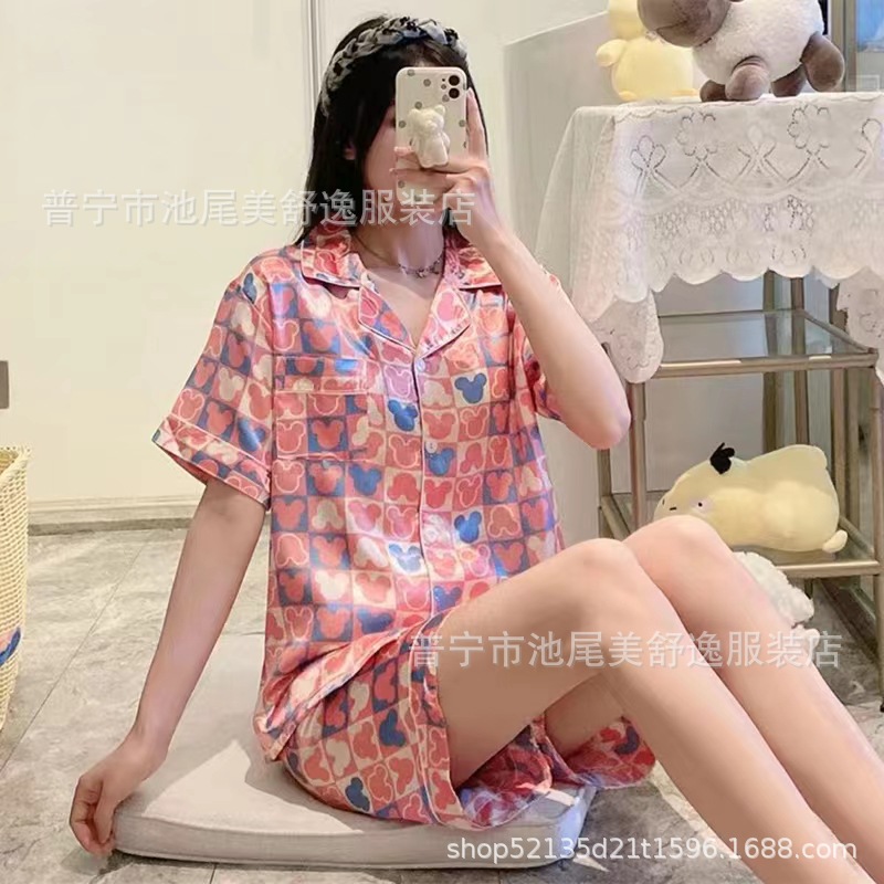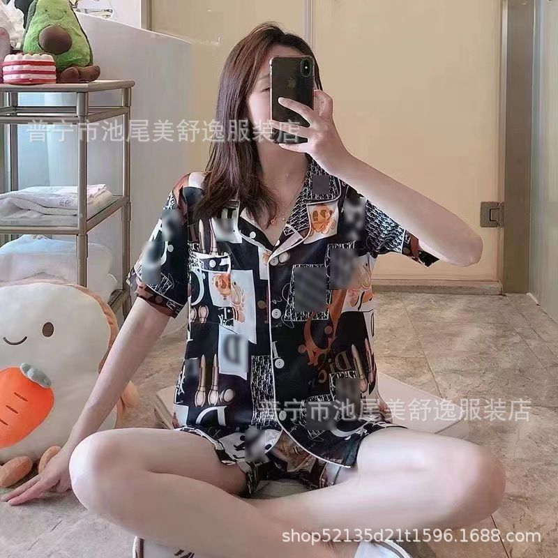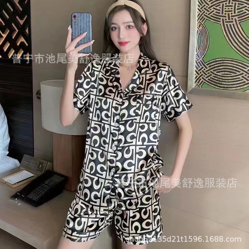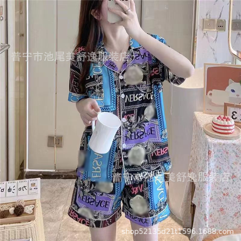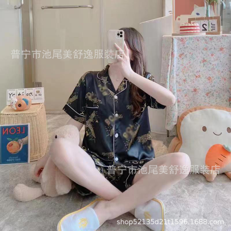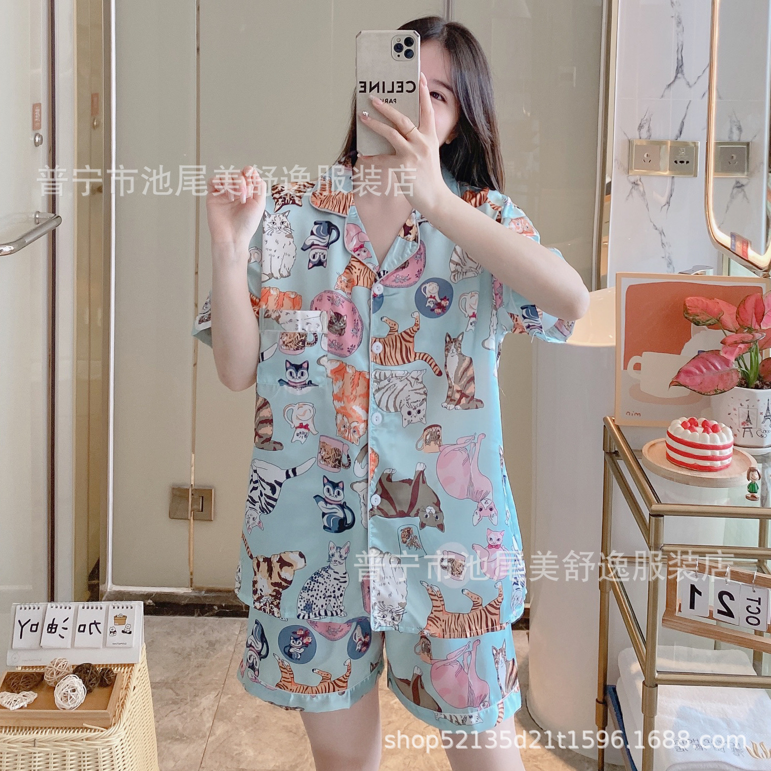 유럽과 미국 대외 무역 도매 공장 아이스 실크 잠옷 여성 여름 반팔 반바지 모조 실크 카디건 가정 옷 세트 여성스토어 가기