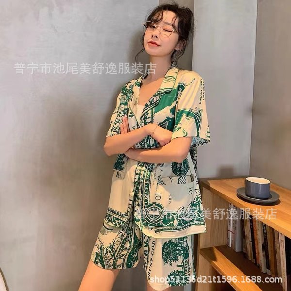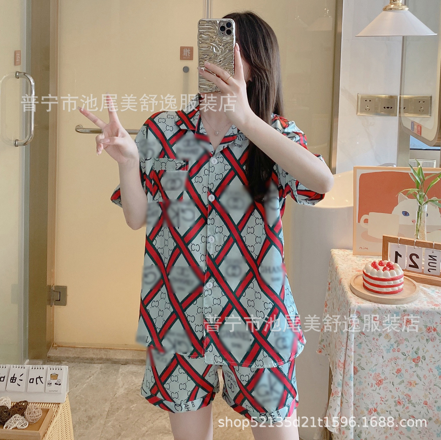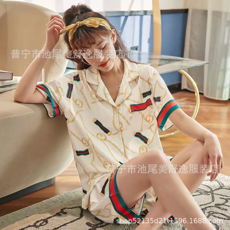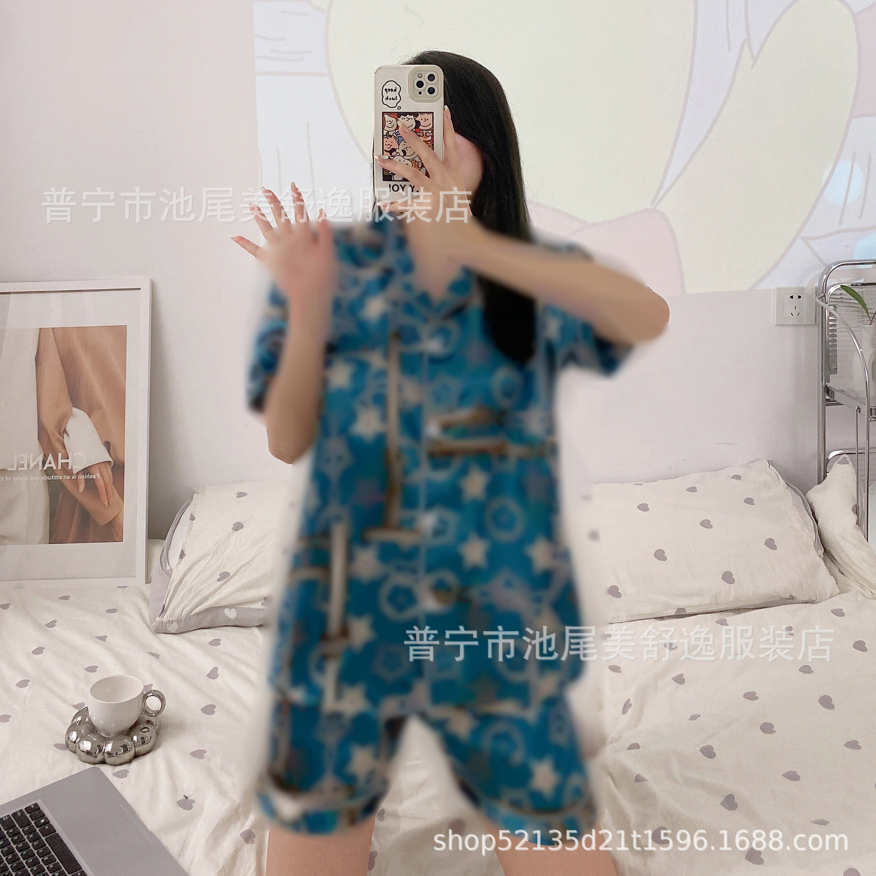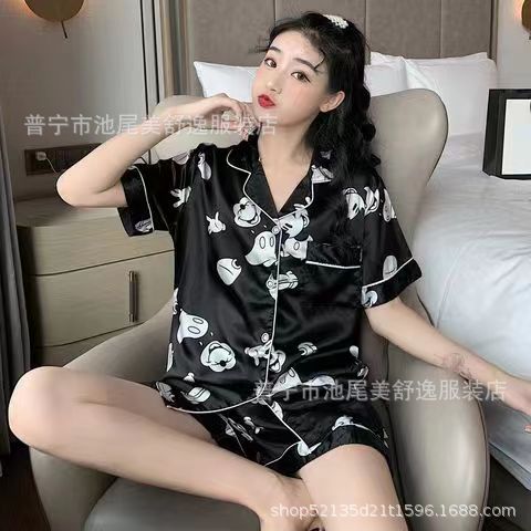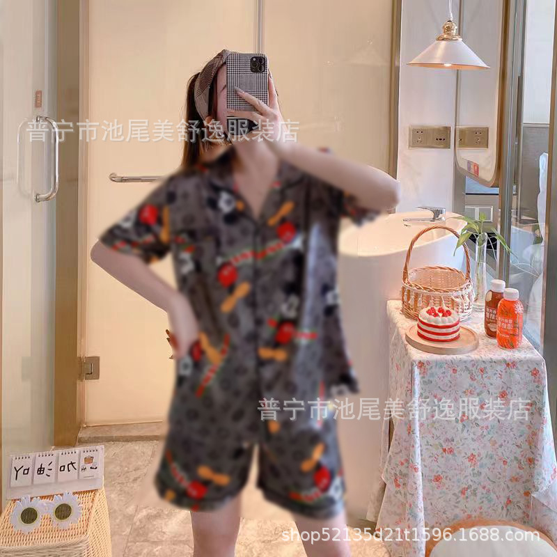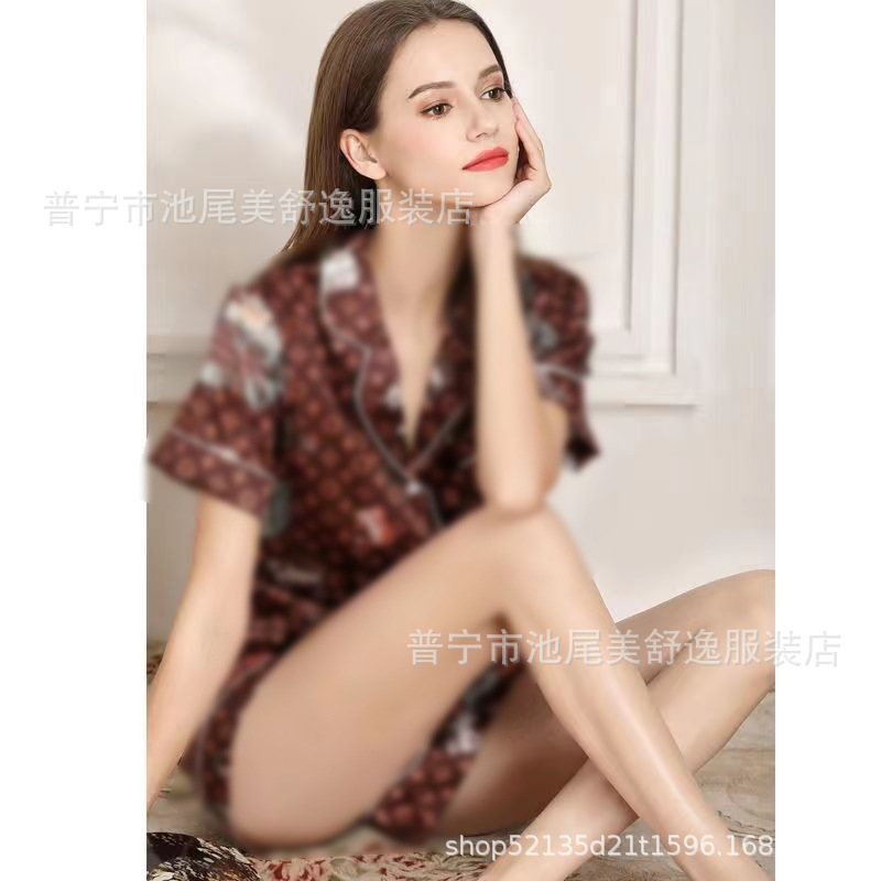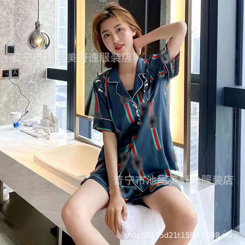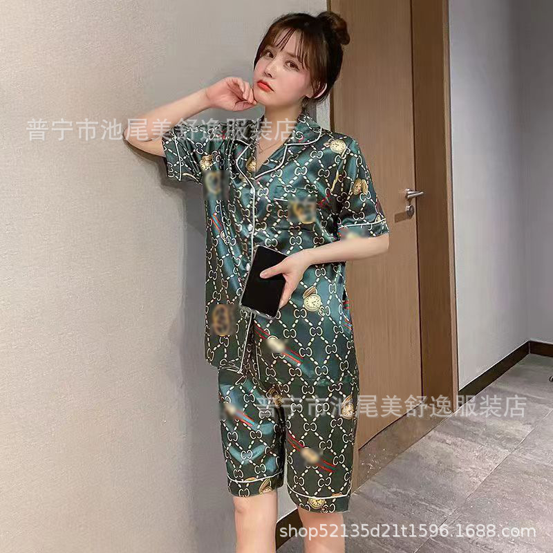 유럽과 미국 대외 무역 도매 공장 아이스 실크 잠옷 여성 여름 반팔 반바지 모조 실크 카디건 가정 옷 세트 여성스토어 가기