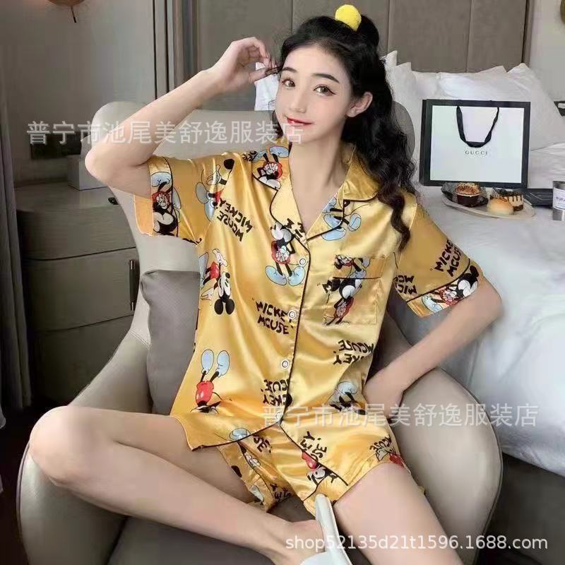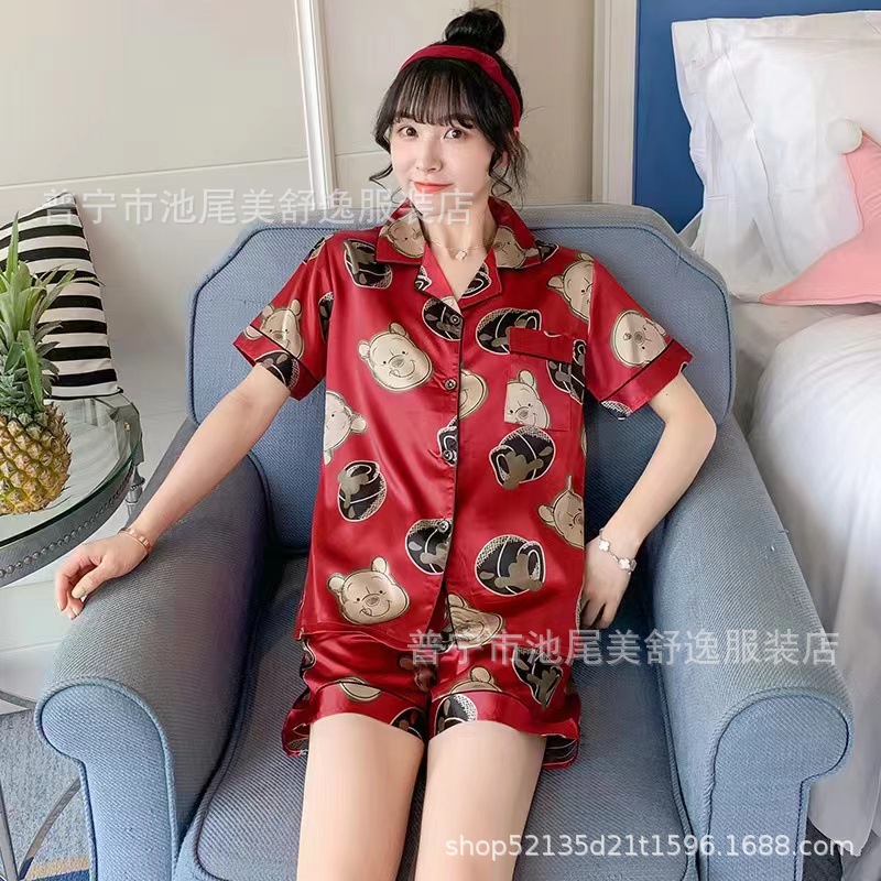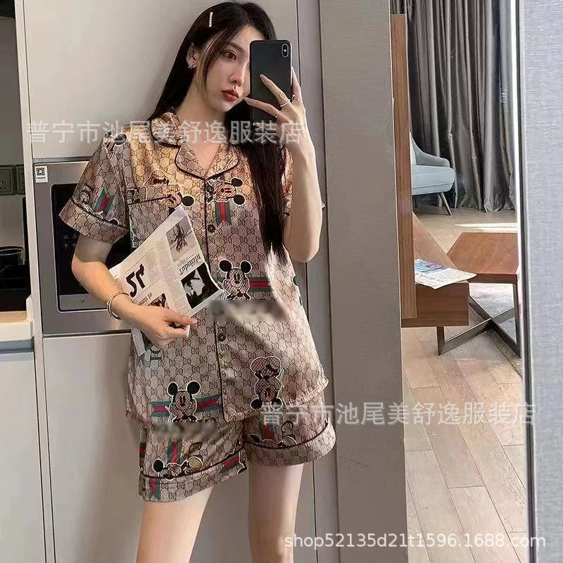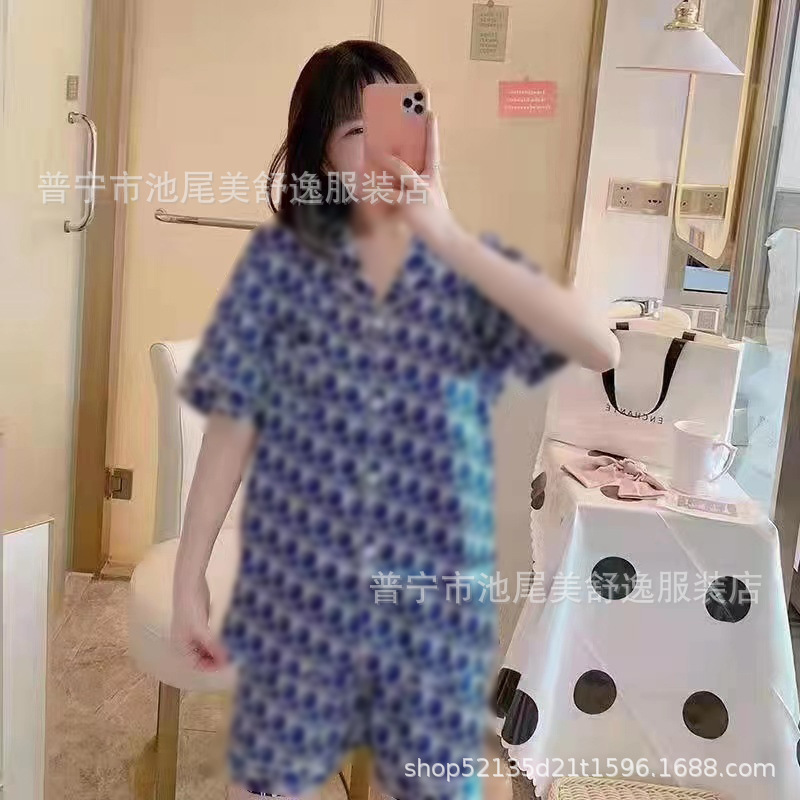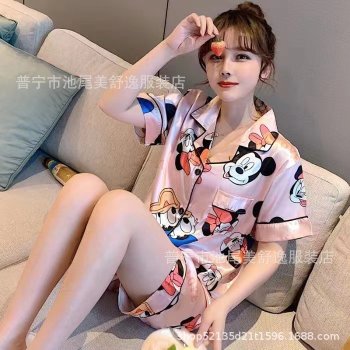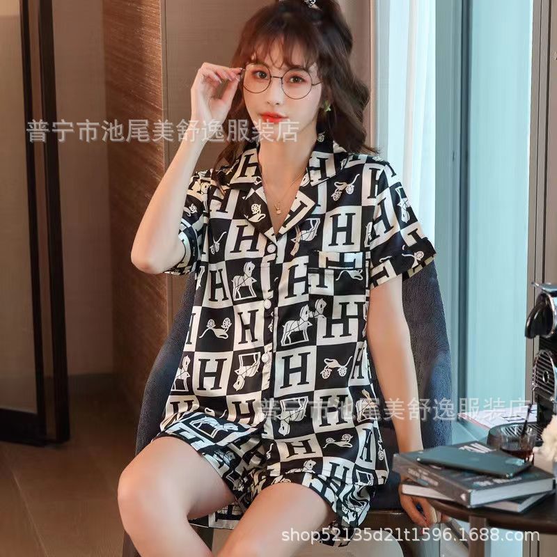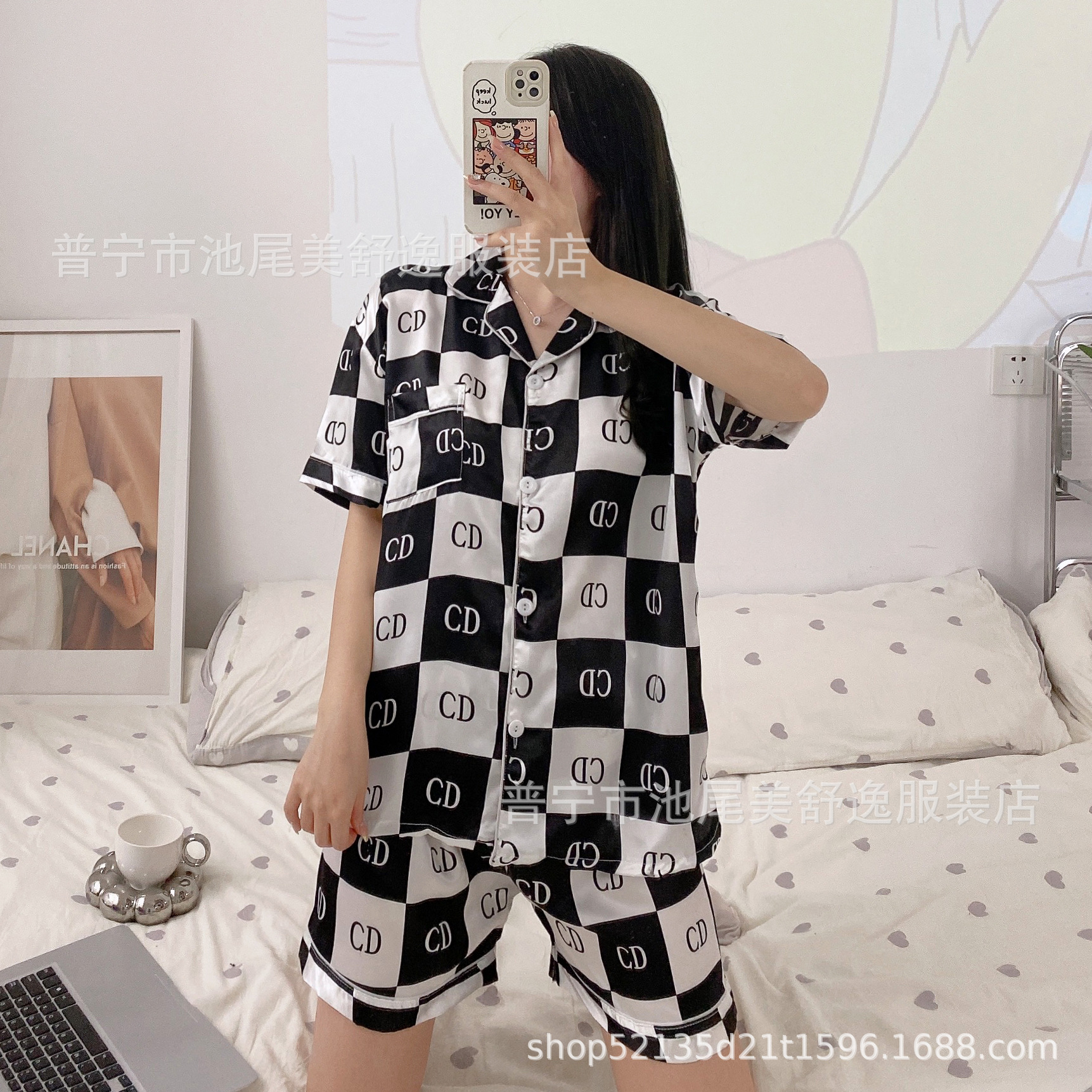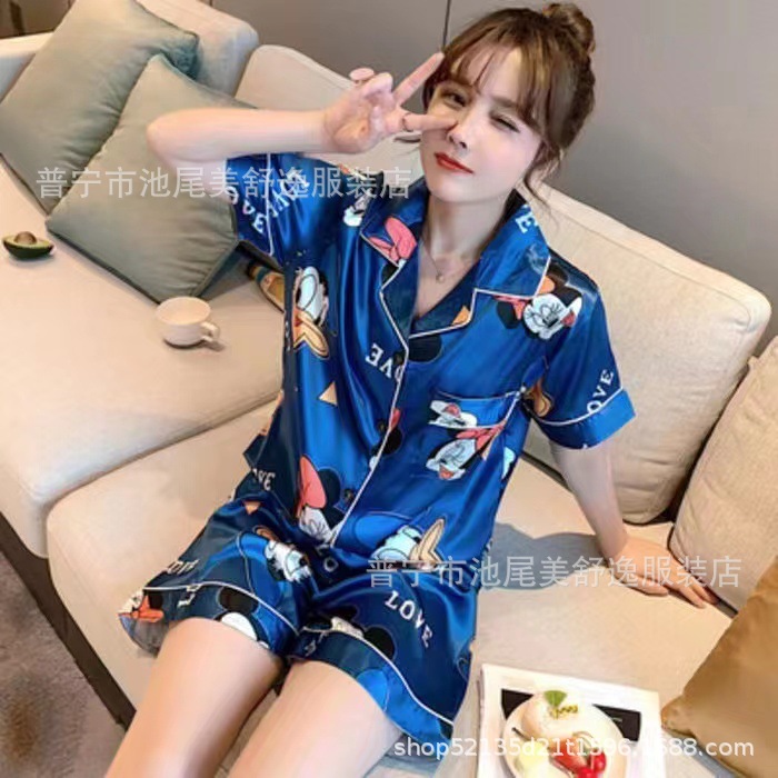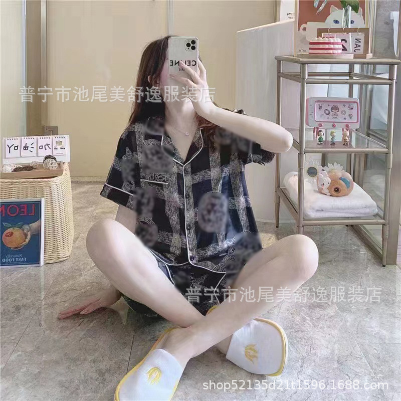유럽과 미국 대외 무역 도매 공장 아이스 실크 잠옷 여성 여름 반팔 반바지 모조 실크 카디건 가정 옷 세트 여성스토어 가기