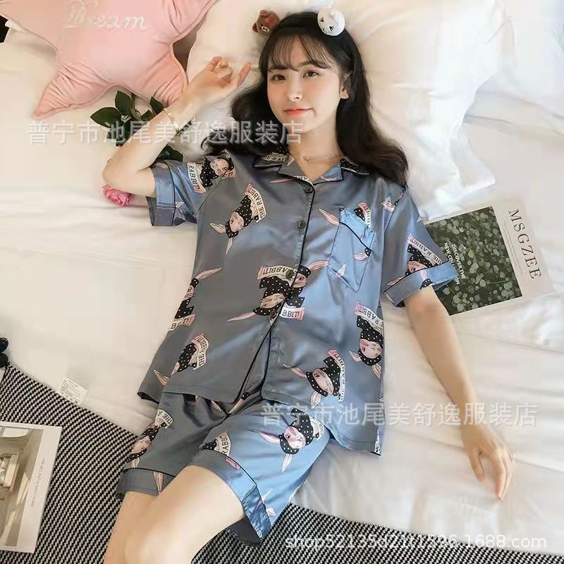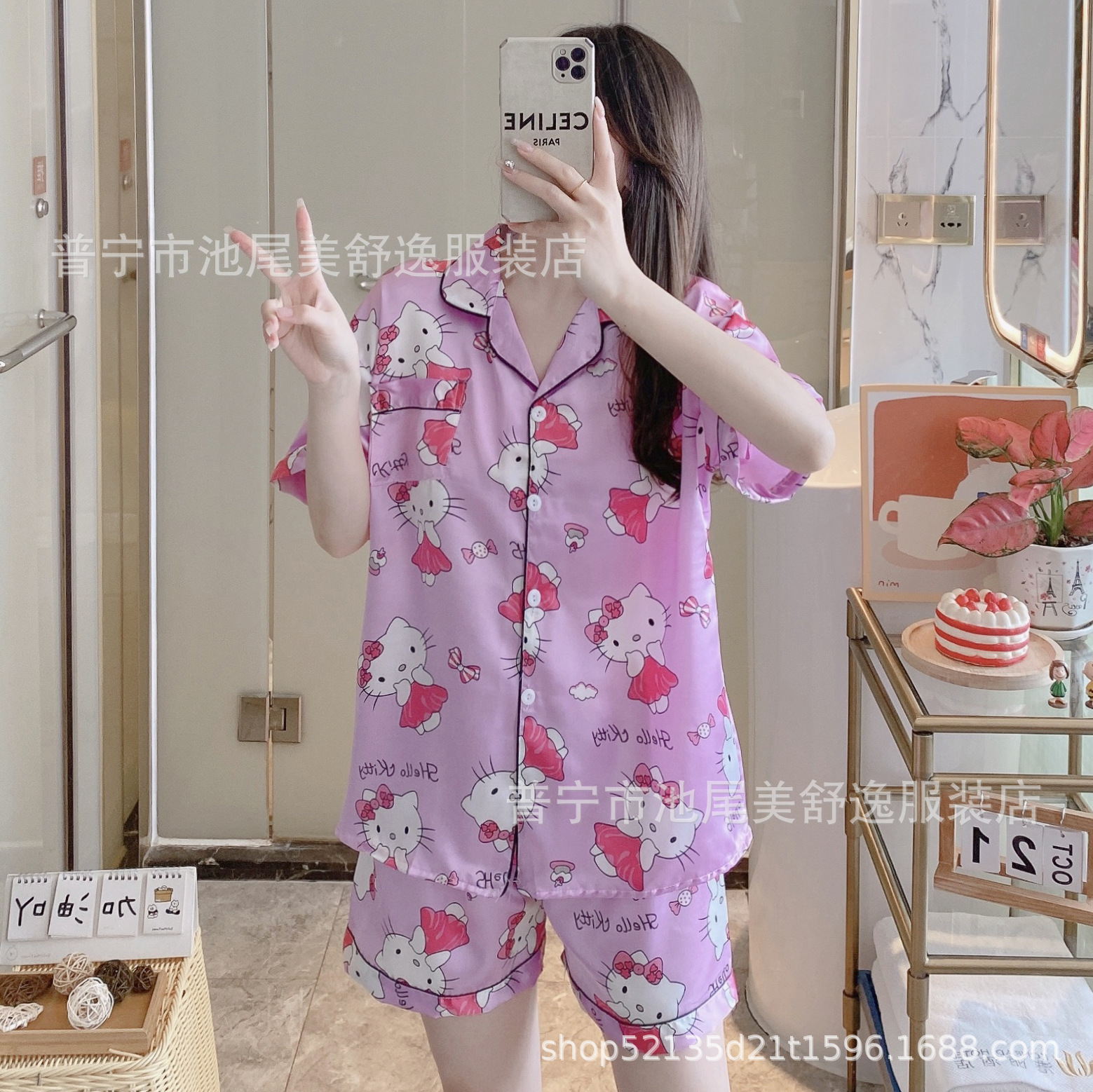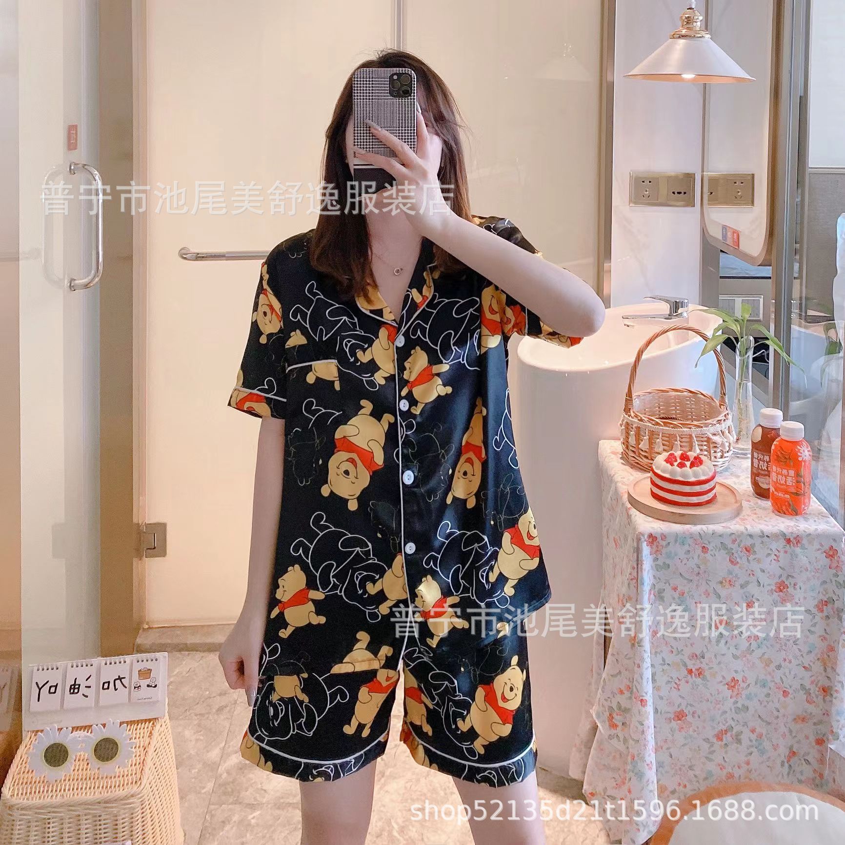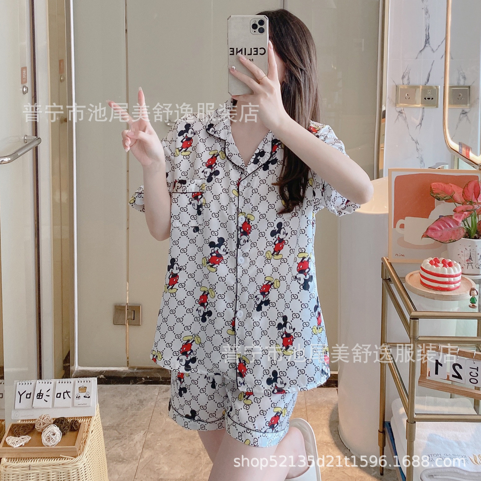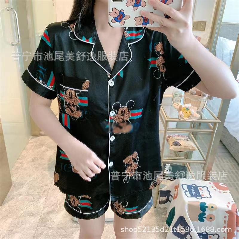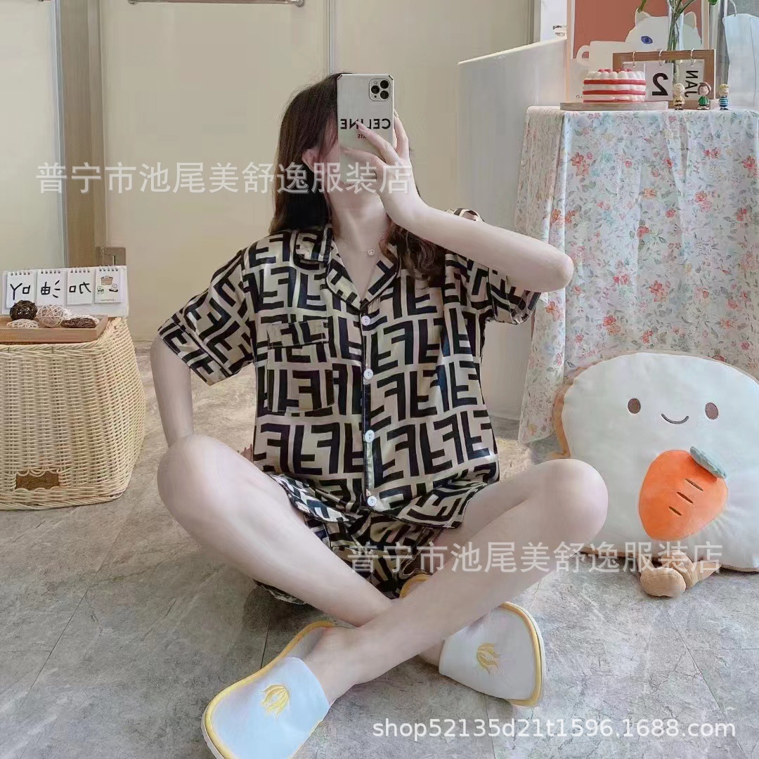 유럽과 미국 대외 무역 도매 공장 아이스 실크 잠옷 여성 여름 반팔 반바지 모조 실크 카디건 가정 옷 세트 여성스토어 가기