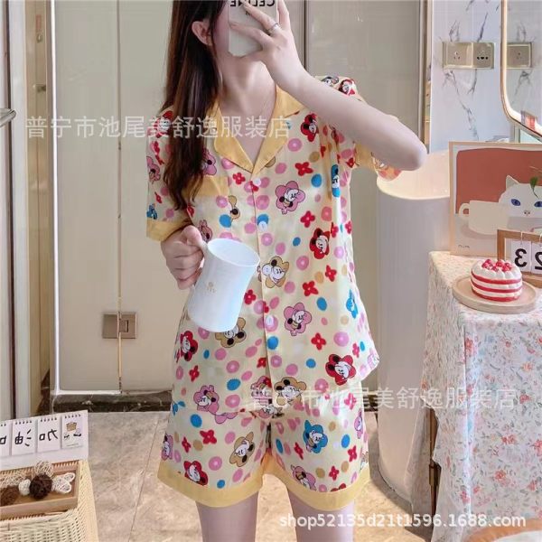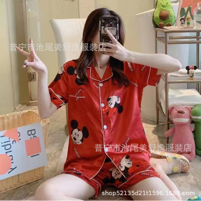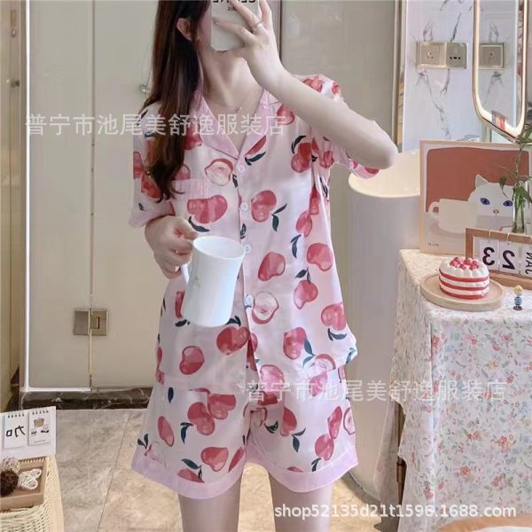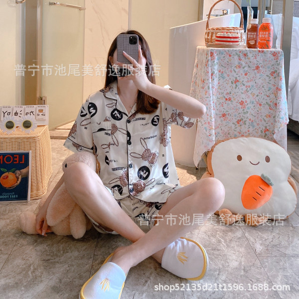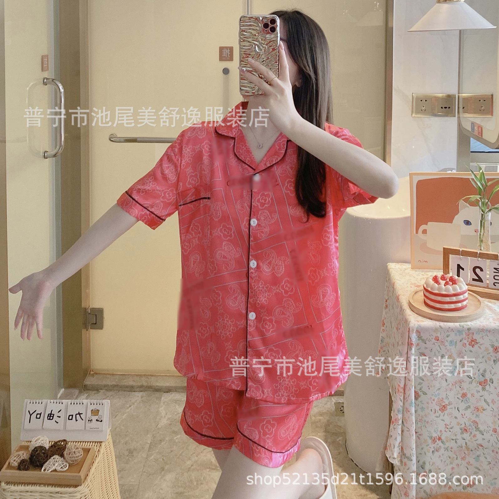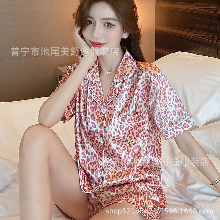 유럽과 미국 대외 무역 도매 공장 아이스 실크 잠옷 여성 여름 반팔 반바지 모조 실크 카디건 가정 옷 세트 여성