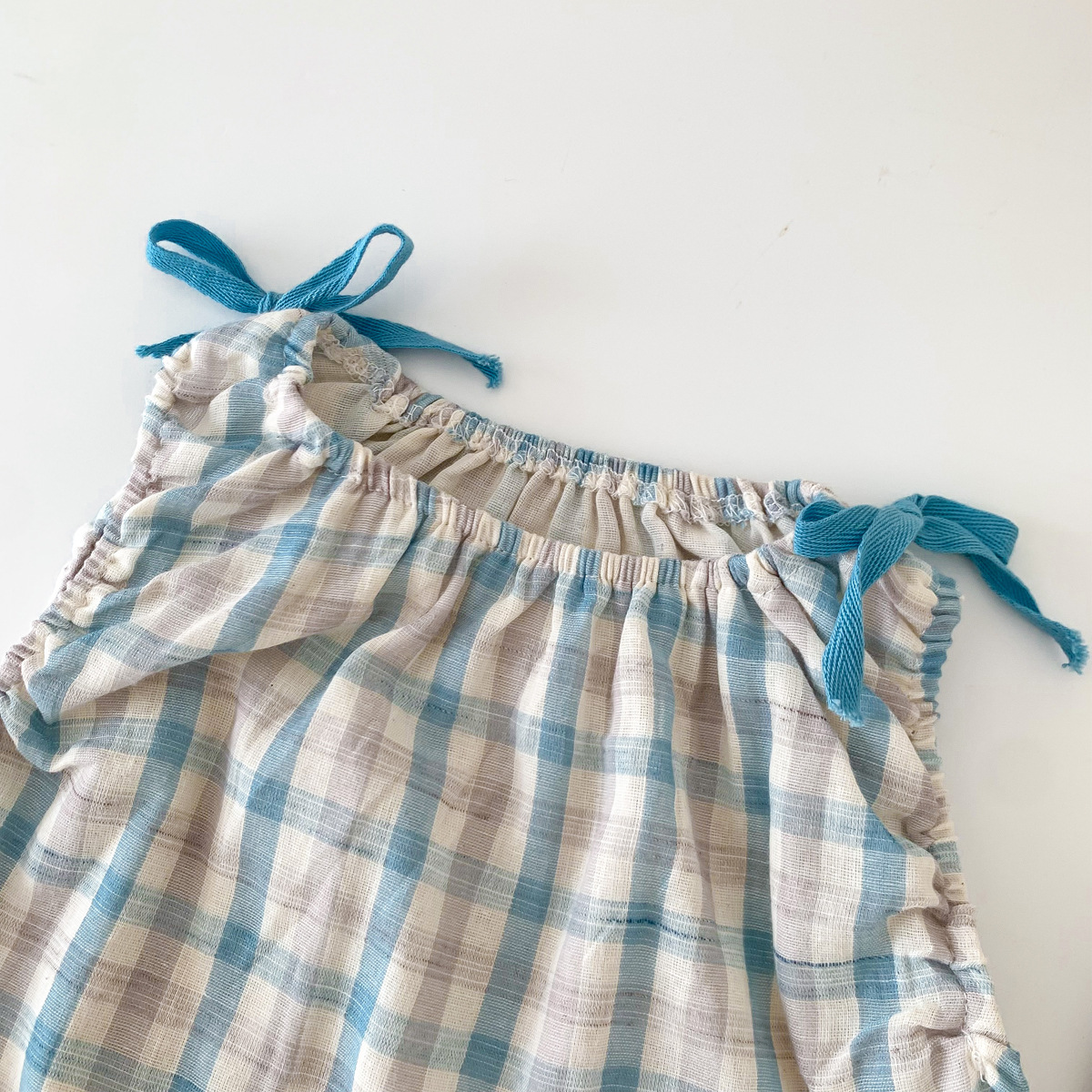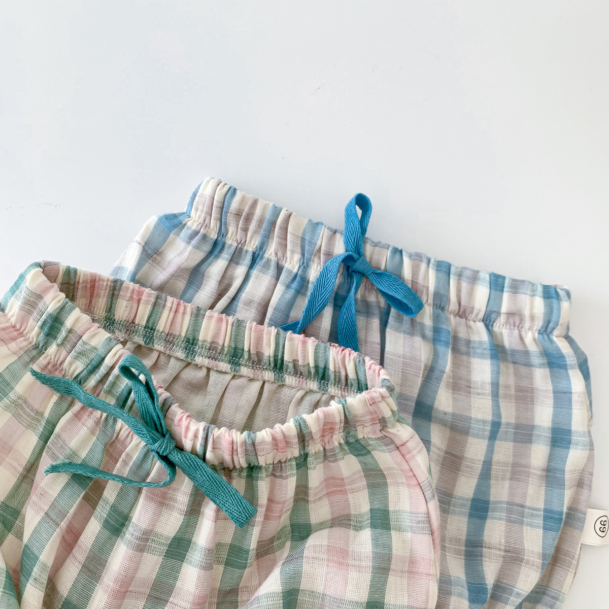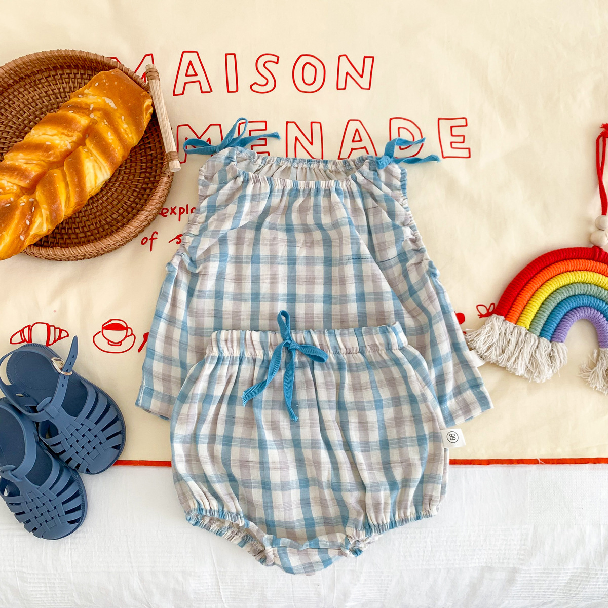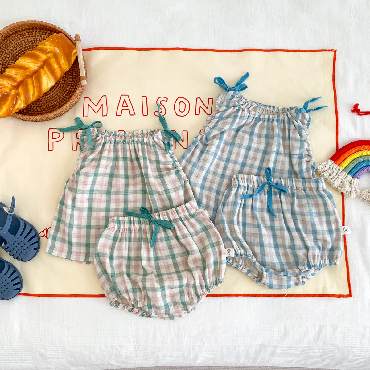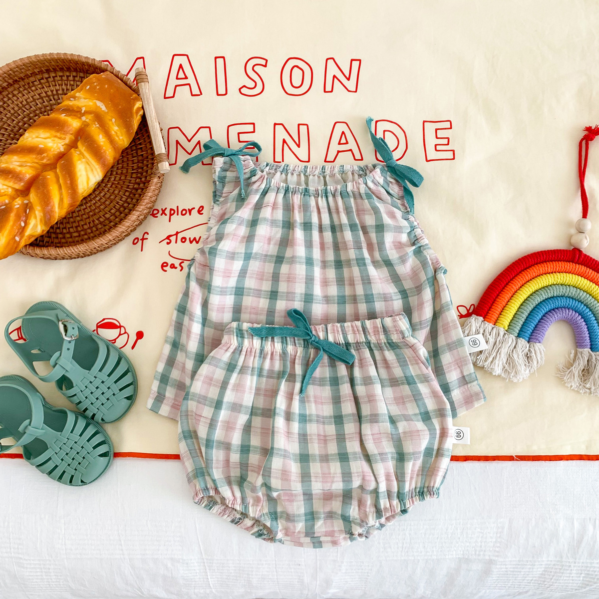 In 한국식 여름 새로운 아기 소녀 대비 격자 무늬 세트 아기 민소매 반바지 얇은 투피스 세트