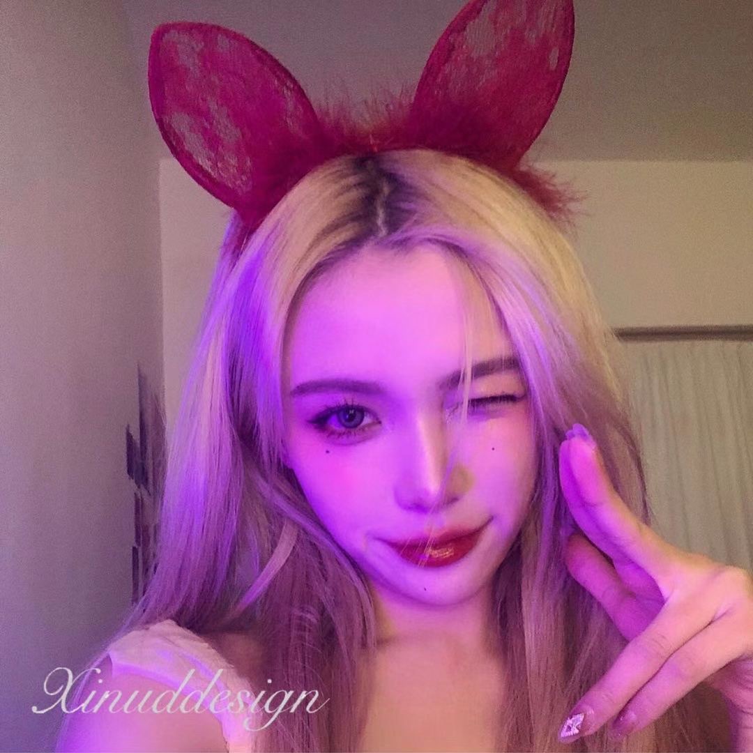 • 레이스 베일 토끼 귀 머리띠 (레드)