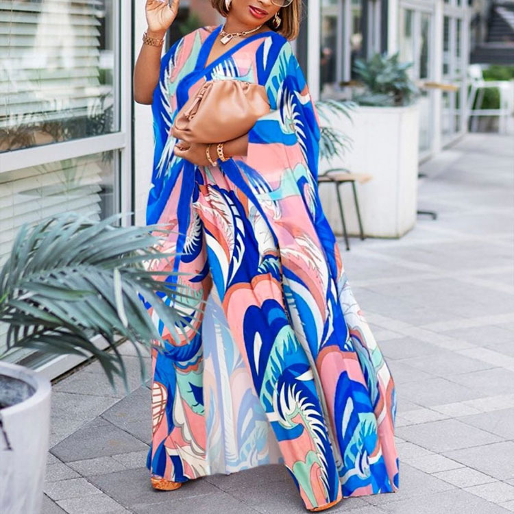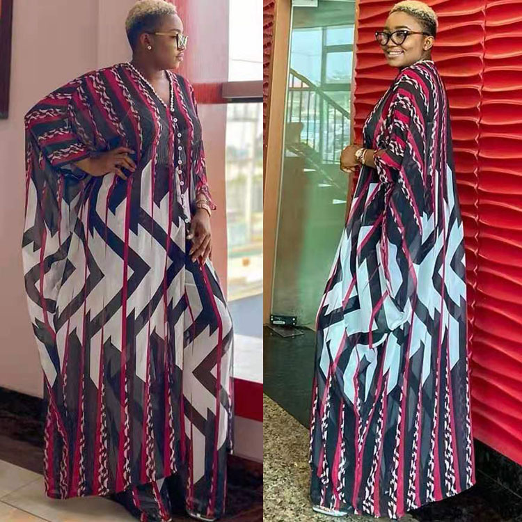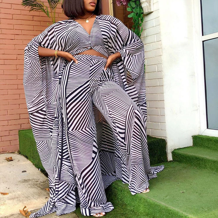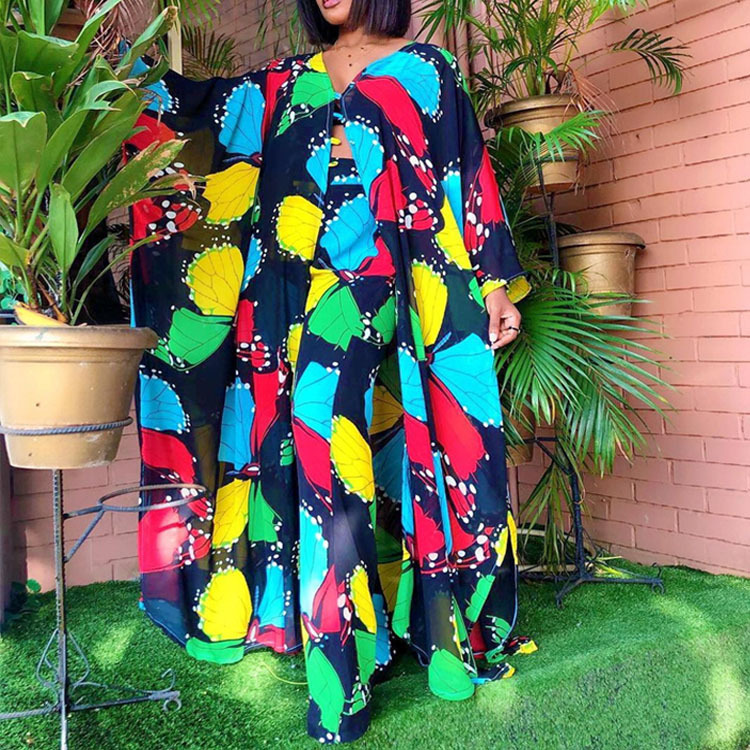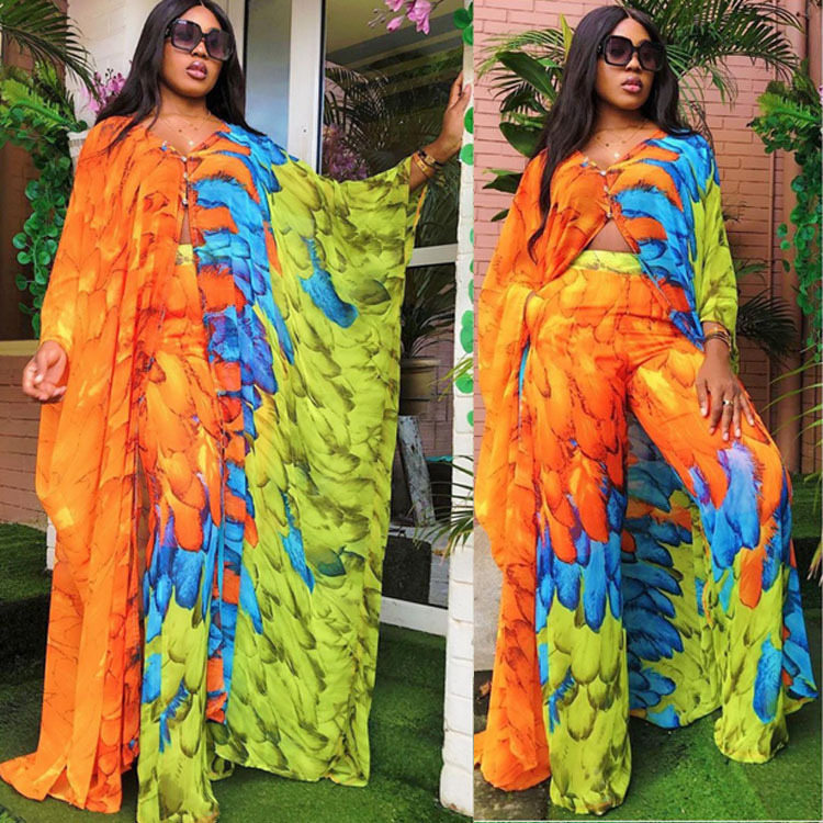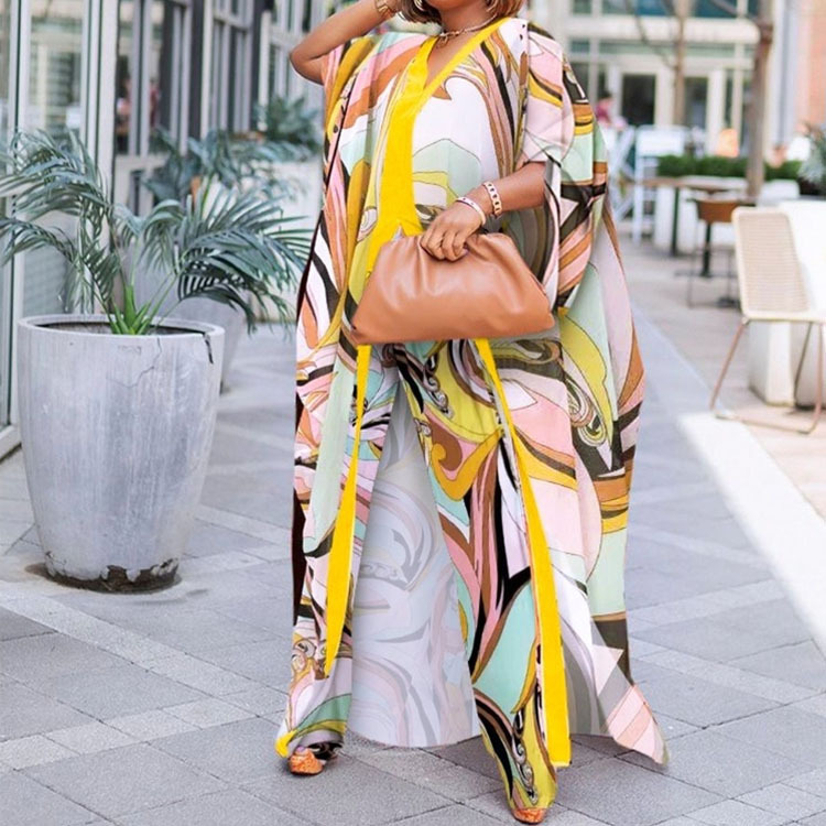 2023 유럽과 미국의 아마존 새로운 인쇄 쉬폰 카디건 V 넥 느슨한 플러스 사이즈 가운 바지 투피스 세트