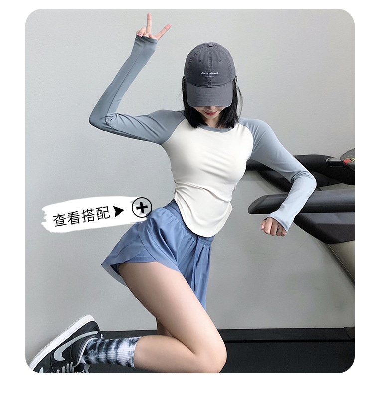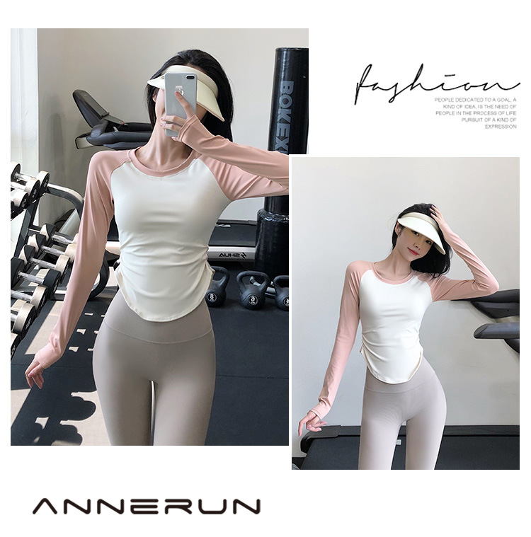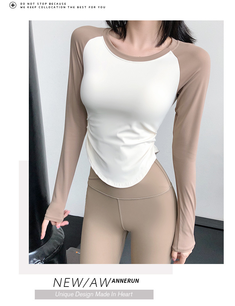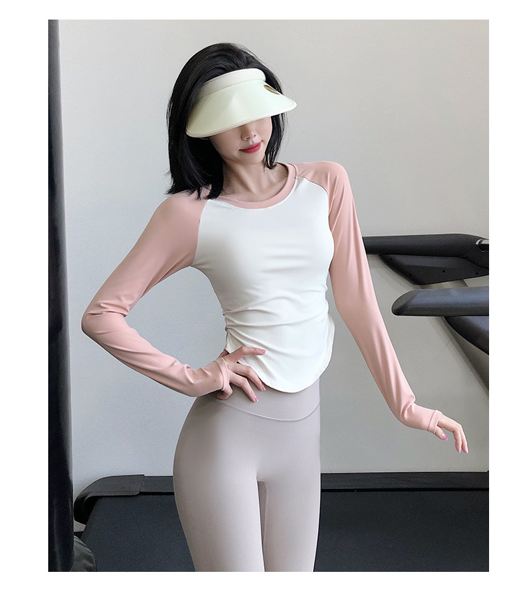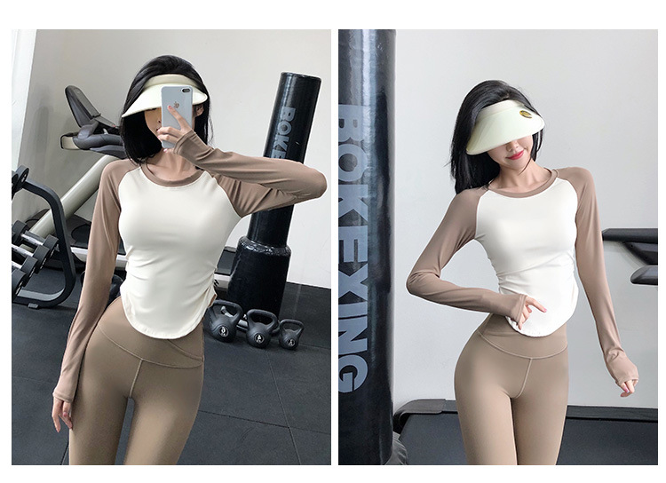 요가 의류 여성의 긴팔 주름 대비 색상 슬림 피트니스 러닝 티셔츠 알몸 높은 탄성 꽉 스포츠 의류 여성스토어 가기