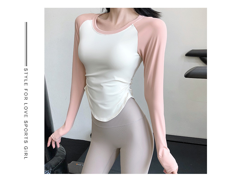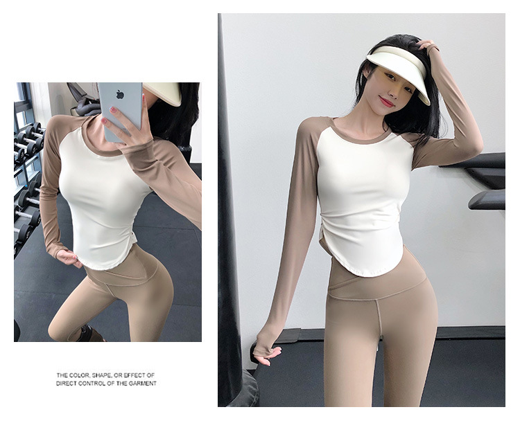 요가 의류 여성의 긴팔 주름 대비 색상 슬림 피트니스 러닝 티셔츠 알몸 높은 탄성 꽉 스포츠 의류 여성