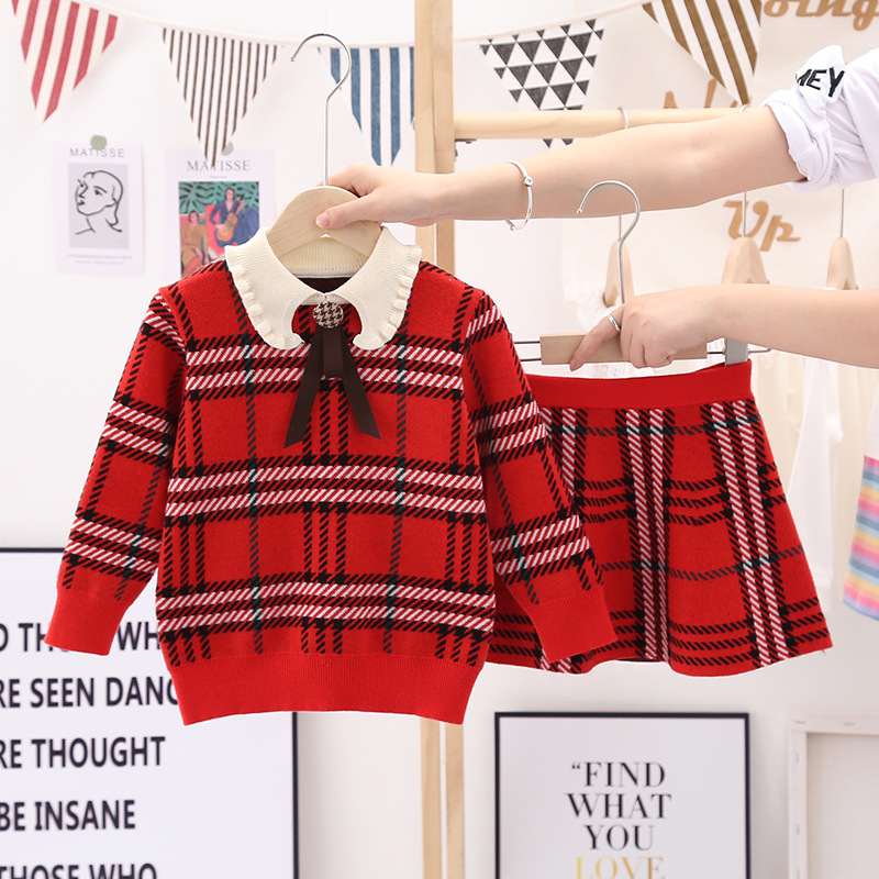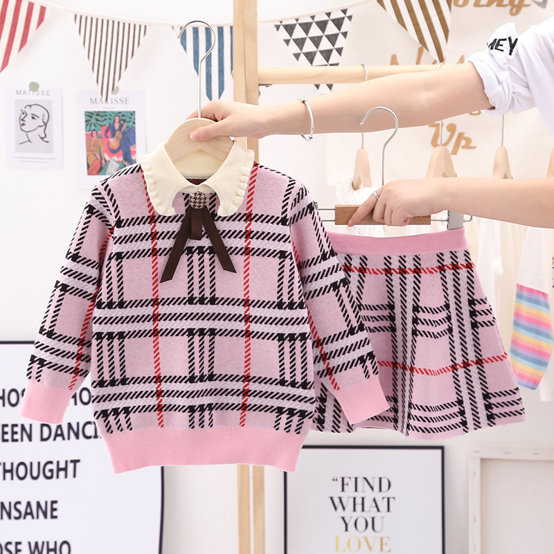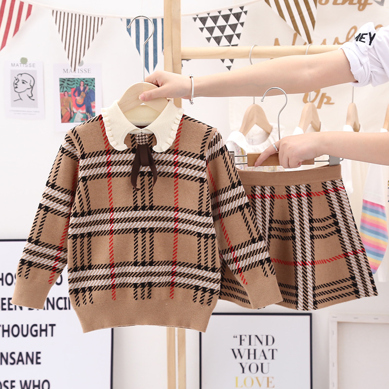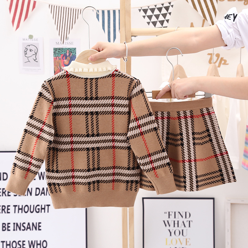 소녀의 가을 새 어린이 스웨터 세트 소녀의 격자 무늬 니트 스웨터 스커트 투피스 귀여운 중학교 옷스토어 가기