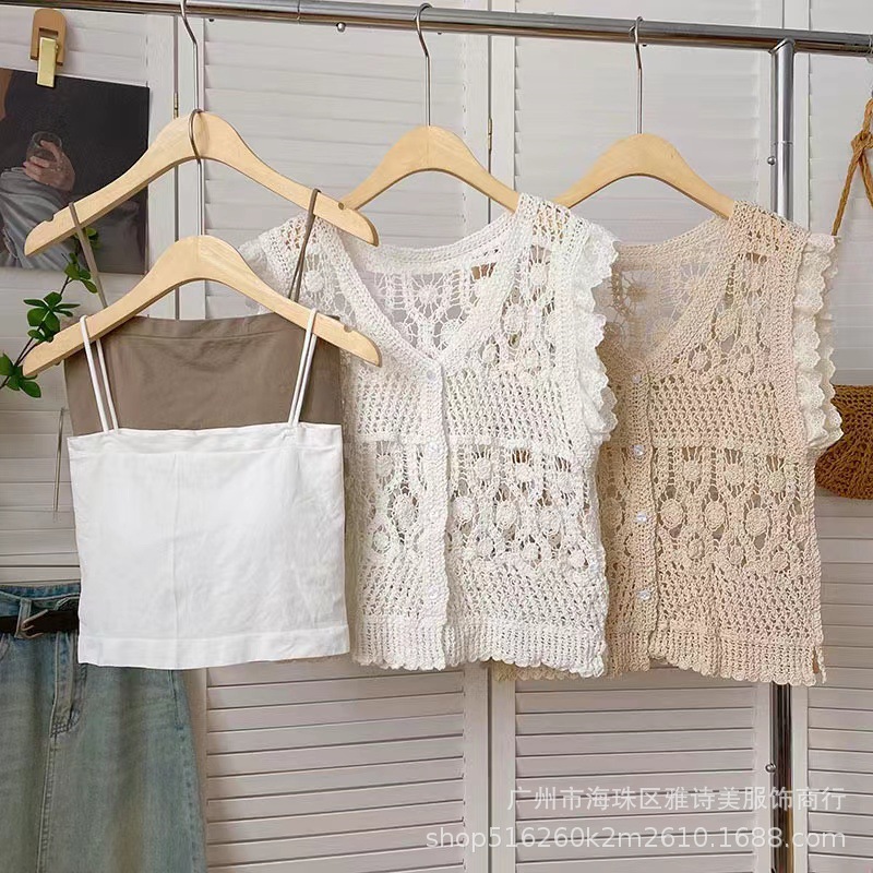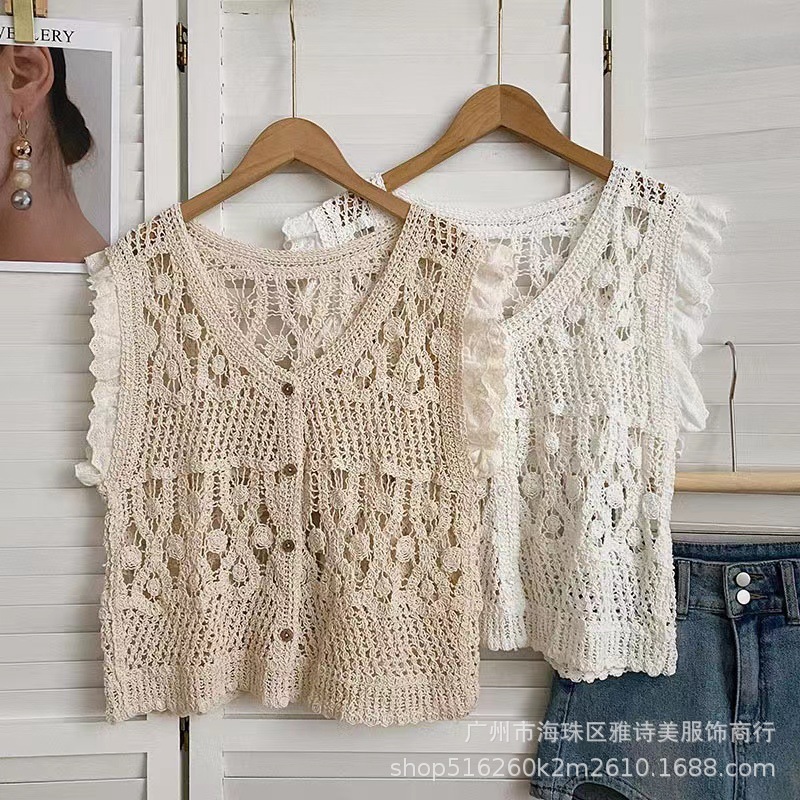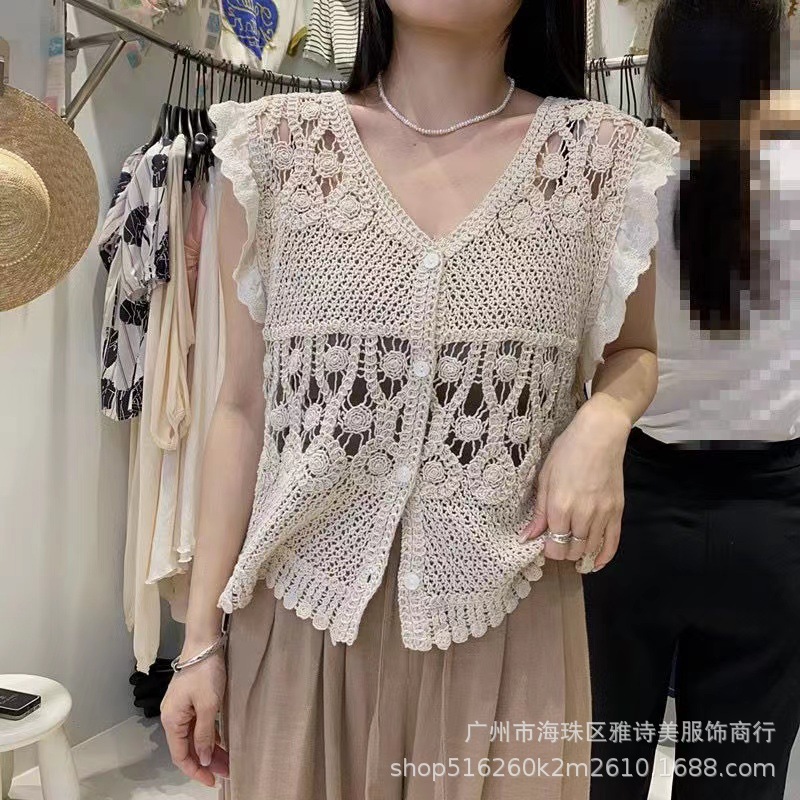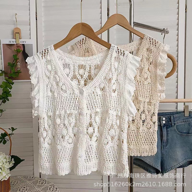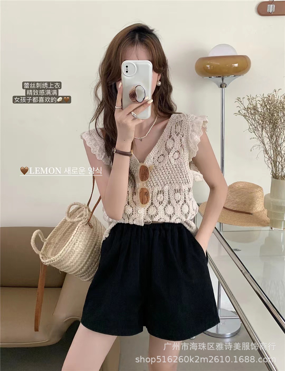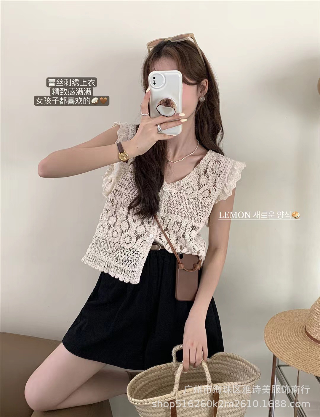 한국 스타일 틈새 우아한 V-넥 중공 조끼 여성용 여름 달콤한 비행 슬리브 모든 매치 느슨한 짧은 탑스토어 가기