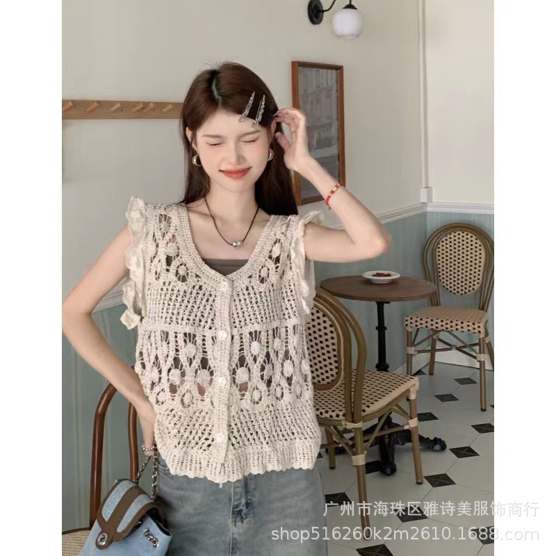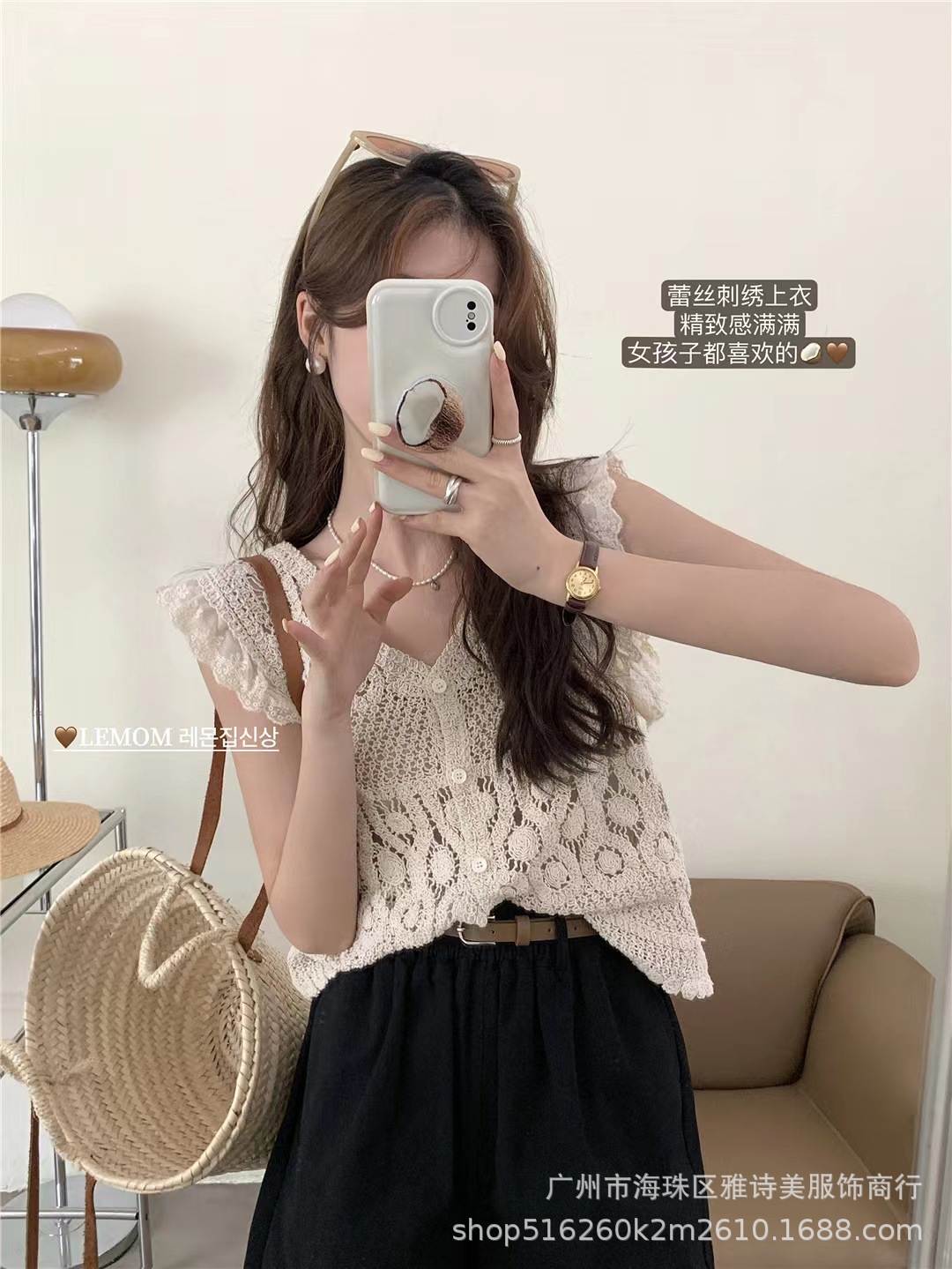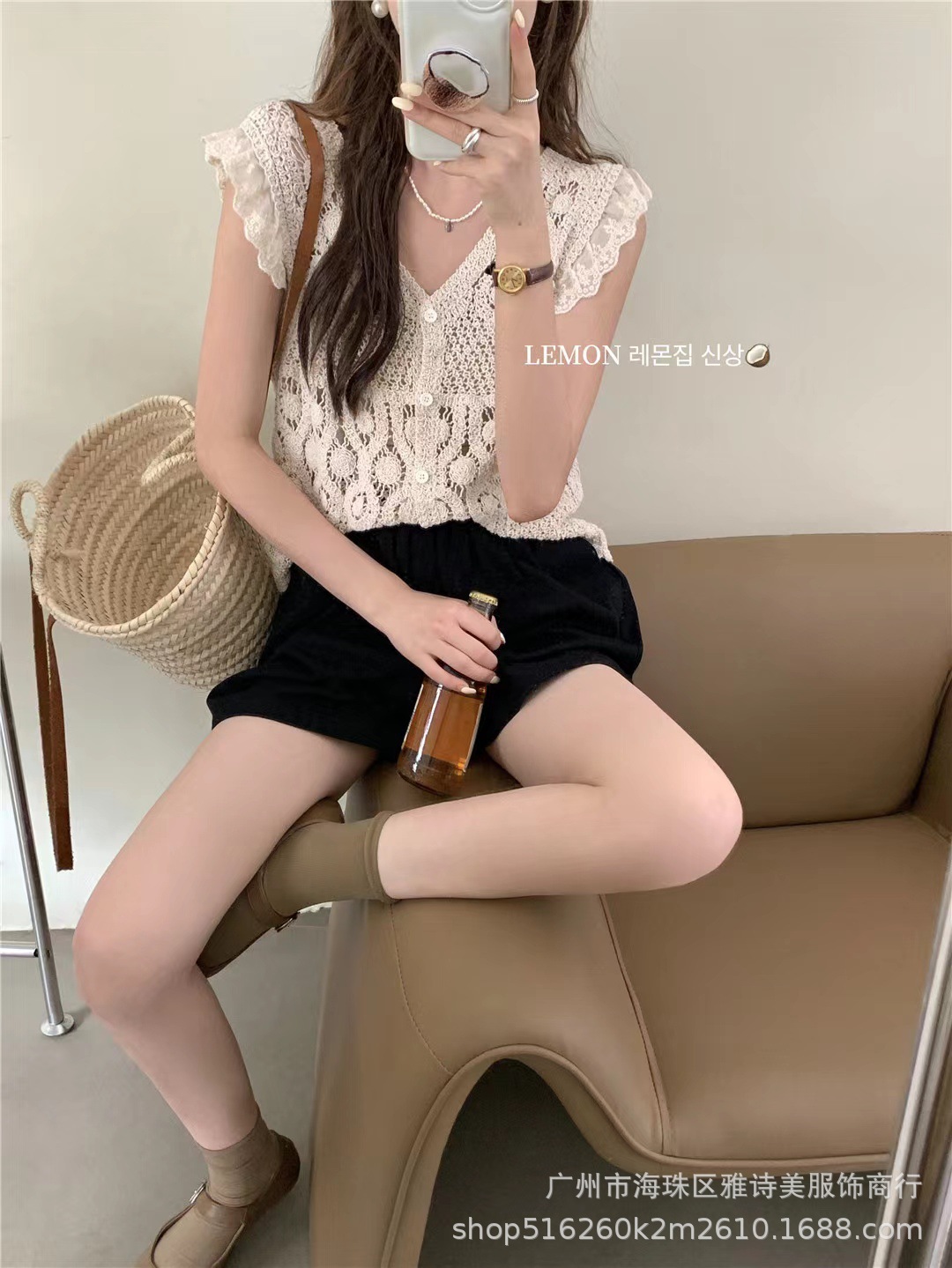 한국 스타일 틈새 우아한 V-넥 중공 조끼 여성용 여름 달콤한 비행 슬리브 모든 매치 느슨한 짧은 탑