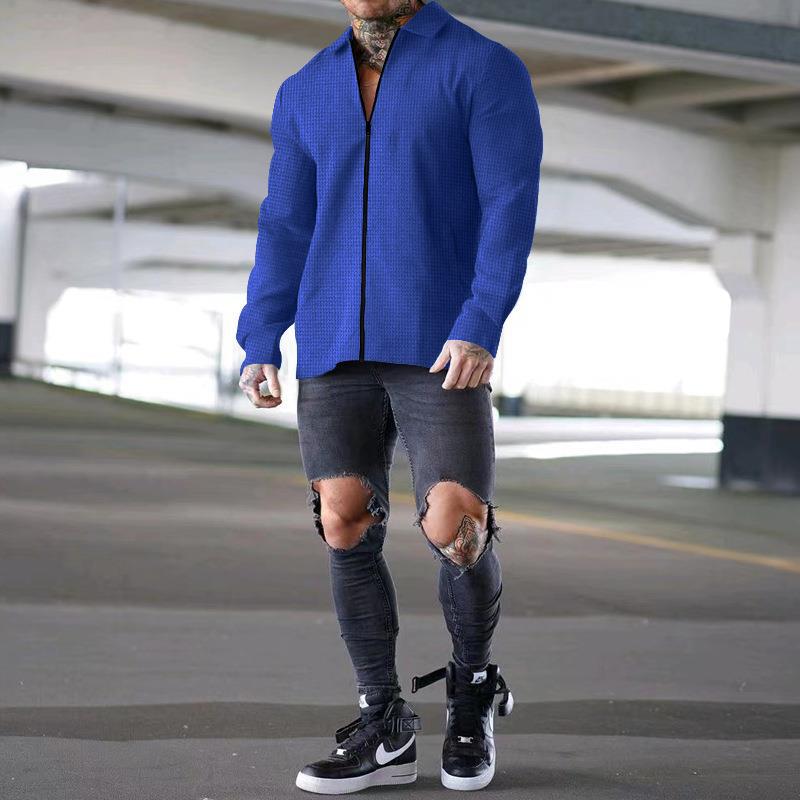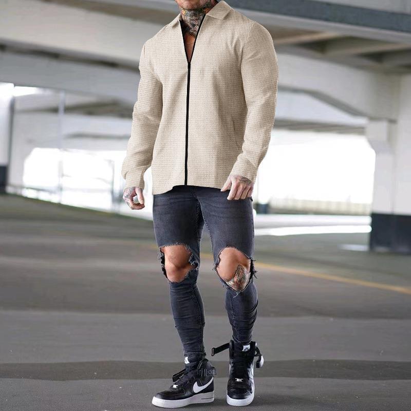 아마존 2023 여름 남성용 무거운 와플 단색 지퍼 긴 소매 재킷 남성 캐주얼 라펠 가디건